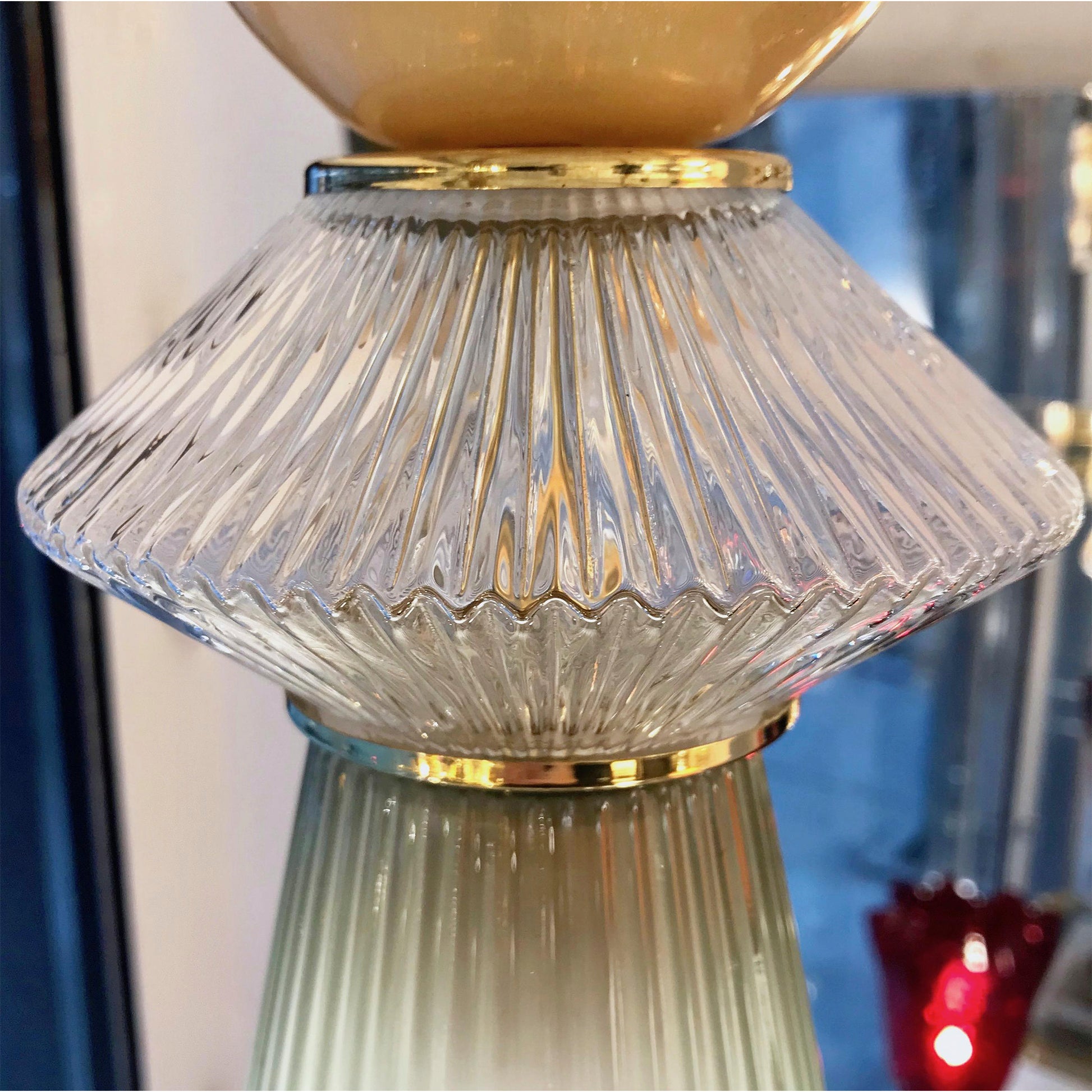 Fun and elegant bespoke contemporary Venetian pendant / chandelier, entirely handcrafted, of organic modern design consisting of brass accents and a succession of elements with flowing natural forms: black opaline glass and terracotta brown textured spheres, amber glass ball worked with pure gold, a hand cut jewel-like rock glass decoration, a saucer shaped mouth blown crystal Murano glass piece, a ribbed translucent green grey glass cone shade containing the light, on a brass pole with adjustable height. Ideal over a kitchen island or as spotlights over nightstands. Custom made pendants with similar Murano glass elements can be created also in different finishes, explore Cosulich Interiors collection.