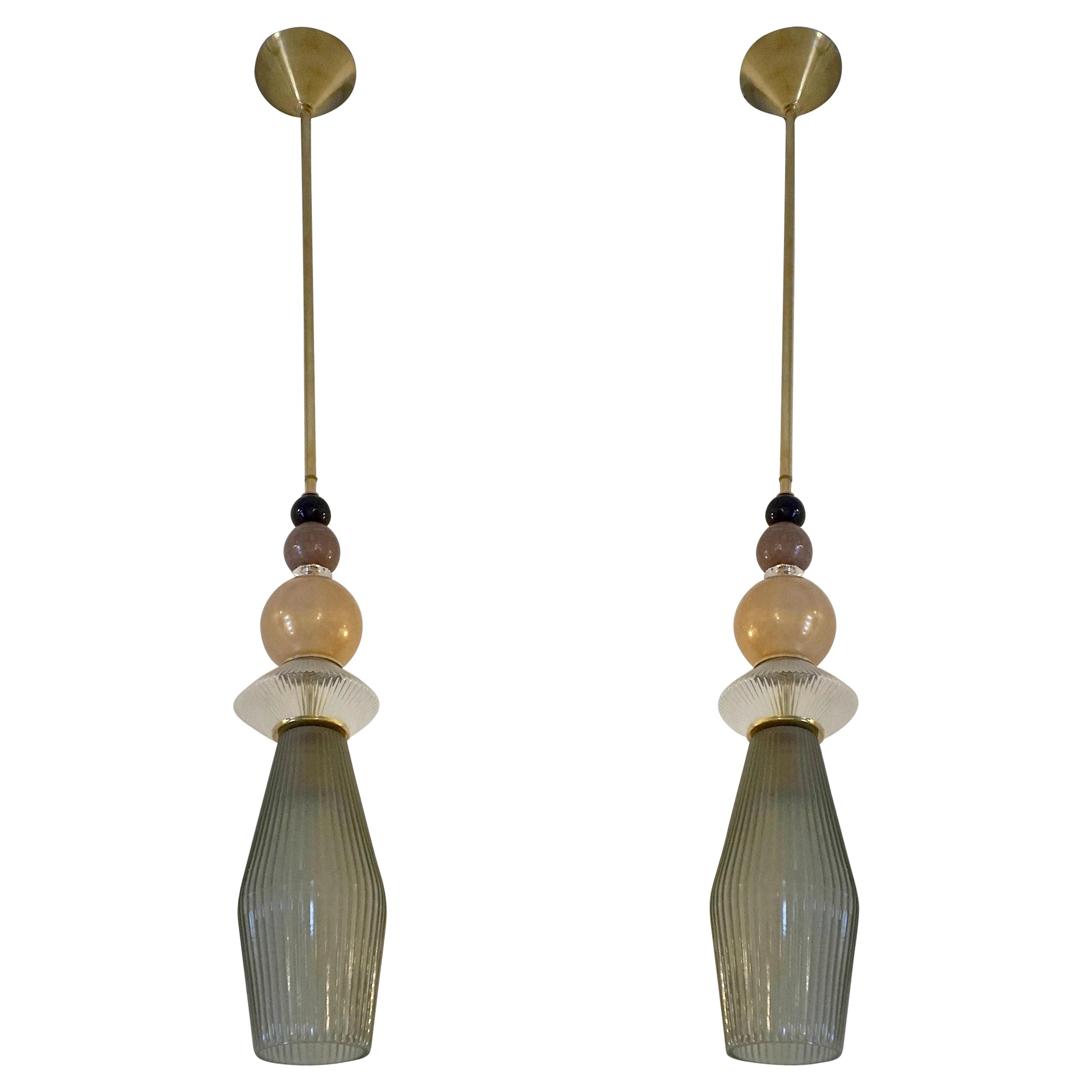 Custom Italian Crystal Gold and Gray Green Murano Glass Brass Pendant Light