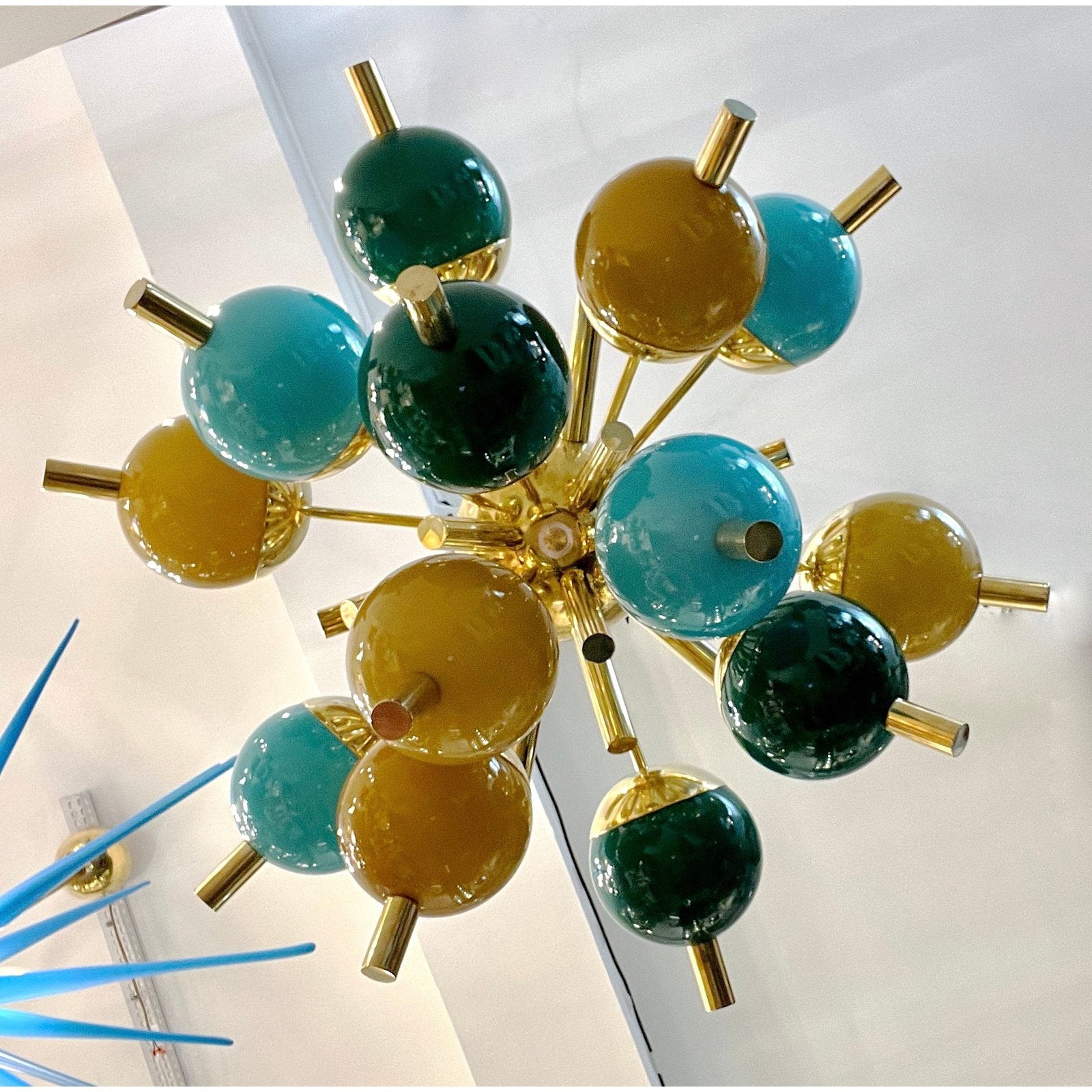 Who says that a small chandelier cannot be TOTAL FUN?! A bespoke contemporary thirteen-light Italian half sputnik fixture, with Mid-Century Modern design, entirely handmade in Italy, with a brass structure; gold brass rods are jutting out of a central half sphere in a starburst pattern, some shorter and some decorated with high quality blown Murano glass overlayed spheres, in rich organic colors, turquoise, amber gold, dark bottle green, with white interior, each containing a light source that brings out the white luminescence. The size makes it ideal to bring a unique accent in any small space.