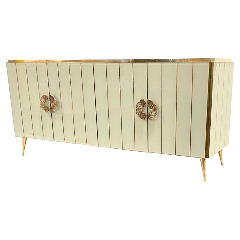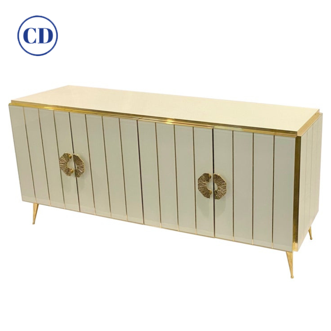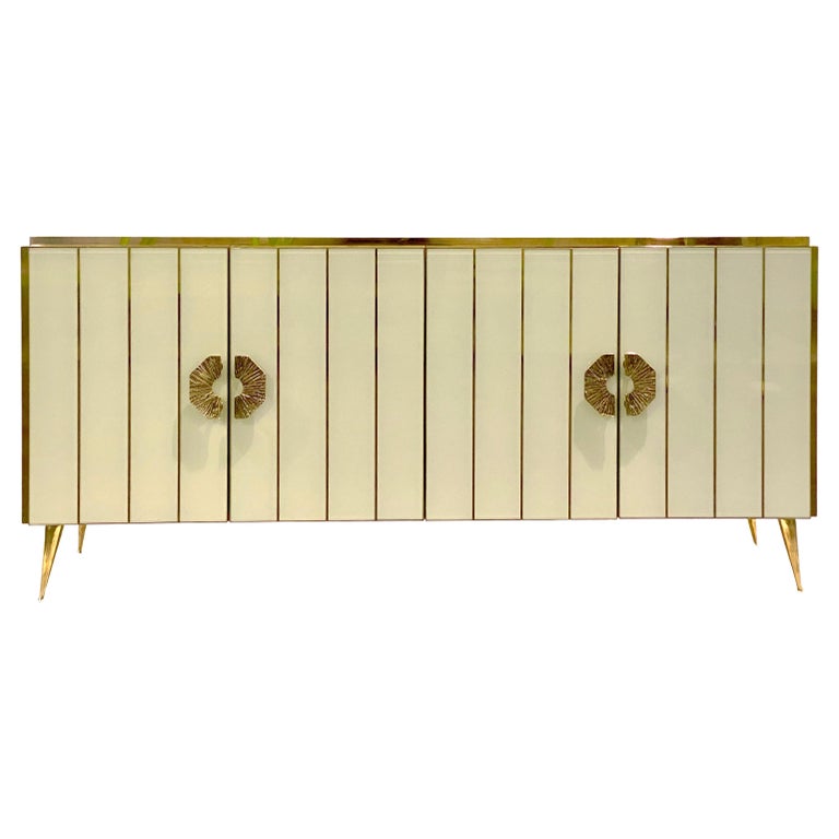 Bespoke customizable 4-door console credenza/sideboard entirely handcrafted in Italy with elegant Art Deco style and Hollywood Regency glam, the surround decorated with art glass in an elegant ivory cream, striped with brass inserts, raised on splayed brass legs, with unique geometric handles individually hand made in engraved cast metal.