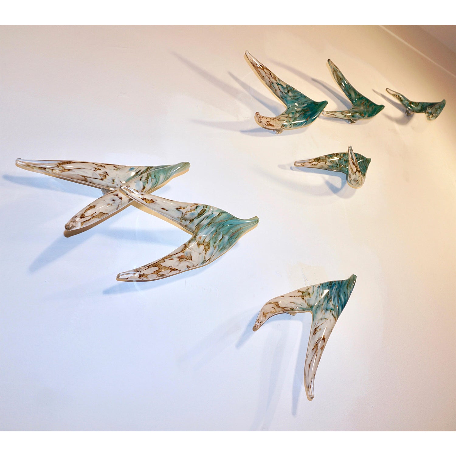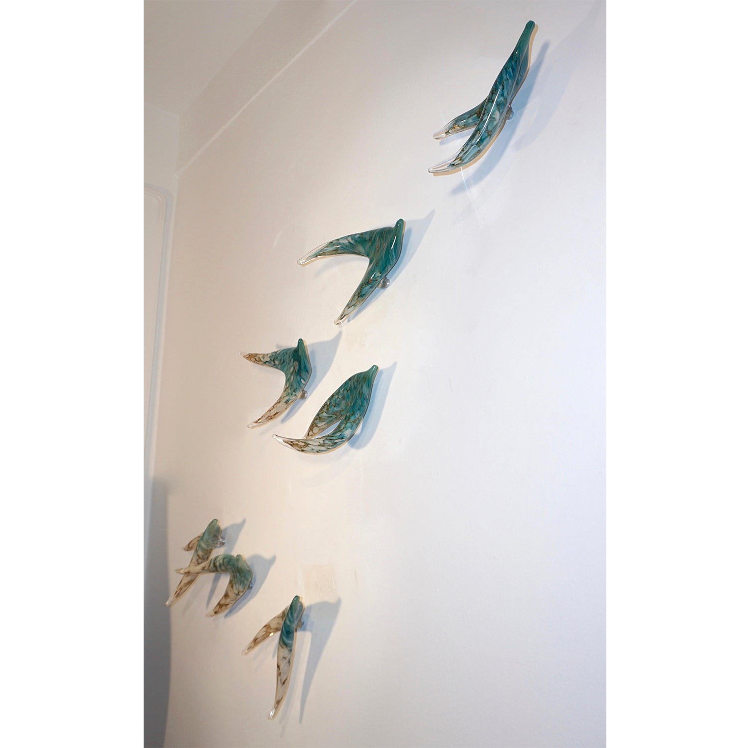 Flight of Aquamarine Birds Contemporary Blown Glass Modern Art Wall Sculpture