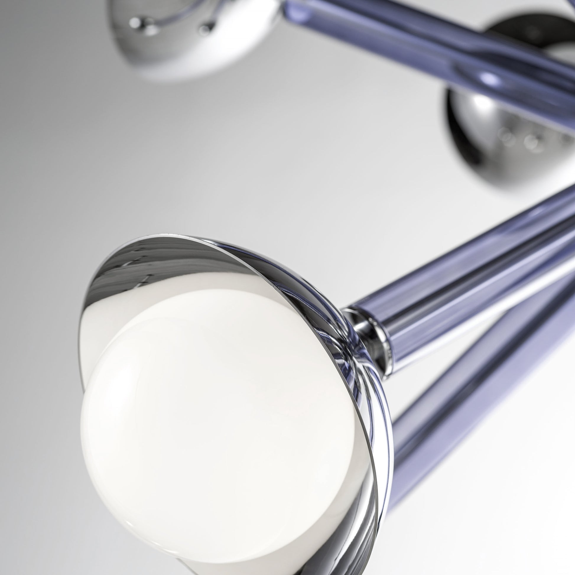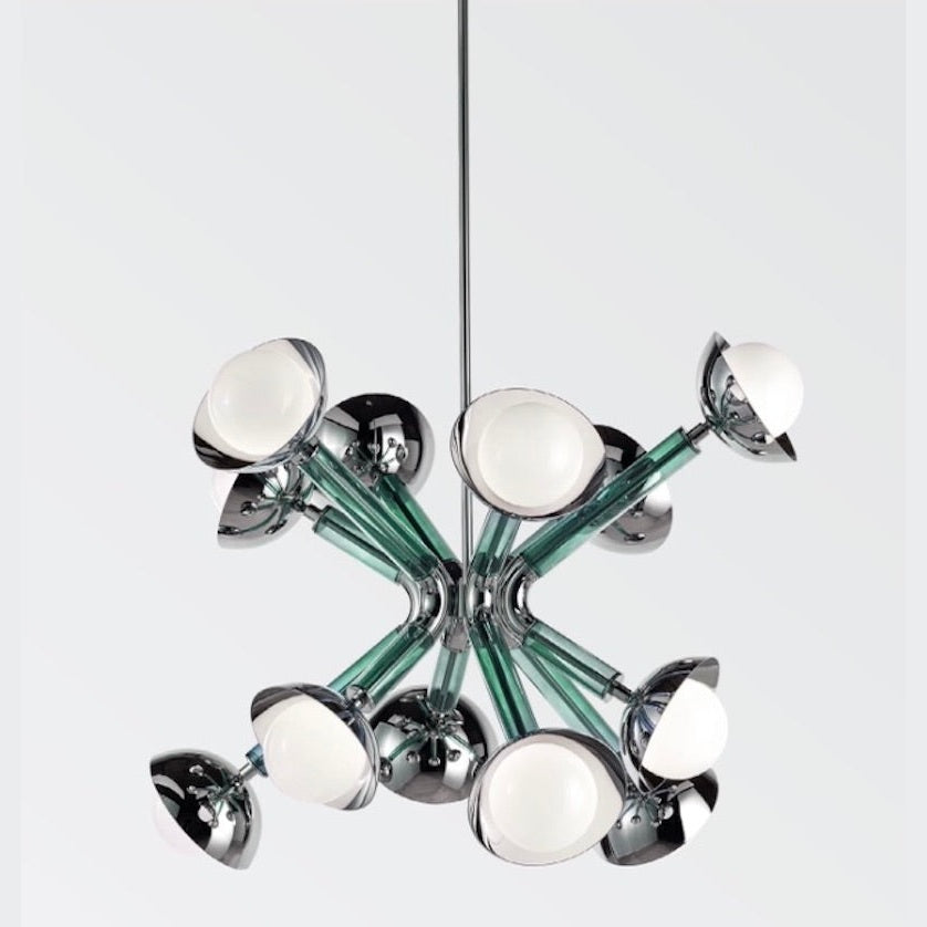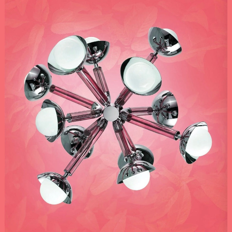 This chandelier, called Stimma, designed and entirely crafted in Italy, doesn't come from an atomic inspiration but a naturalistic interpretation. The central round core supports 8 jutting metal arms encased in transparent purple violet blue tinted glass, ending in an adjustable cup supporting a blown white glass sphere, containing the light source. Designed by De Bona and De Meo, its voice is a naturalistic definition: the natural impulse of spring blooms in an explosion of matter, color, and energy.