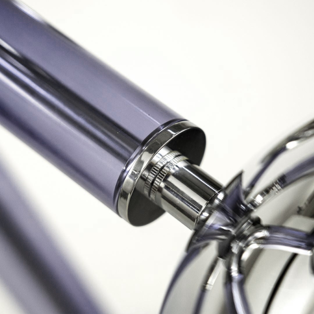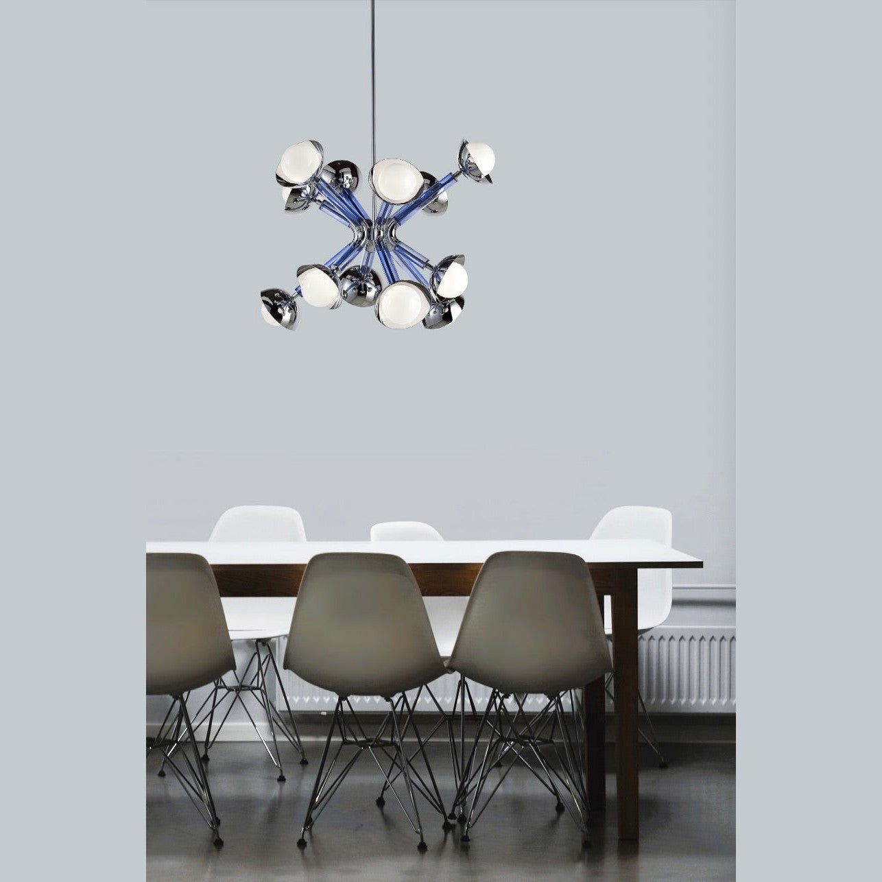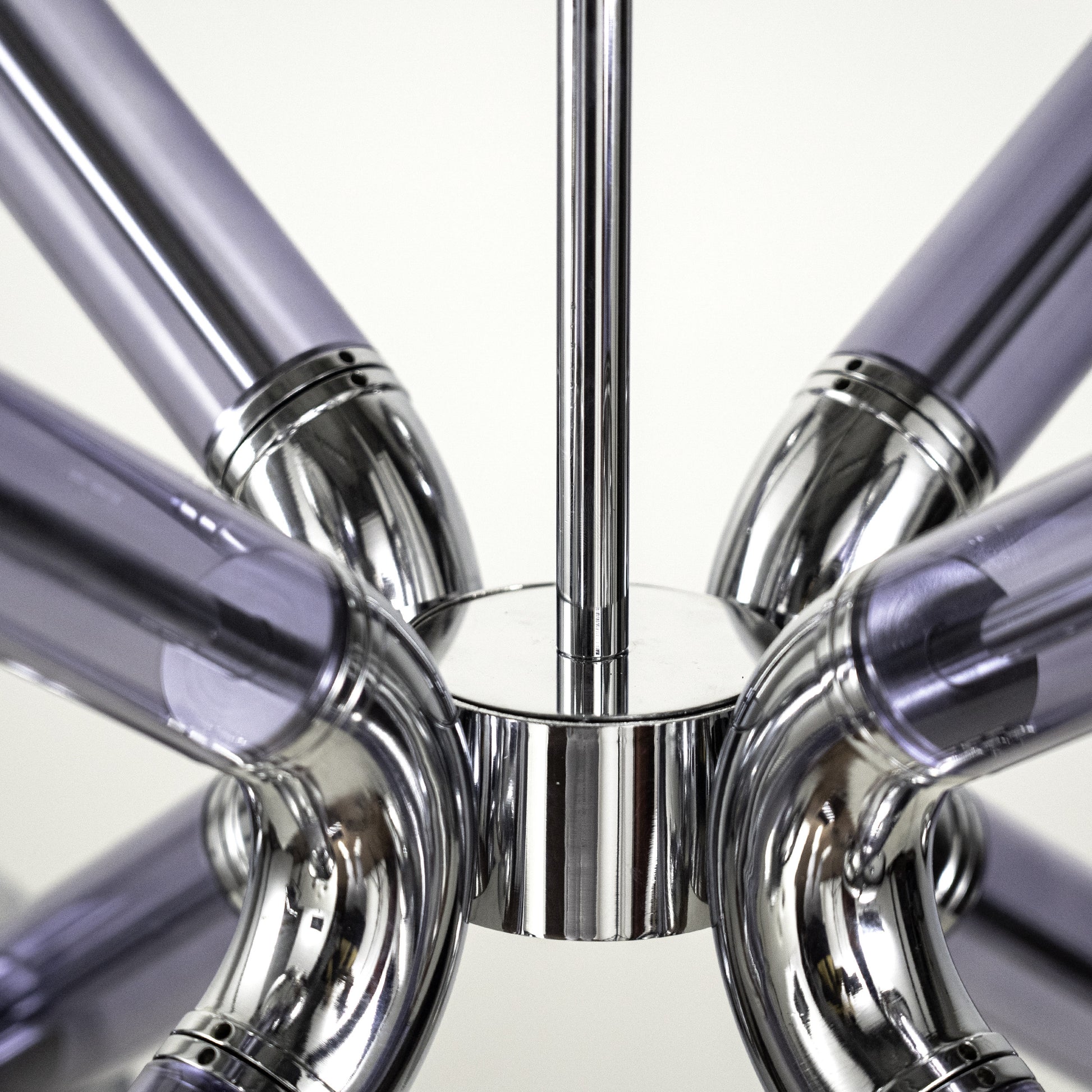 This chandelier, called Stimma, designed and entirely crafted in Italy, doesn't come from an atomic inspiration but a naturalistic interpretation. The central round core supports 8 jutting metal arms encased in transparent purple violet blue tinted glass, ending in an adjustable cup supporting a blown white glass sphere, containing the light source. Designed by De Bona and De Meo, its voice is a naturalistic definition: the natural impulse of spring blooms in an explosion of matter, color, and energy.