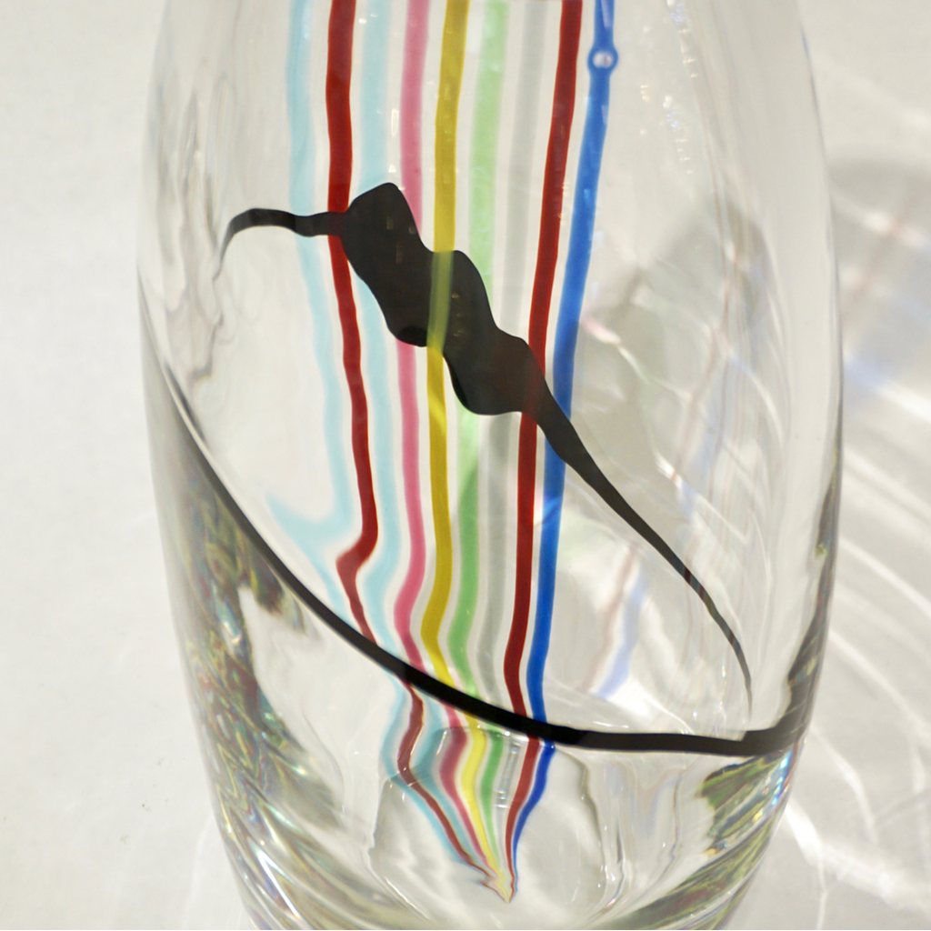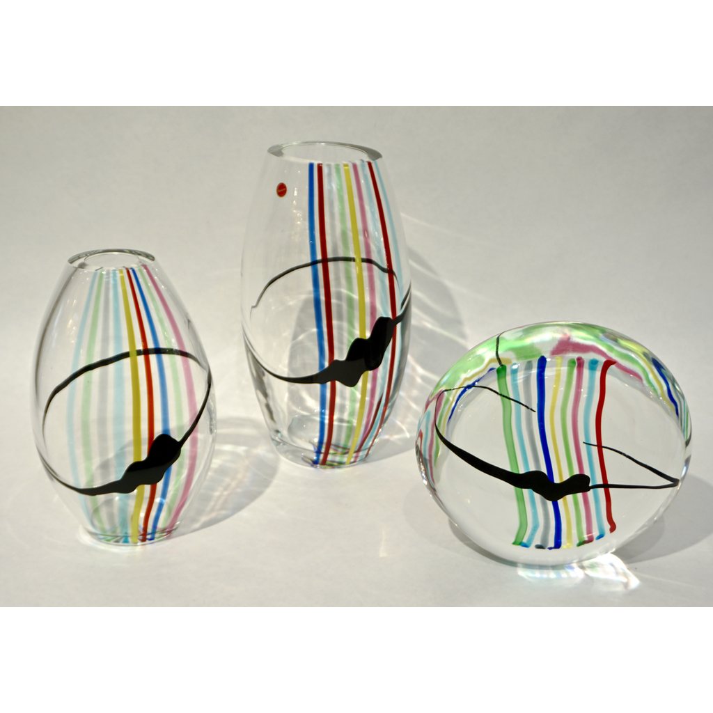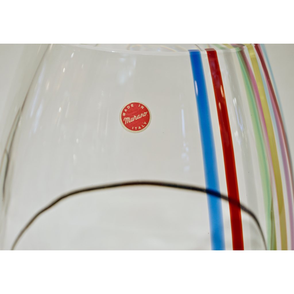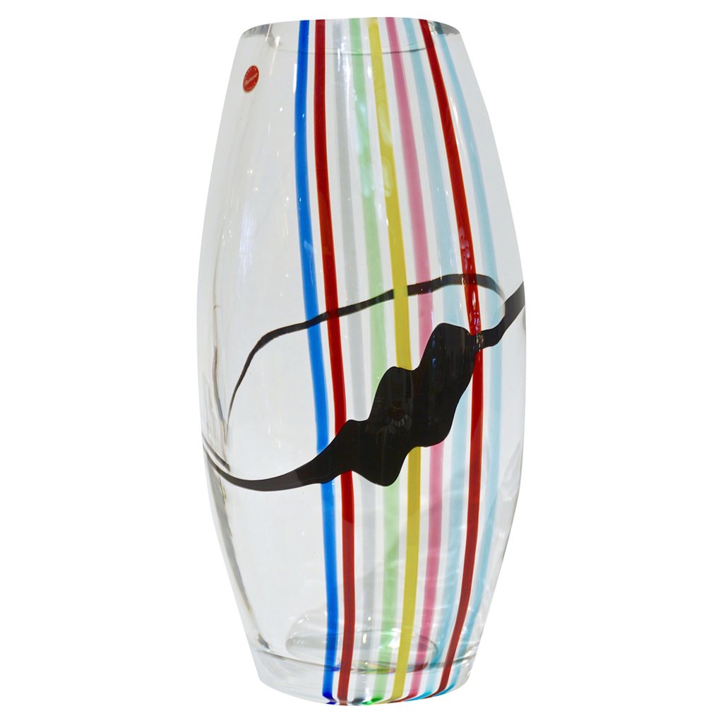 Formia 1970s vintage Italian modern design vase or centerpiece of organic ovoid shape, in blown crystal clear Murano glass decorated with rainbow stripes in red, aqua blue, pink, apple green, yellow, dark blue, grey and freeform black stroke like a modern Pop Art painting. On display at our NYDC Showroom. Ideal as a gift, for Mother's Day or Valentine.
