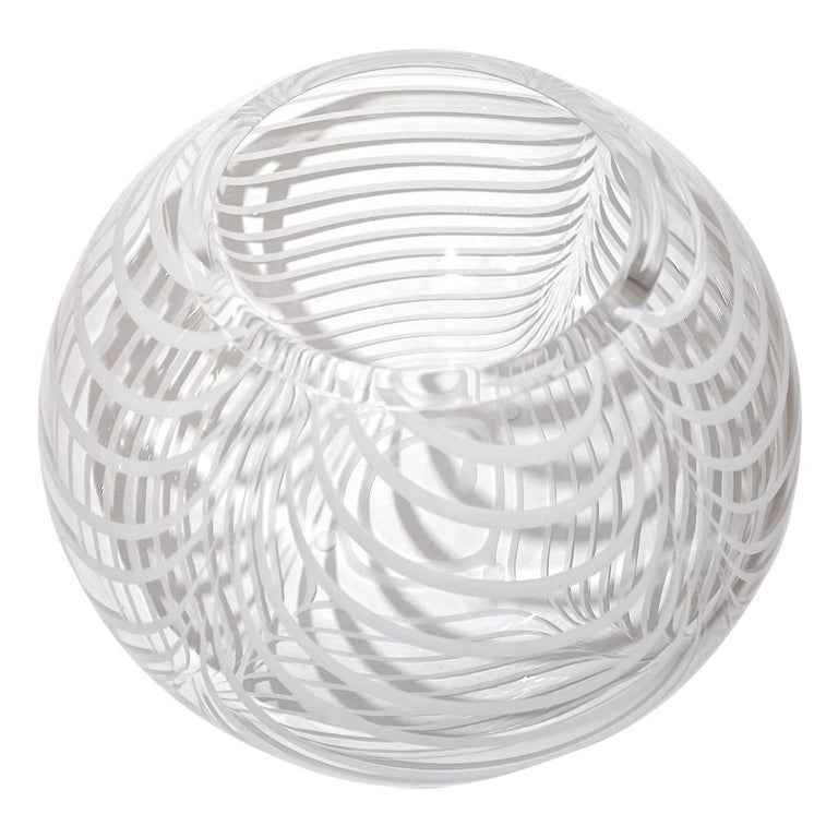 1970s elegant Minimalist creation signed Formia Murano, crystal clear blown Murano glass bowl/vase decorated with white Festoons, and organic decoration called Fenicio. This heated decor technique consists in applying vitreous threads of Murano glass to the incandescent body in a festoon-like wavy design using a special comb-shaped tool to achieve a feather or ribbon effect.