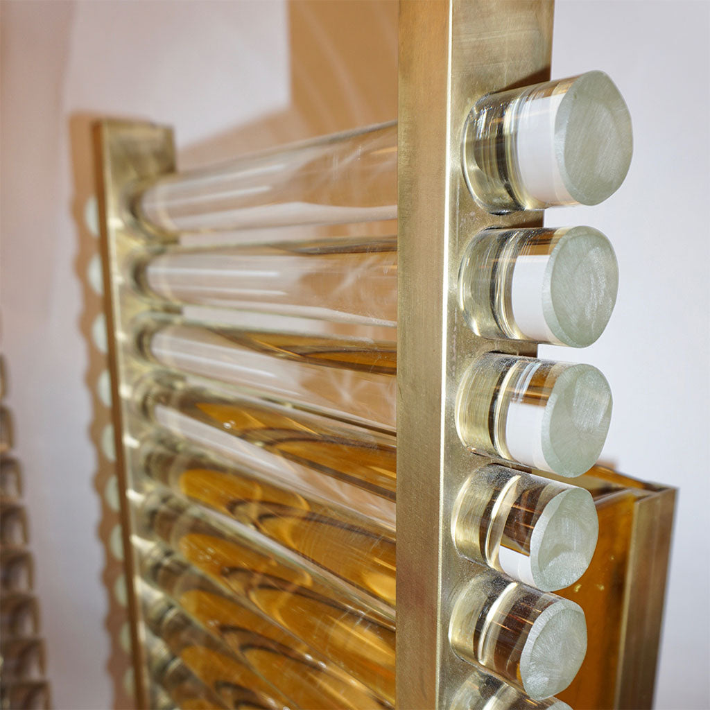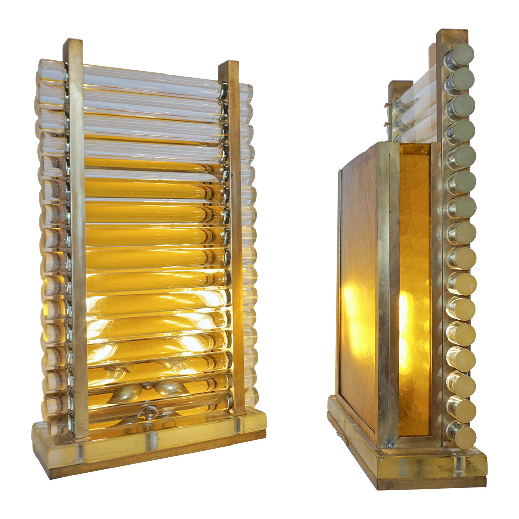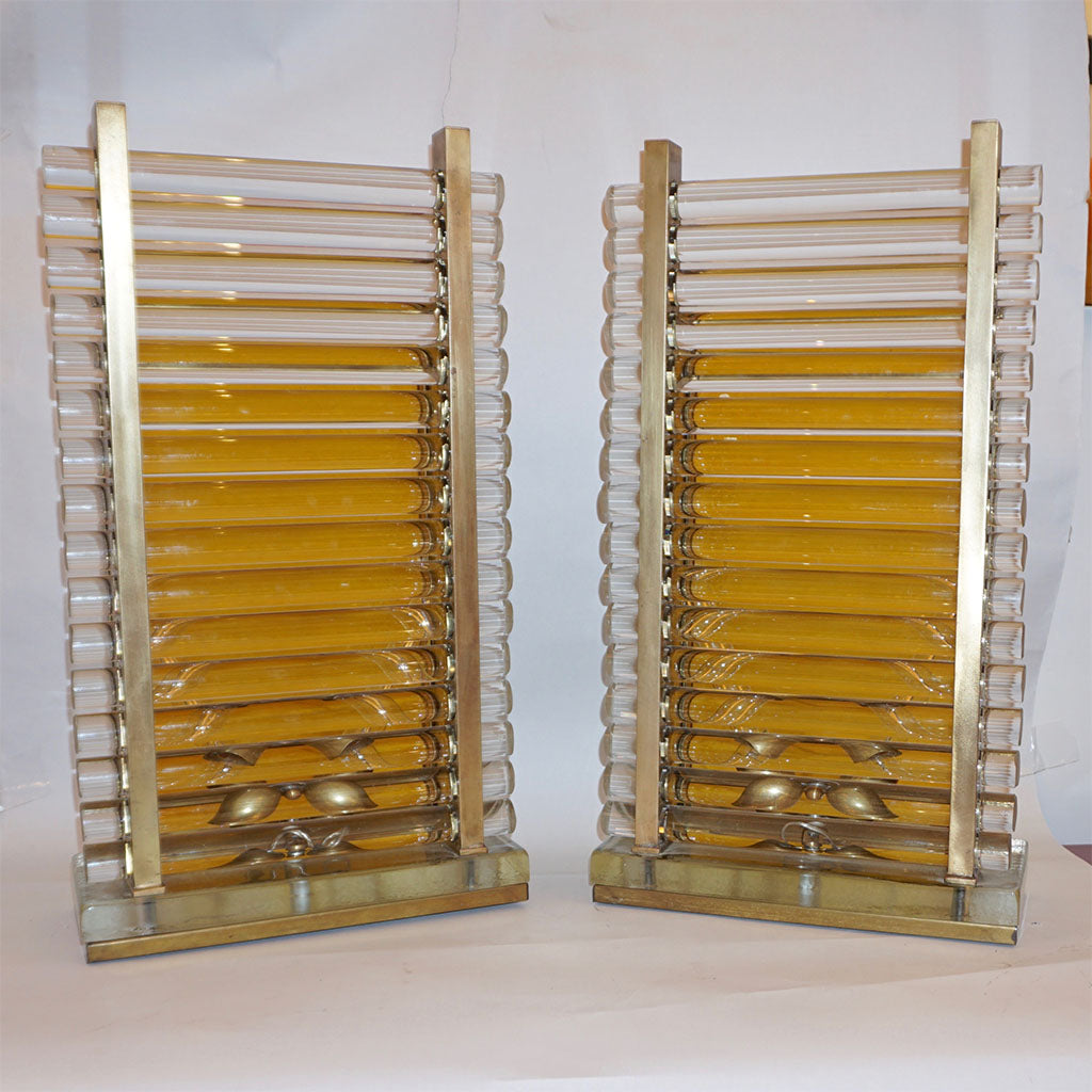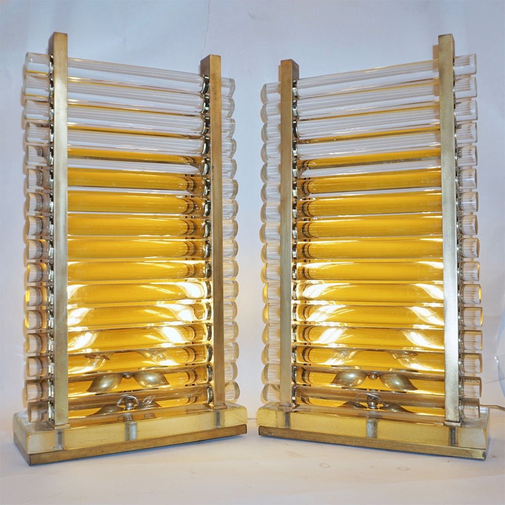 Vintage exceptional one-of-a-kind Italian pair of mid century modern architectural sculpture table lamps, entirely handcrafted: the very stylish unique design of sculpture abstraction, that recalls the style of Gabriella Crespi, consists of a series of high quality crystal clear glass round tubes individually mounted in a brass structure surrounded by a textured frosted amber Murano glass also at the back so that the lamps can be admired from all sides and with a different perspective. Raised on hand made geometric rectangular brass bases decorated with thick rock glass.