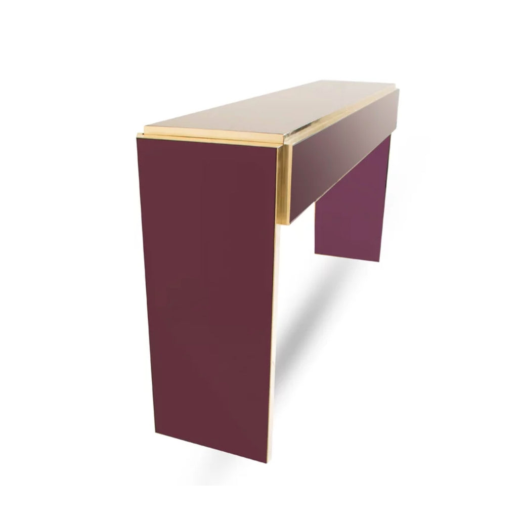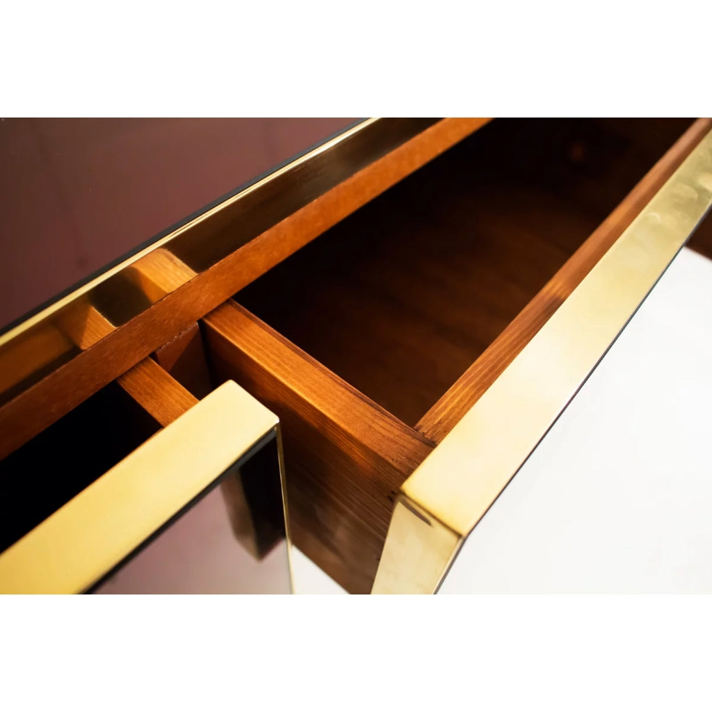 However, this design, entirely handcrafted in Italy, with a minimalist Art Deco style and the surround decorated with glass, can be produced in custom colors from the RAL classic color chart. This console, raised on continuous straight sides that serve as legs, can be displayed in a central position with its refinished 4 sides. High quality of execution with great attention to detail, the whole body and drawers exquisitely edged with brass profiles. A versatile and functional design that can be personalized in glass colors, finishes, and sizes, such as a sideboard, credenza, nightstands, console...