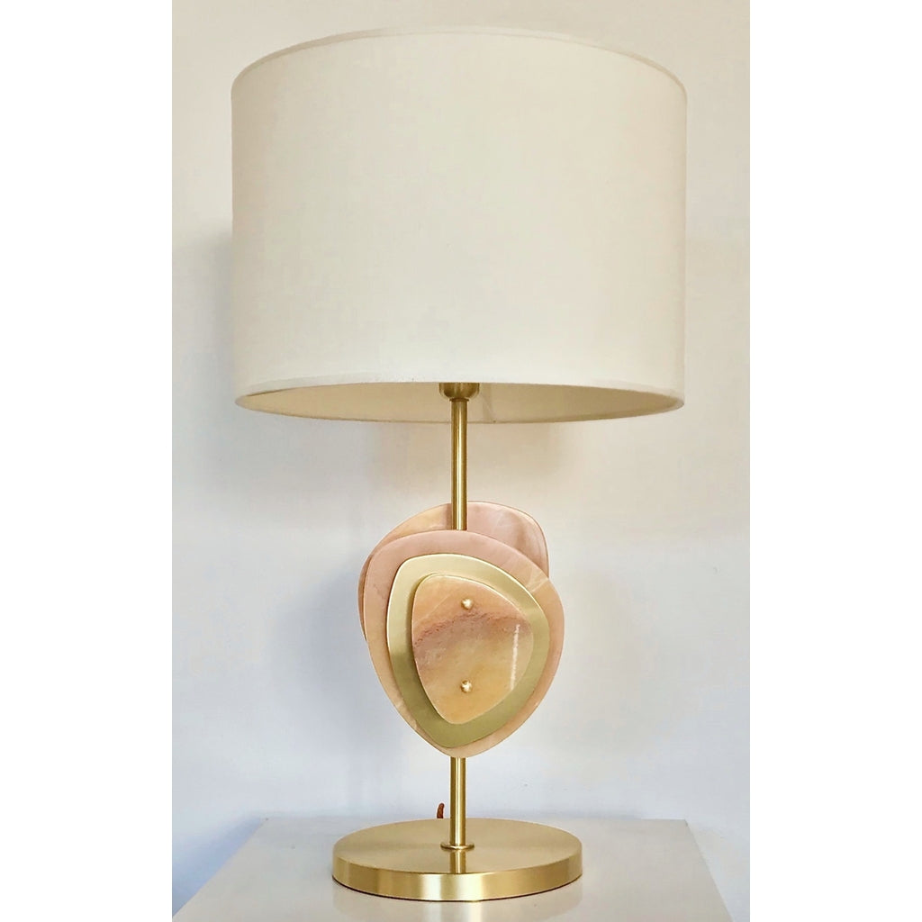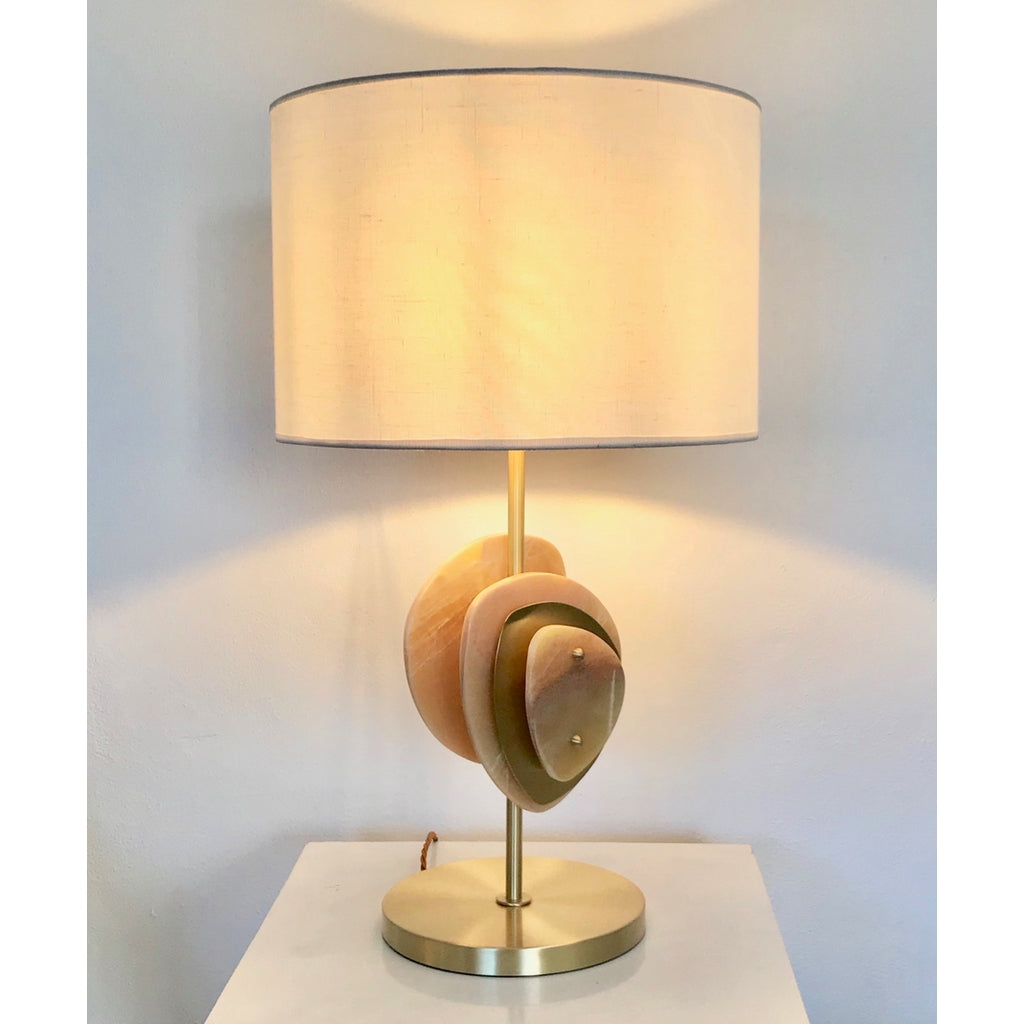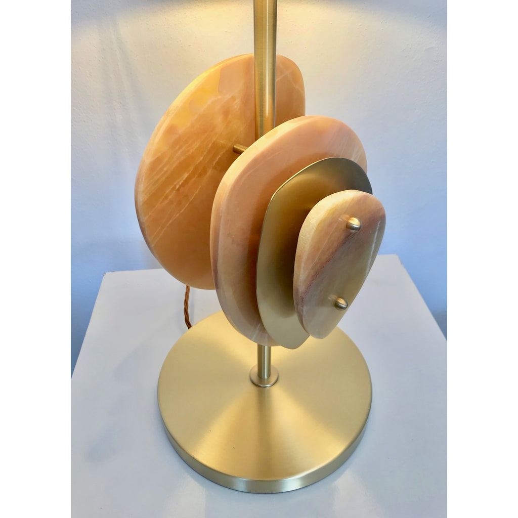 903PBAvailable Now - Italian contemporary honey onyx and satin brass table lamp called Satellite, entirely handcrafted in Italy. This organic modern design is inspired by nature, earth and water, with a combination of hand cut flat curved elements in stone and brass interspersed with dimensional spacing. The color of the stone accompanied by the gold metal ranges from tints of orange to tan yellow with crystalline white veins. This sculpture piece works as a stand alone lamp for a side table, functional and versatile for reading or ambience, or to add flair above a sideboard, to enhance an entryway mirror or a bathroom. Customizations available upon request for stones and metal finishes.