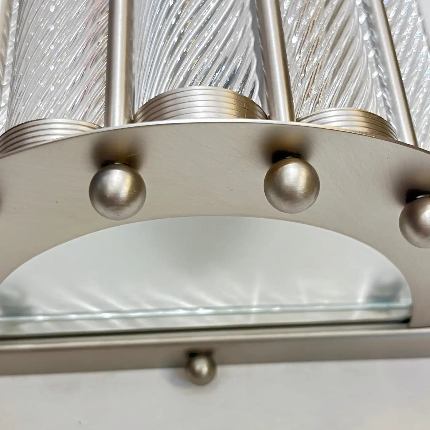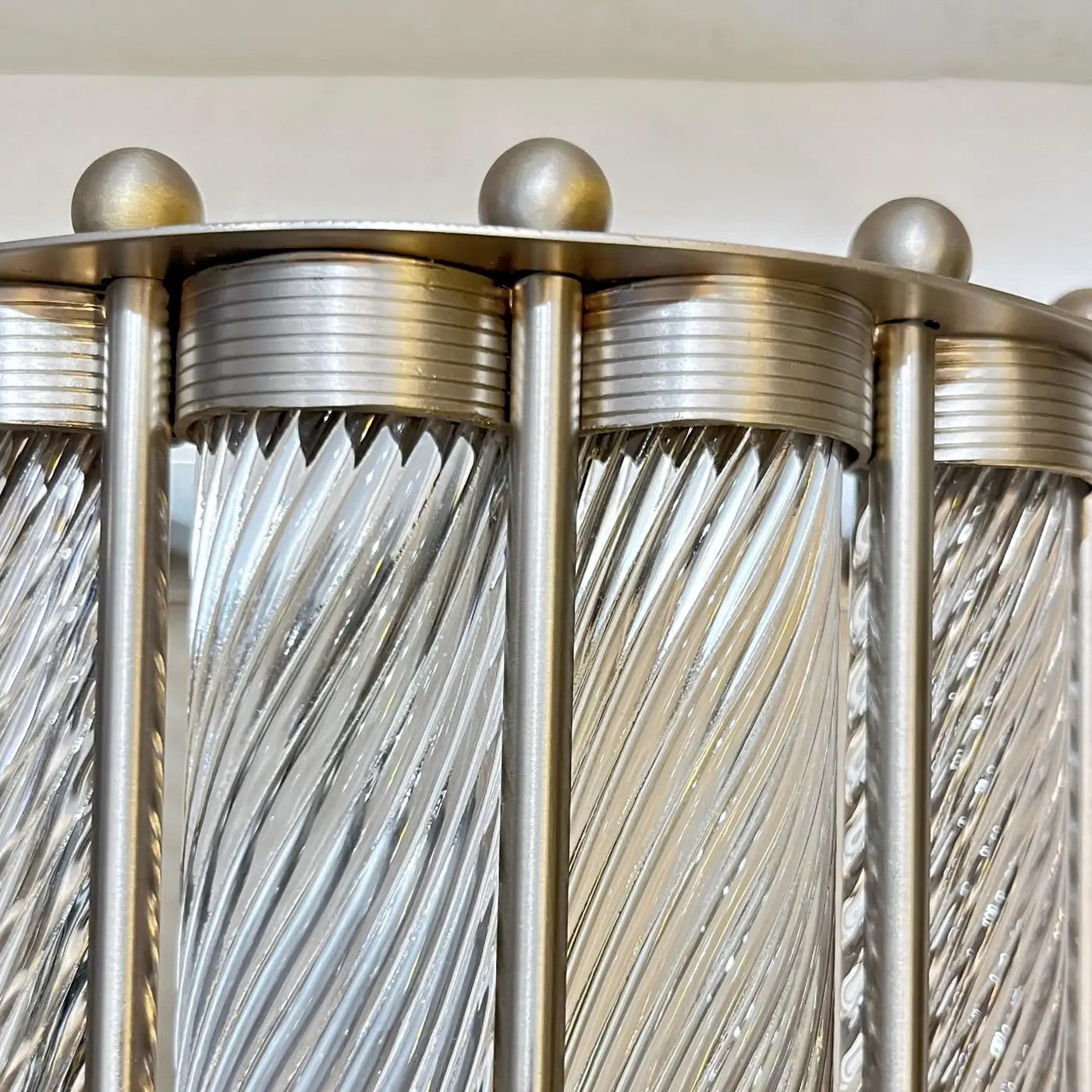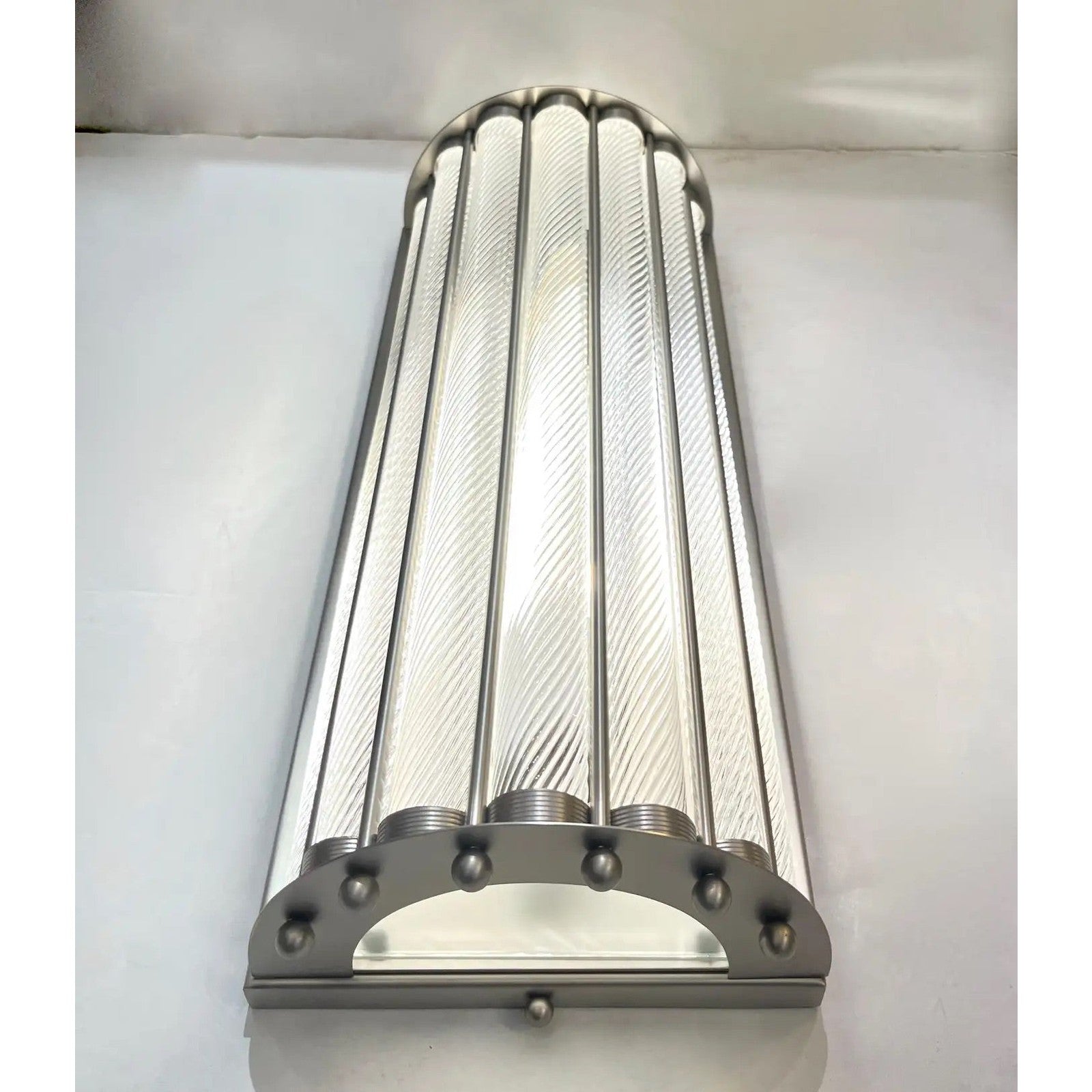 Contemporary customizable Italian Art Deco Design pair of semi-circular wall lights, entirely handcrafted, with a satin nickel finish, exclusive design by Cosulich Interiors & Antiques. The nicely scalloped airy structure supports crystal clear Murano glass rods worked with the sophisticated technique Torchon, handcrafted twisted glass, that not only makes the fixture more precious but multiplies the light reflections. This can also be ordered to hang horizontal or as a flush mount.
