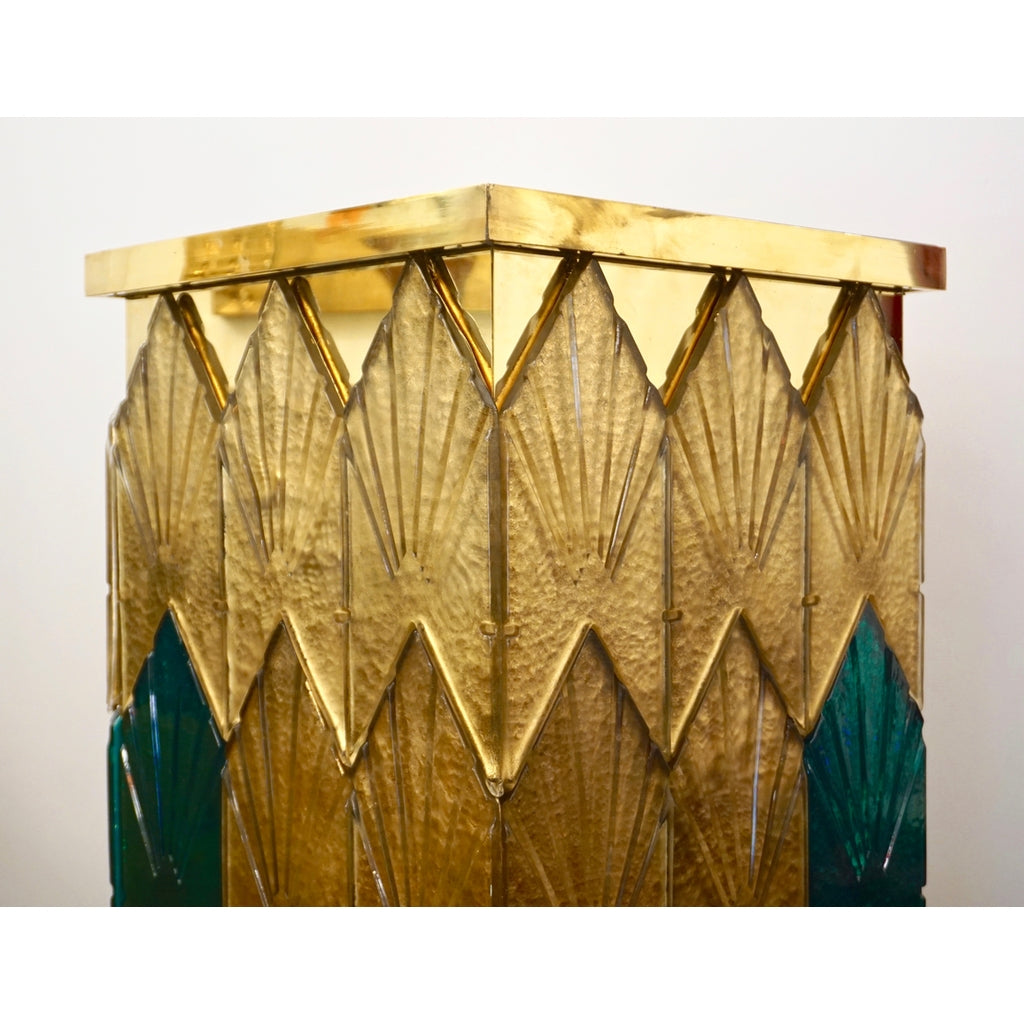 A pair of contemporary exclusive columns, entirely handmade in Italy combining a modern style with high-quality craftsmanship and rich materials: the plinths in handcrafted wood are covered in brass, as the tops and bases, and decorated in relief with precious interlocking textured Murano glass tiles in emerald green and amber gold with a typical Art Deco geometric herringbone pattern. Can be purchased individually. Base dimensions: 18.75 in x 18.75 in.