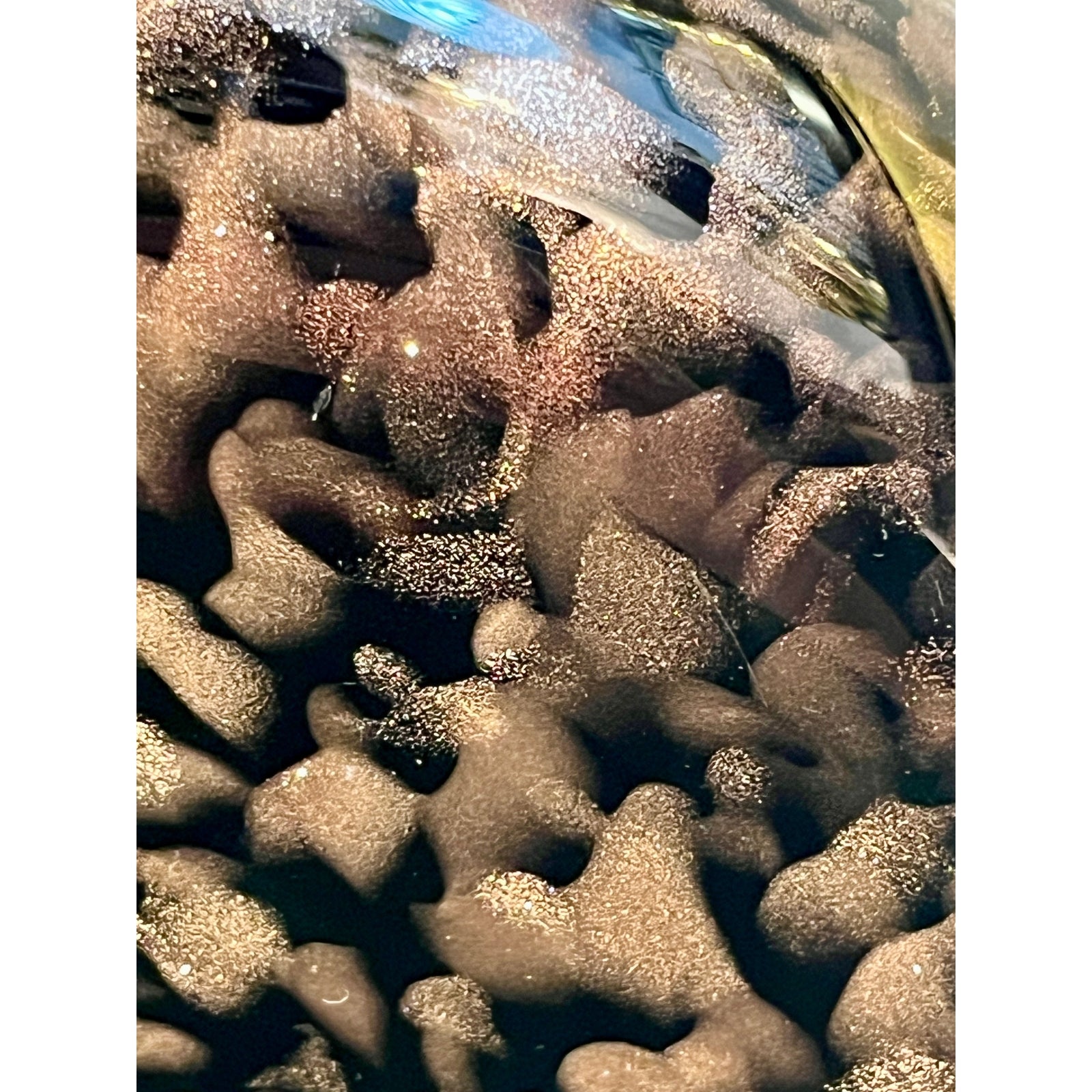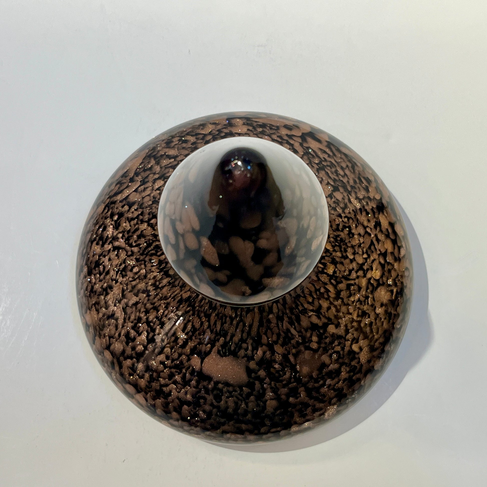 This is a little jewel! This large decorative Art piece in blown Murano glass is realized with high-quality technique: the black round spherical body of the bottle and the stopper are extensively overlaid with crystal transparent glass and decorated with avventurina inclusions in its core, the metallic gold/copper you can see in transparency.