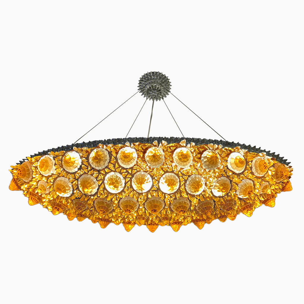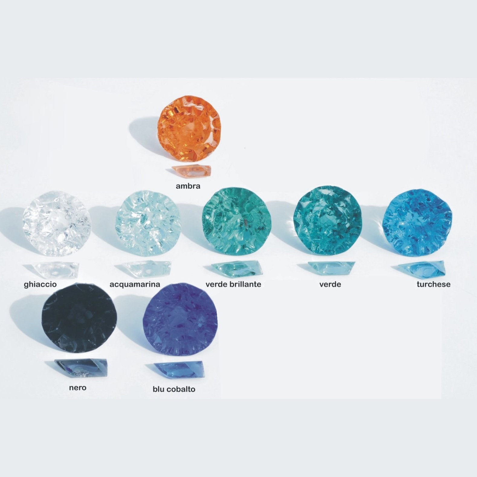 A jewel-like Italian oval pendant or flush mount chandelier, Work of Art sculpture, entirely handcrafted, the sophisticated organic decoration is composed of hand-cut rock glass diamond elements of different sizes set in a hand-cast iron frame painted in silver, highlighted with hand-cut clear crystal slivers in relief. The multi-facets reflect so much light that, when lit, the lighting fixture changes colors into sparkling crystal and aquamarine azure colors. The height of the metal cables can be adjusted so that this light fixture can be either flush mounted or pendant.
