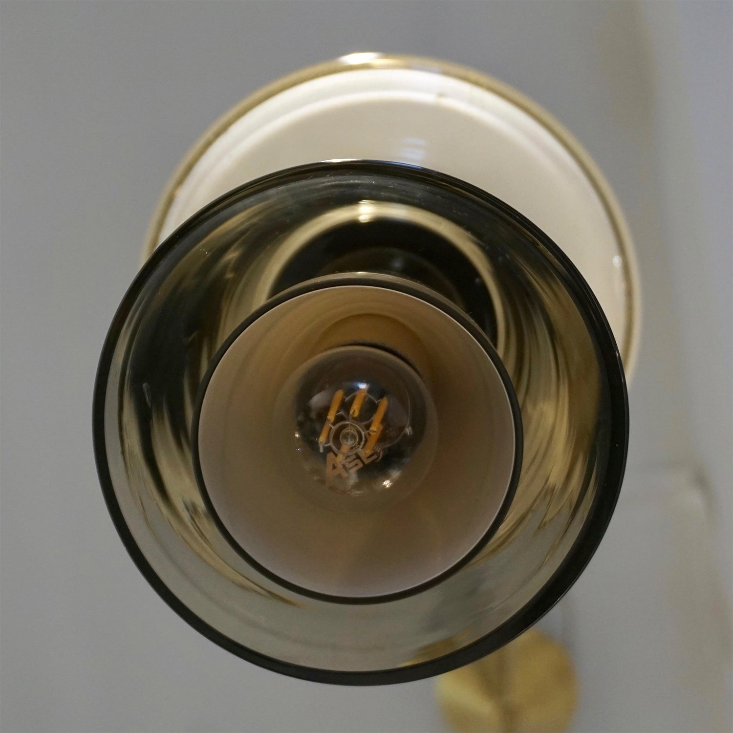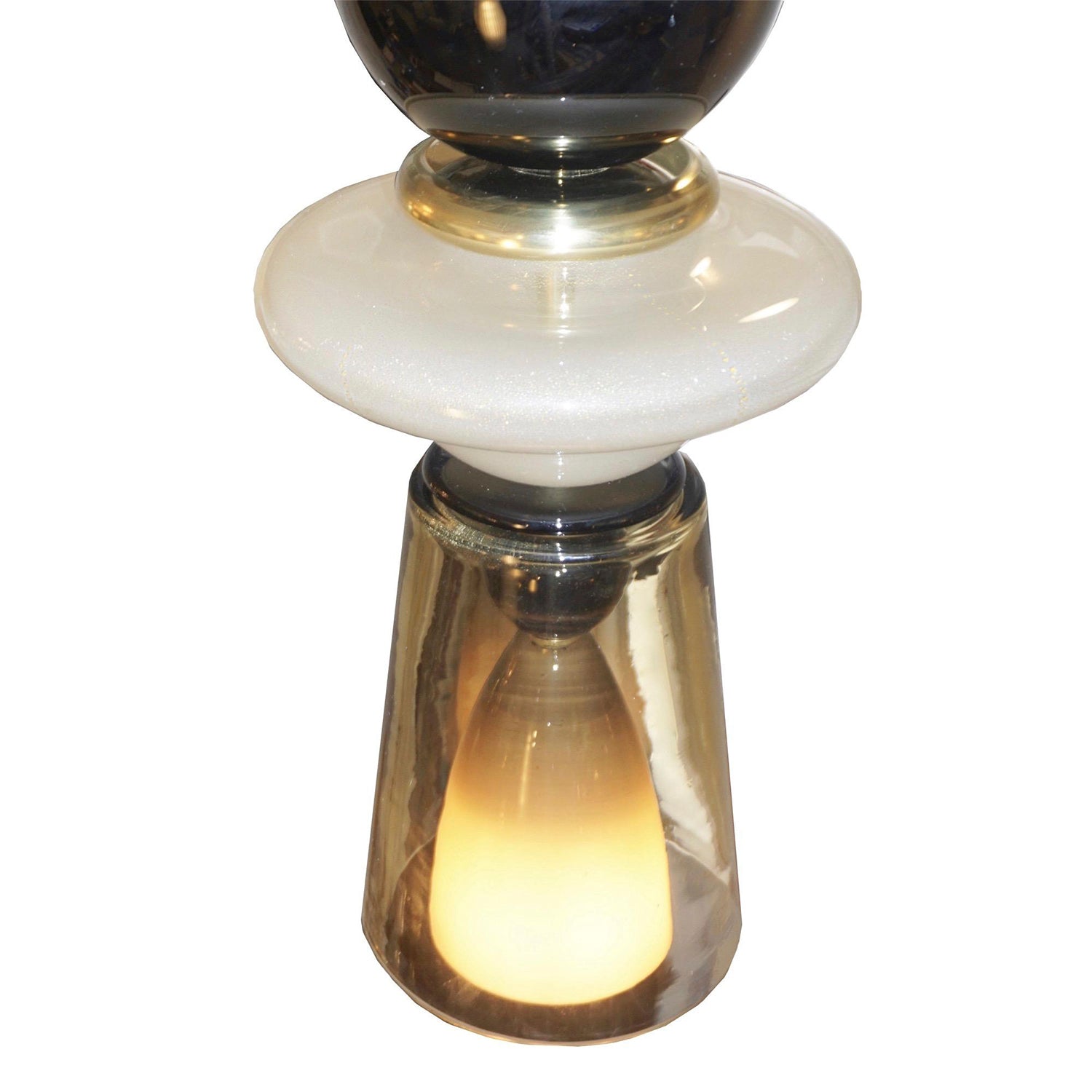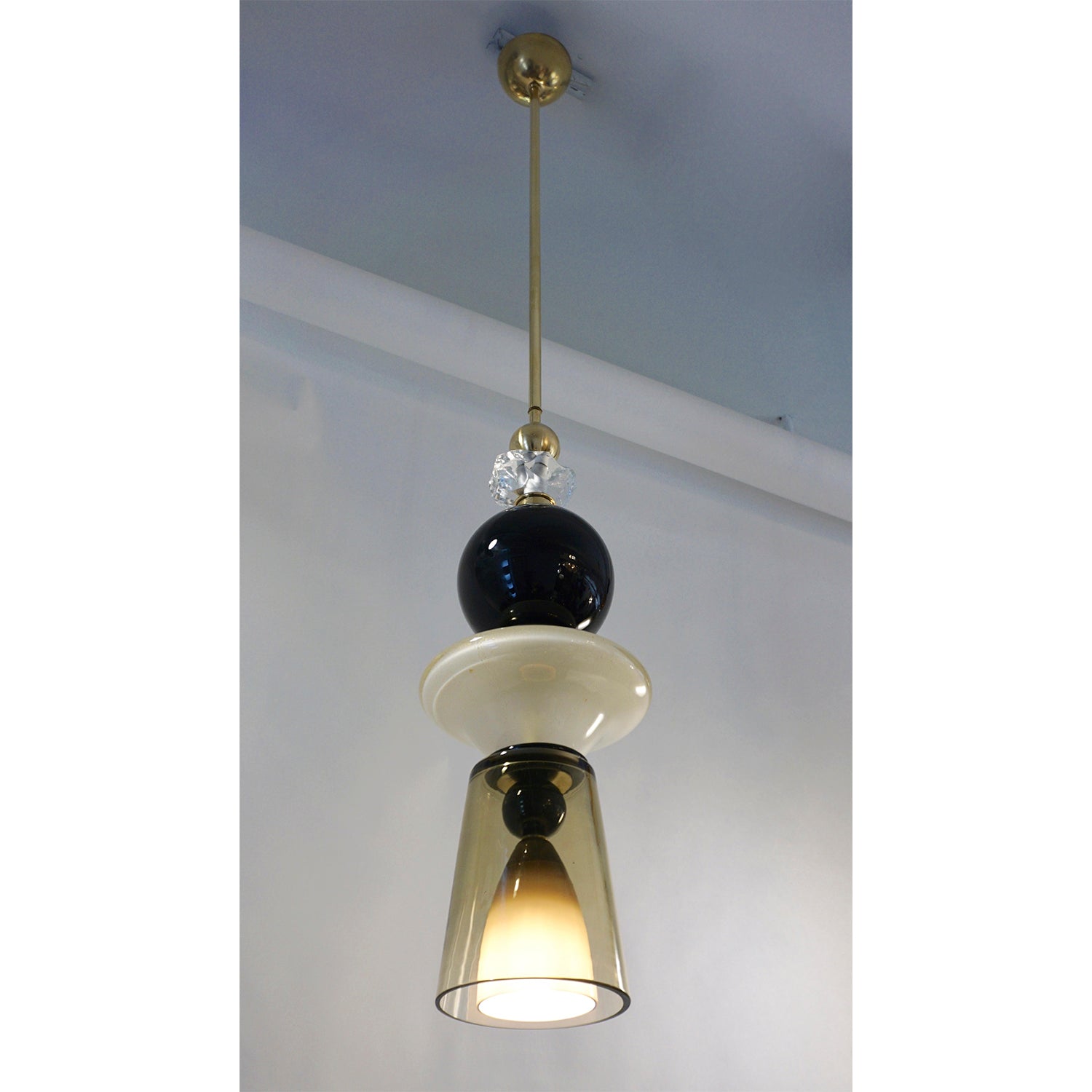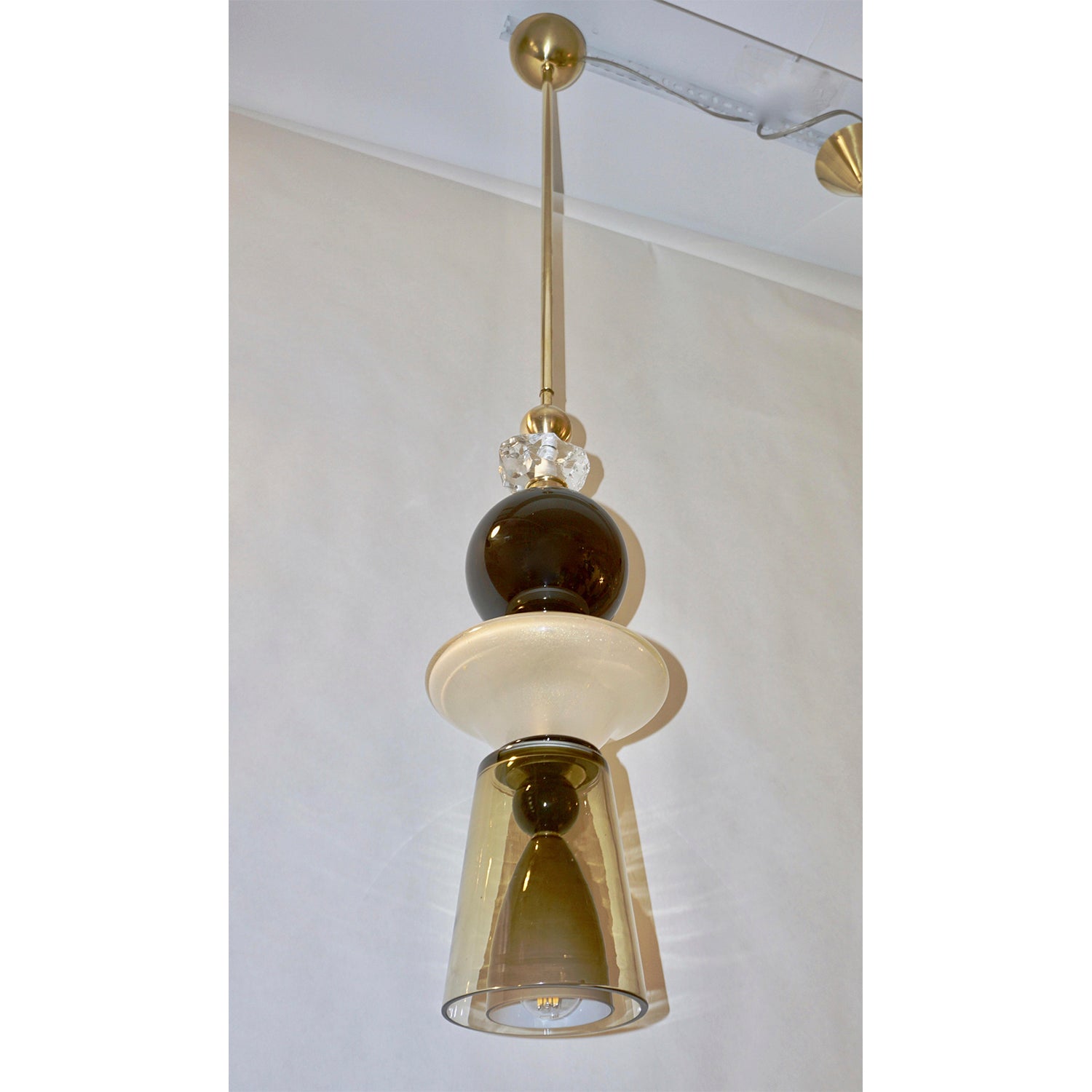 Available Now - Fun and elegant Italian pendant chandelier, entirely handcrafted, of organic modern design consisting of a succession of elements: black opaline glass and brass spheres, a hand-cut jewel like rock glass decoration, a saucer shaped ivory white mouth blown Murano glass piece overlaid in clear crystal worked with pure gold speckles, a handmade translucent smoked bronze glass shade surrounding a sophisticated warm beige sandstone color inner glass contained the light, on a brass pole with adjustable height. Ideal over a kitchen island or as spotlights over nightstands.