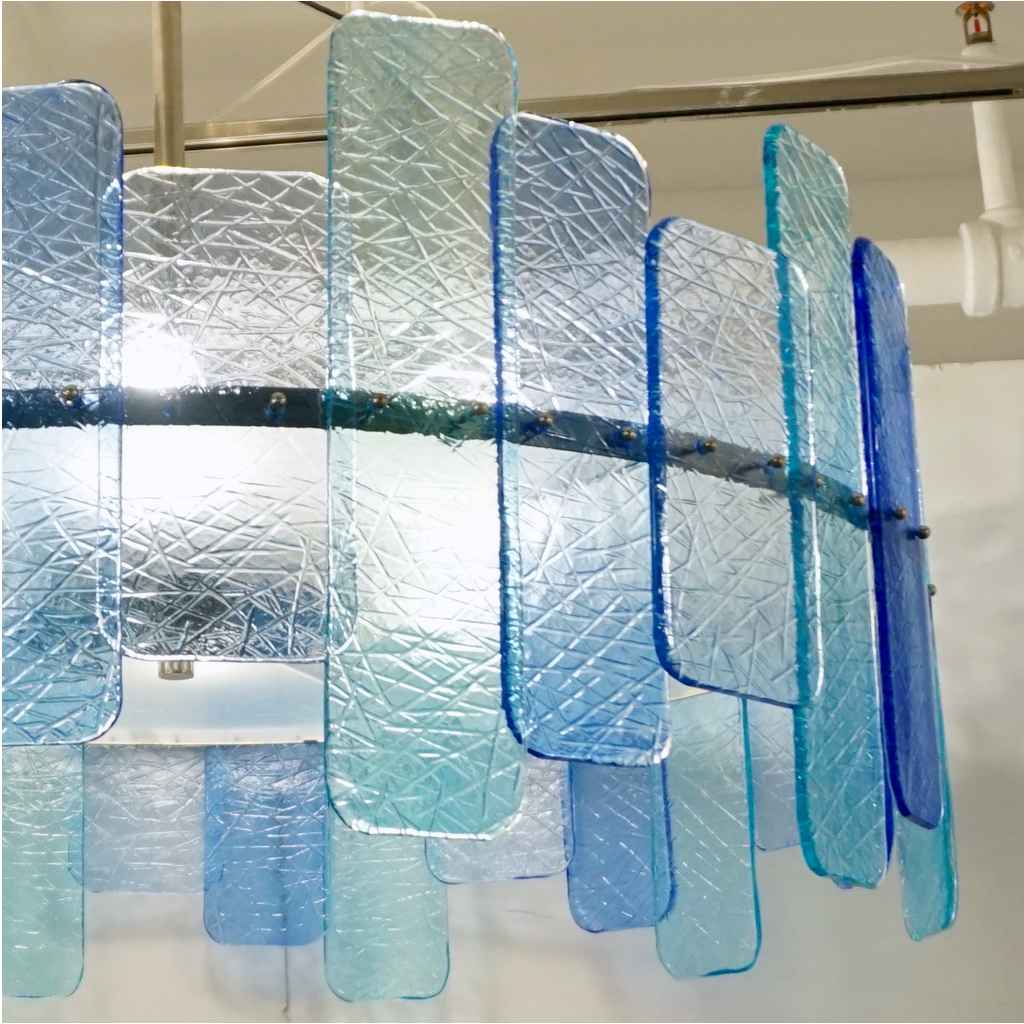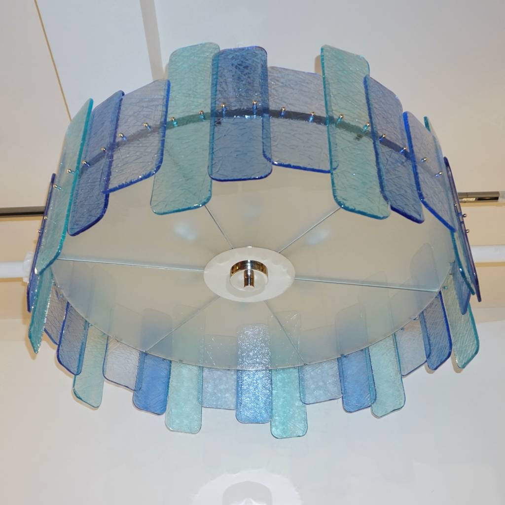 Available Now - Contemporary Italian bespoke modern chandelier with Art Deco Design, entirely handcrafted in Italy, customizable as flushmounts or pendants with different glass colors and finishes, here with a nickel structure in a geometric circular shape, with a frosted glass bottom to diffuse the interior light enclosed by a row of very organic rounded rectangular plates in textured icy blue art glass of different light blue turquoise tints, to accentuate the impression of running water and the movement of the different heights.