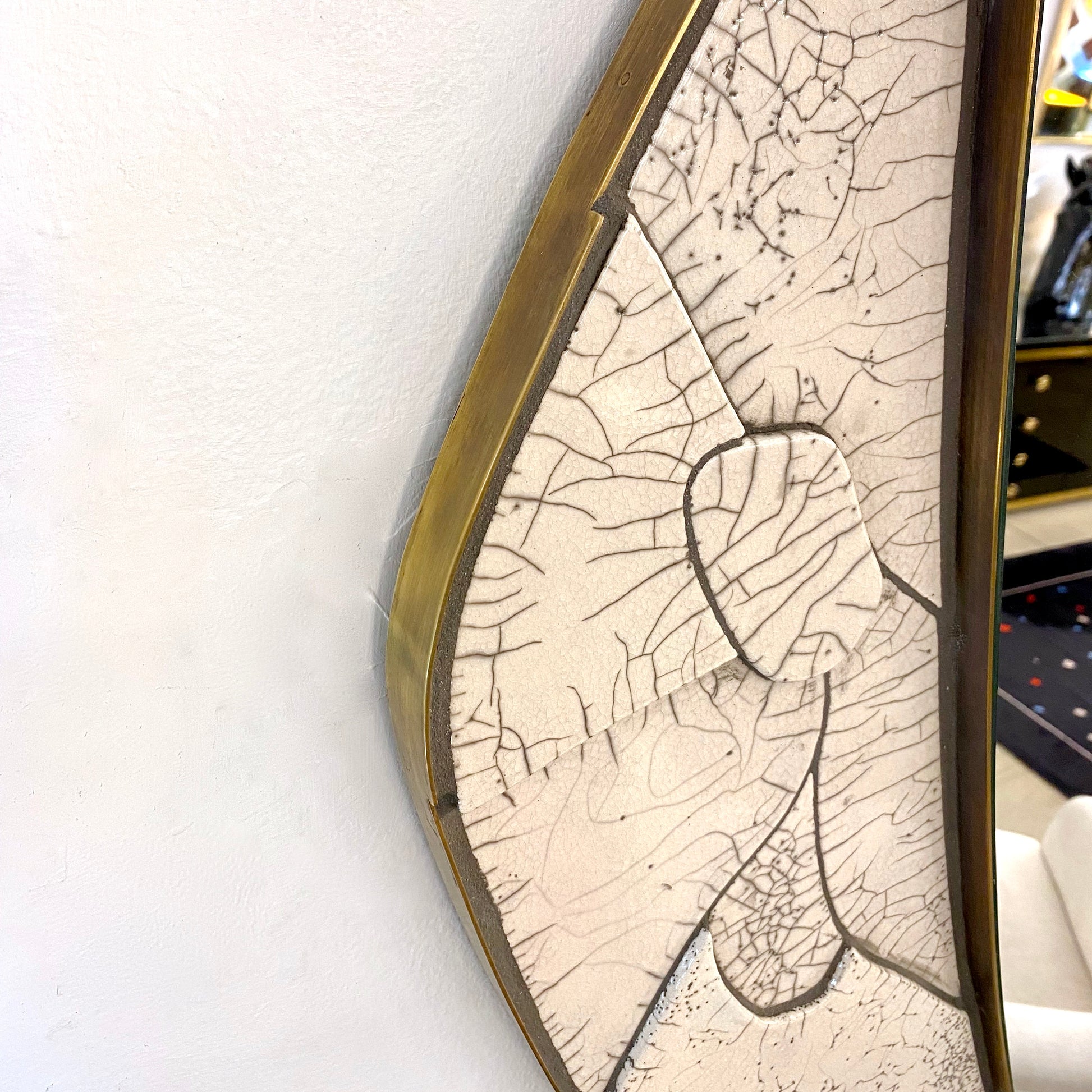 Unique Italian Design Mirror Sculpture, organic modern Work of Art in ceramic, entirely handcrafted in Italy, worked with a deconstructed pattern in a Japanese style. Different thicknesses create steps and movement, the central mirror plate in relief, the color in a cream beige with a subtle pink undertone add sophistication to this sculpture with high quality of construction and details, like the several edges in bronzed brass that follow the sensual curved movement.