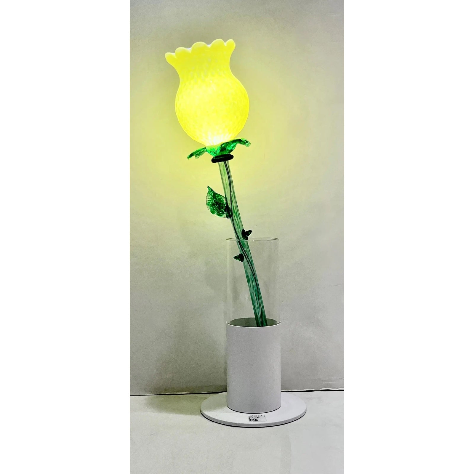 Italian Design Organic Modern Yellow Art Glass Lit Flower White Vase/Table Lamp