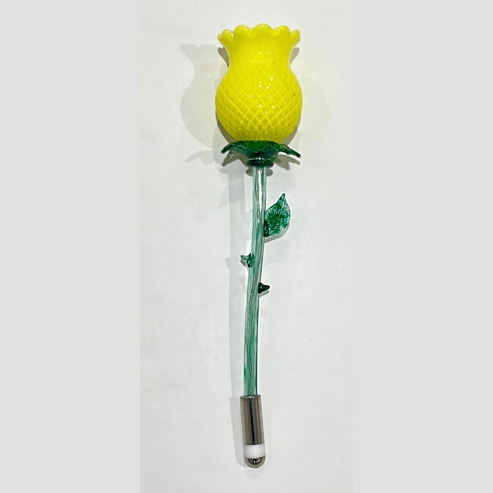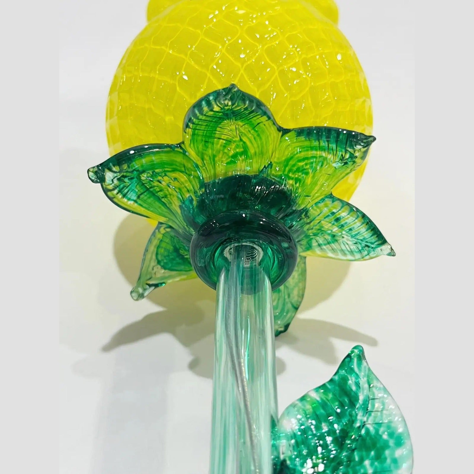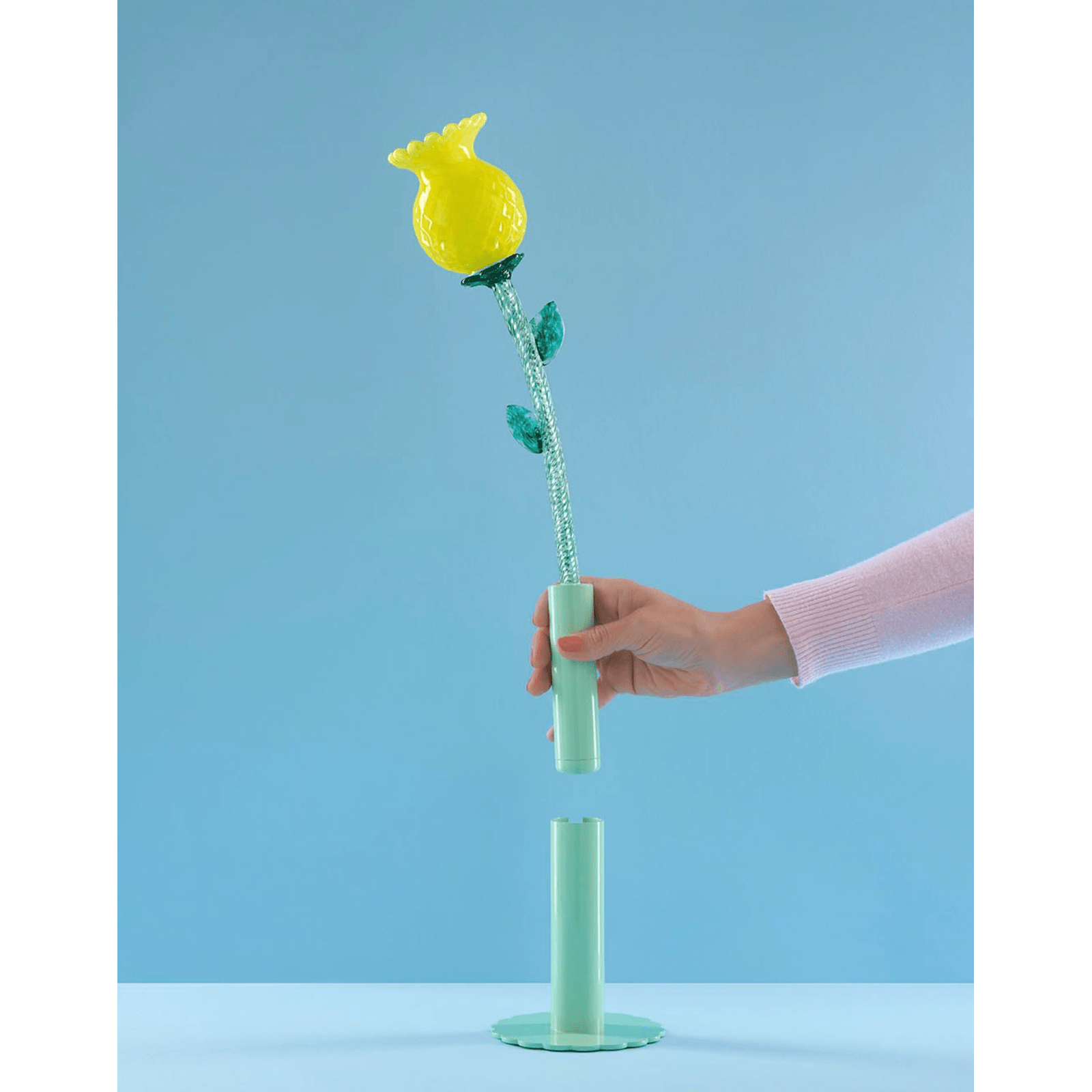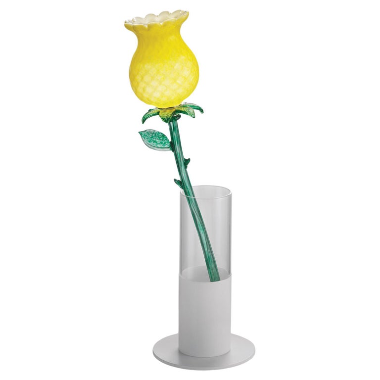 Available Now - A Multiforme product exclusive for Cosulich Interiors & Antiques: a unique decorative item, on the border between reality and fantasy, this glass flower light is part of a collection called "Flowers in Wonderland", designed by Alessandra Baldereschi. Together with a special vase in clear glass contained in a white metal support, that can be lacquered in a requested color, this flower in yellow textured glass, that shines like a star, forms a table lamp that lights up magically when the two elements, flower and vase, come into contact. There are 6 individual stems in pastel colors, yellow, orange, pink rose, purple periwinkle, turquoise blue, and aquamarine green, designed with a naive style, they reveal further shades and tones after lighting, in a single plug-in vase. Diameter of vase base: 6.25".