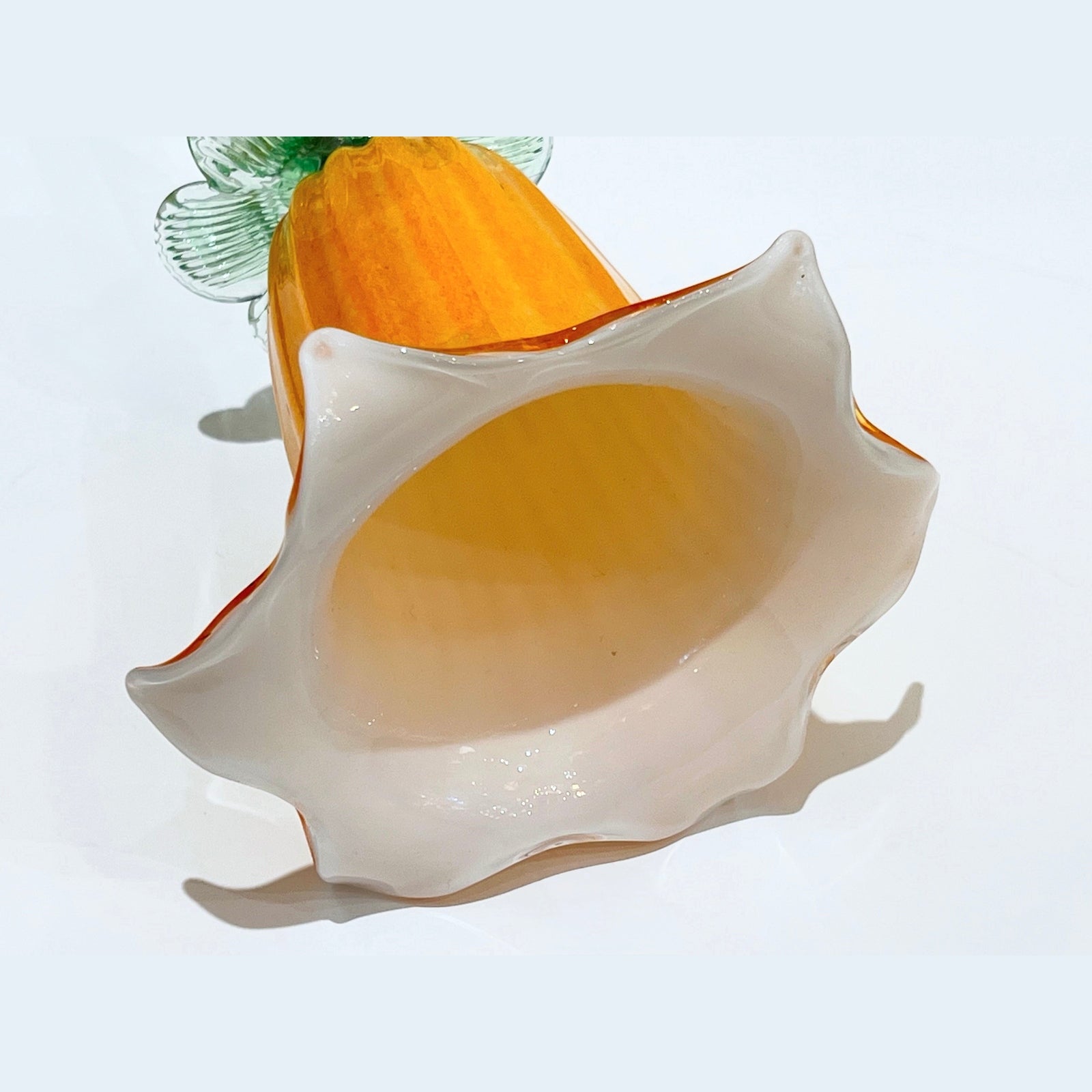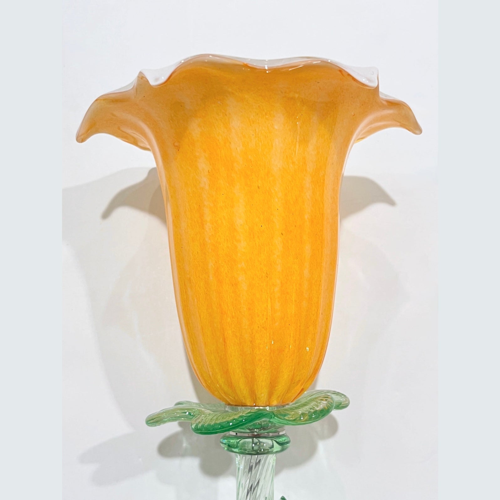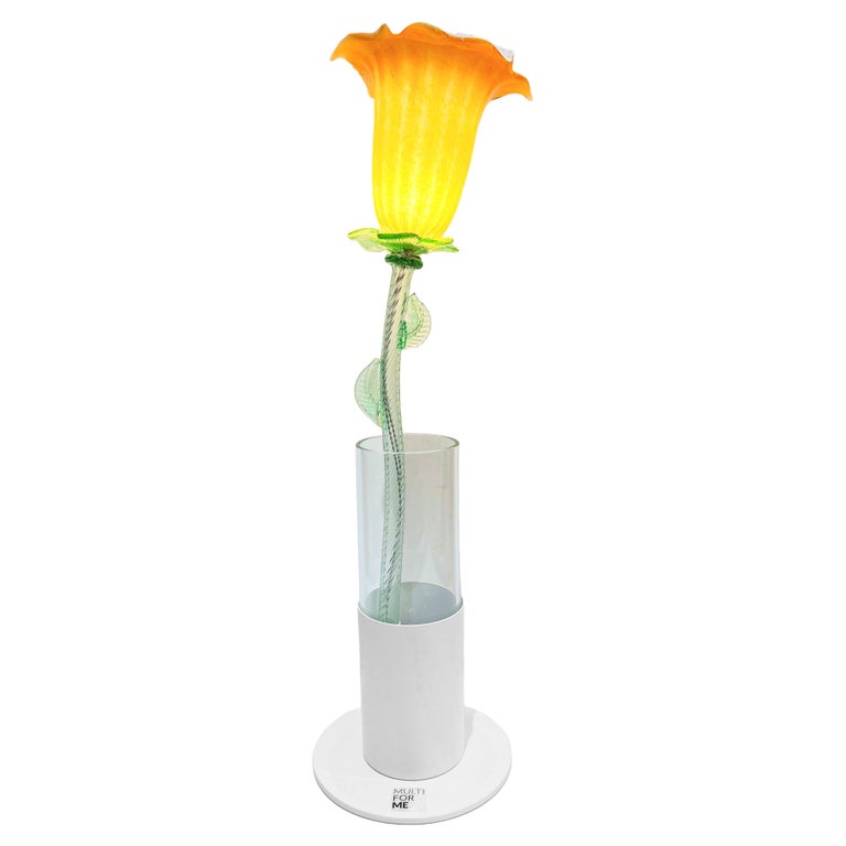 Available Now - A unique decorative item, on the border between reality and fantasy, this glass flower light, in an orange color reminiscent of dawn tints, is part of a collection called "Flowers in Wonderland", designed by Alessandra Baldereschi. Together with a special vase in clear glass contained in a white metal support, that can be lacquered in a requested color, the flower forms a table lamp that lights up magically when the two elements come into contact. There are 6 individual stems in pastel colors, yellow, orange, pink rose, purple periwinkle, turquoise blue, and aquamarine green, designed with a naive style, they reveal further shades and tones after lighting, in a single plug-in vase. A bigger size can accommodate up to 5 flowers of your choice. Diameter of vase base: 6.25".