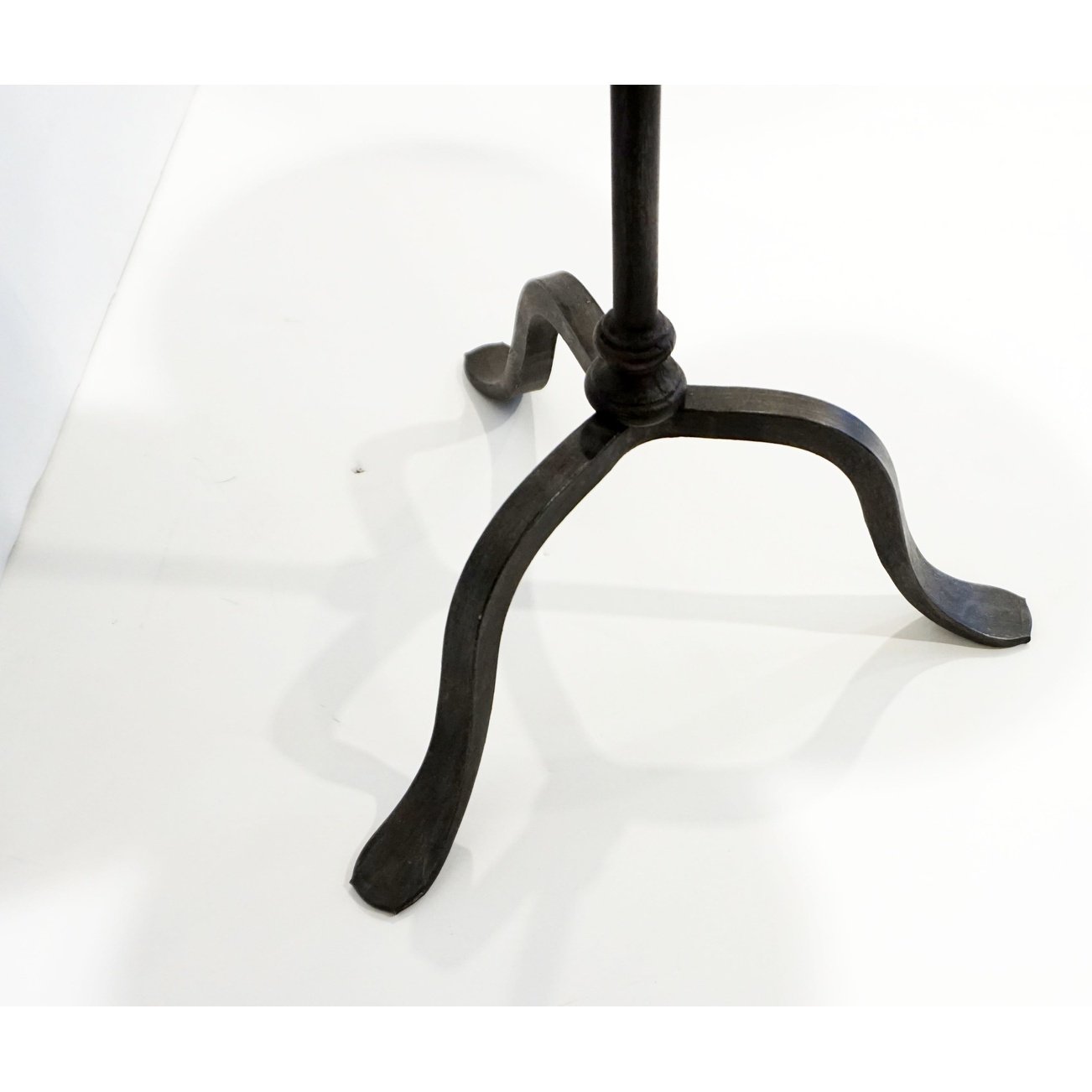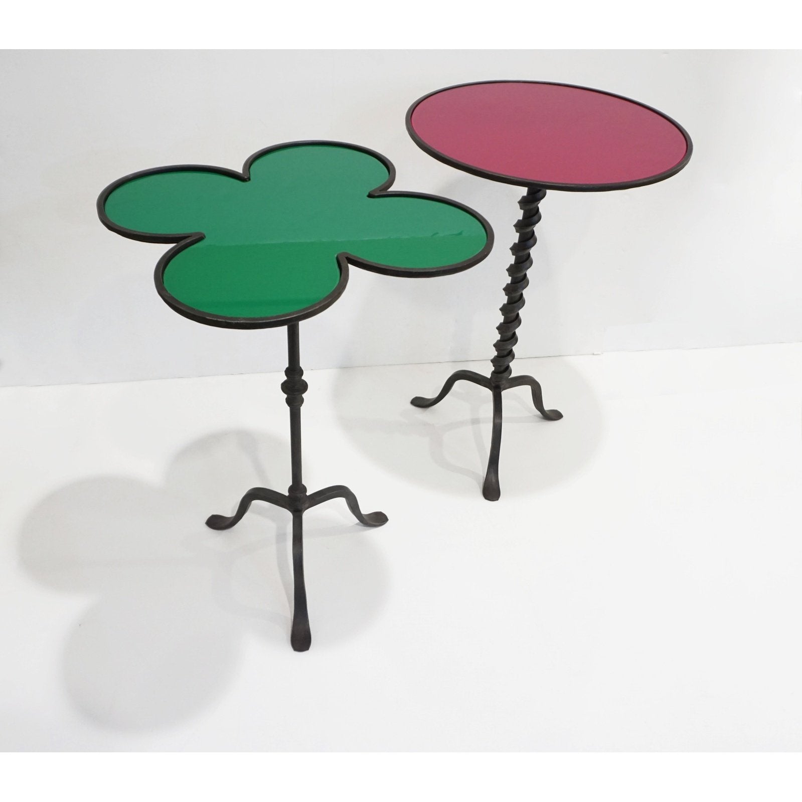 Add fun with color to your environment, outdoor and indoor! This contemporary cast iron side table with a clover-shaped top, entirely handcrafted in Italy, will certainly delight with a glass top customizable in any color of your choice. This organic modern tripod piece presents a sophisticated industrial look, an artistic side with a decorative motif coming up the central stem and functionality with a raised border to keep in check your drinks ... and the removable glass top in case the table needs to stay outside under the rain. Can be accompanied by a twisted stem round table.