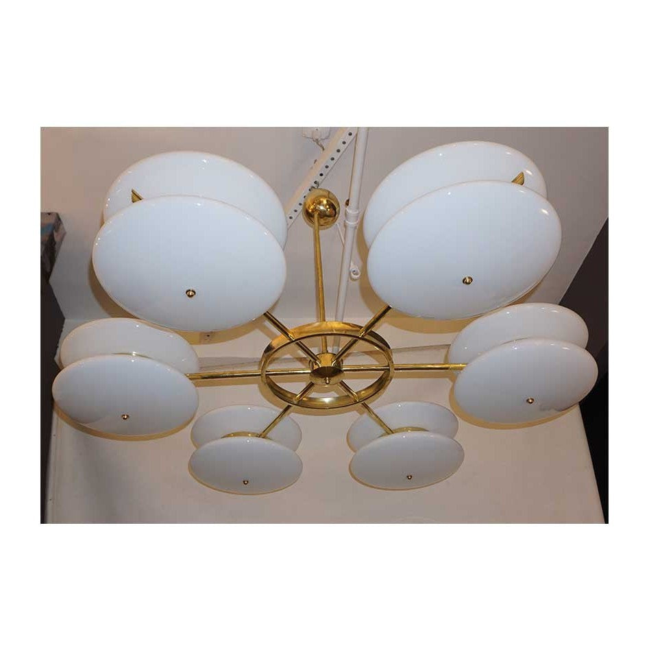 Italian fine organic wheel chandelier, entirely handcrafted in Italy with exclusive design, the airy modern round structure in brass with a central wheel element supports six surrounding white Murano glass double globes inset in a brass collar decorated with a slanted metal rod. High quality of the blown overlaid glass that has an enamel like finish. The height can be adjusted to requirements. Fitted with 12 bulbs Edison base bulbs.