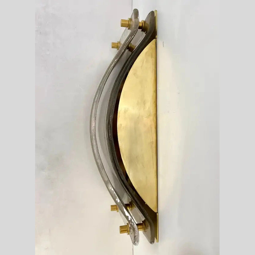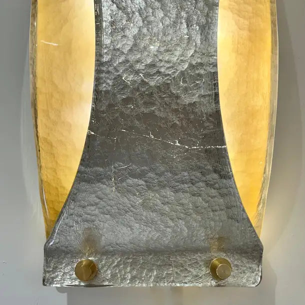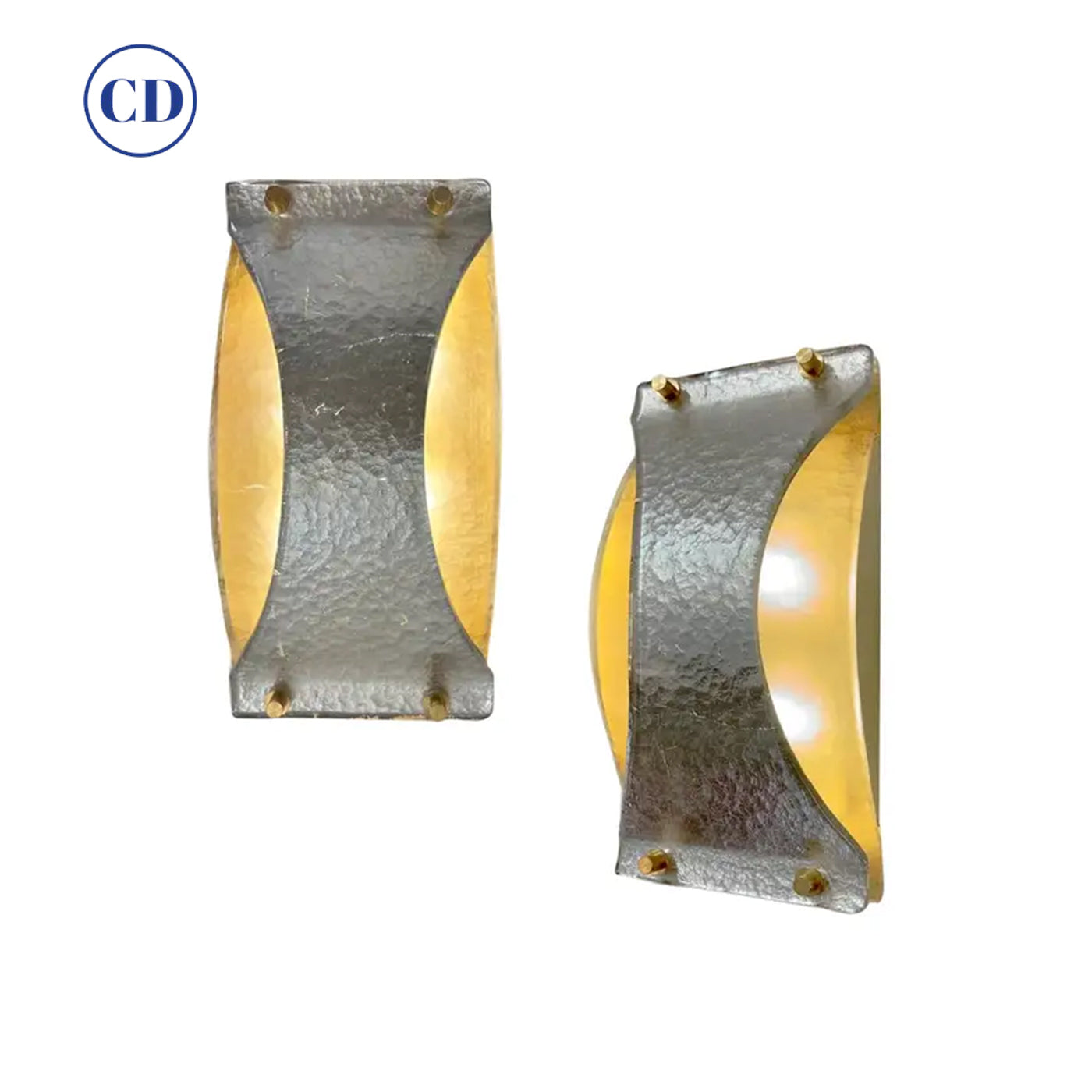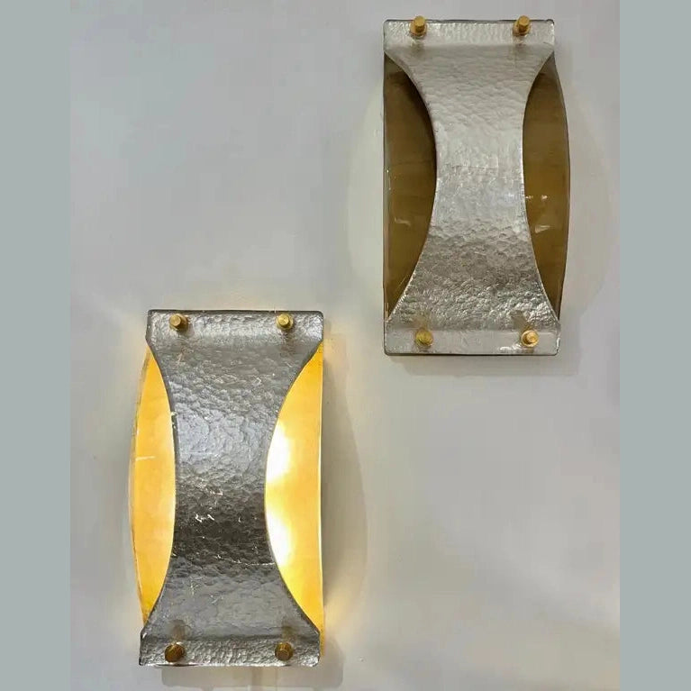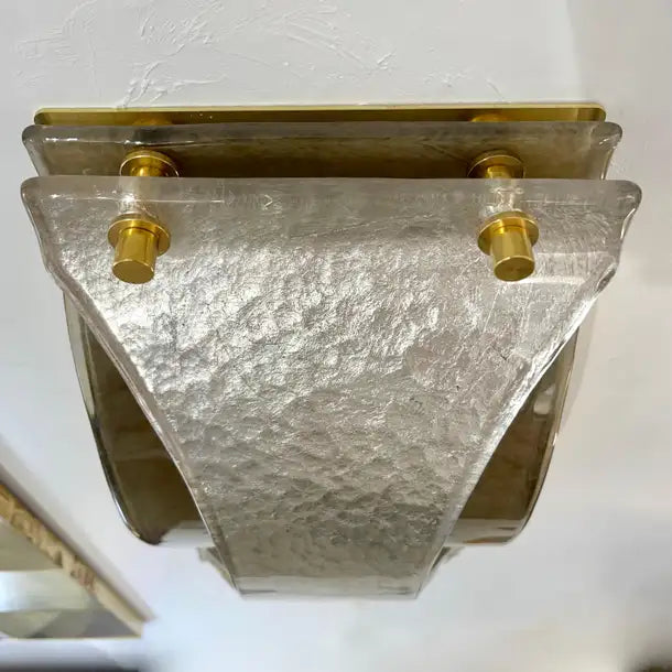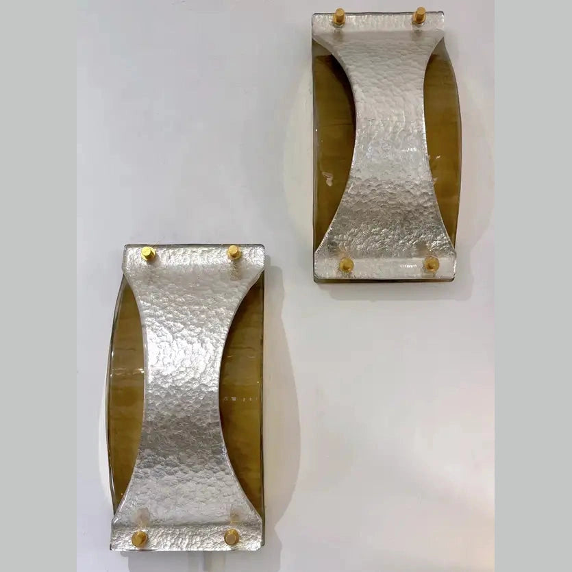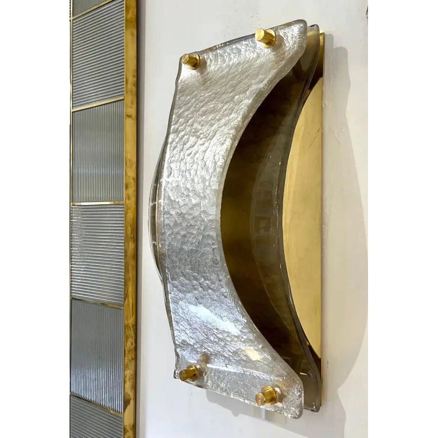 Bespoke Italian Pair of Double Layered Murano Glass Curved Brass Sconces or flushmounts , an aerodynamic design with minimalist rectangular shape, enhanced by brass sides supporting a smoked Murano glass curved cover, with a hammered texture, wrapped with a glass element of X concave shape, decorated with hand applied pure silver leaf on reverse, that lets the smoked glass show partially through. The sides are elegantly closed by the brass back plate to amplify the curved design. The combination of textures with the sensuous design in a streamline shape gives characters to these wall lights in the used materials and shape.