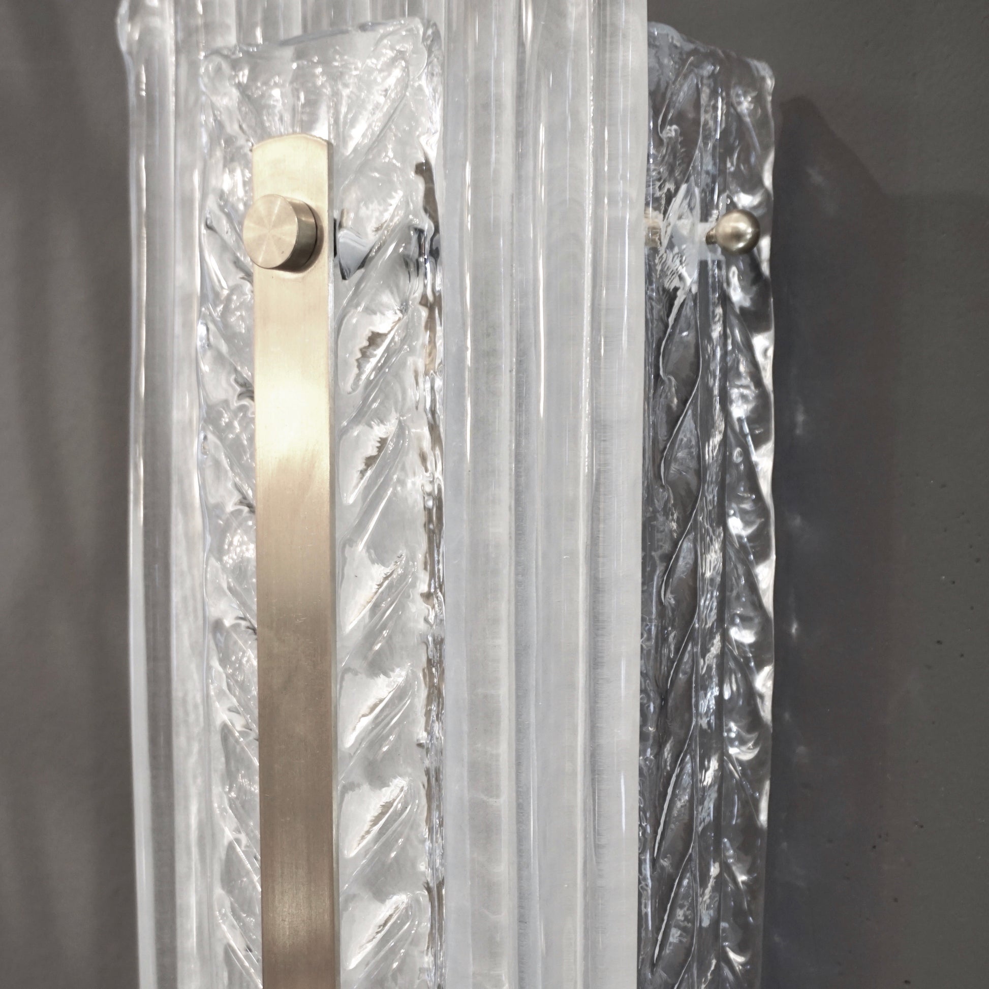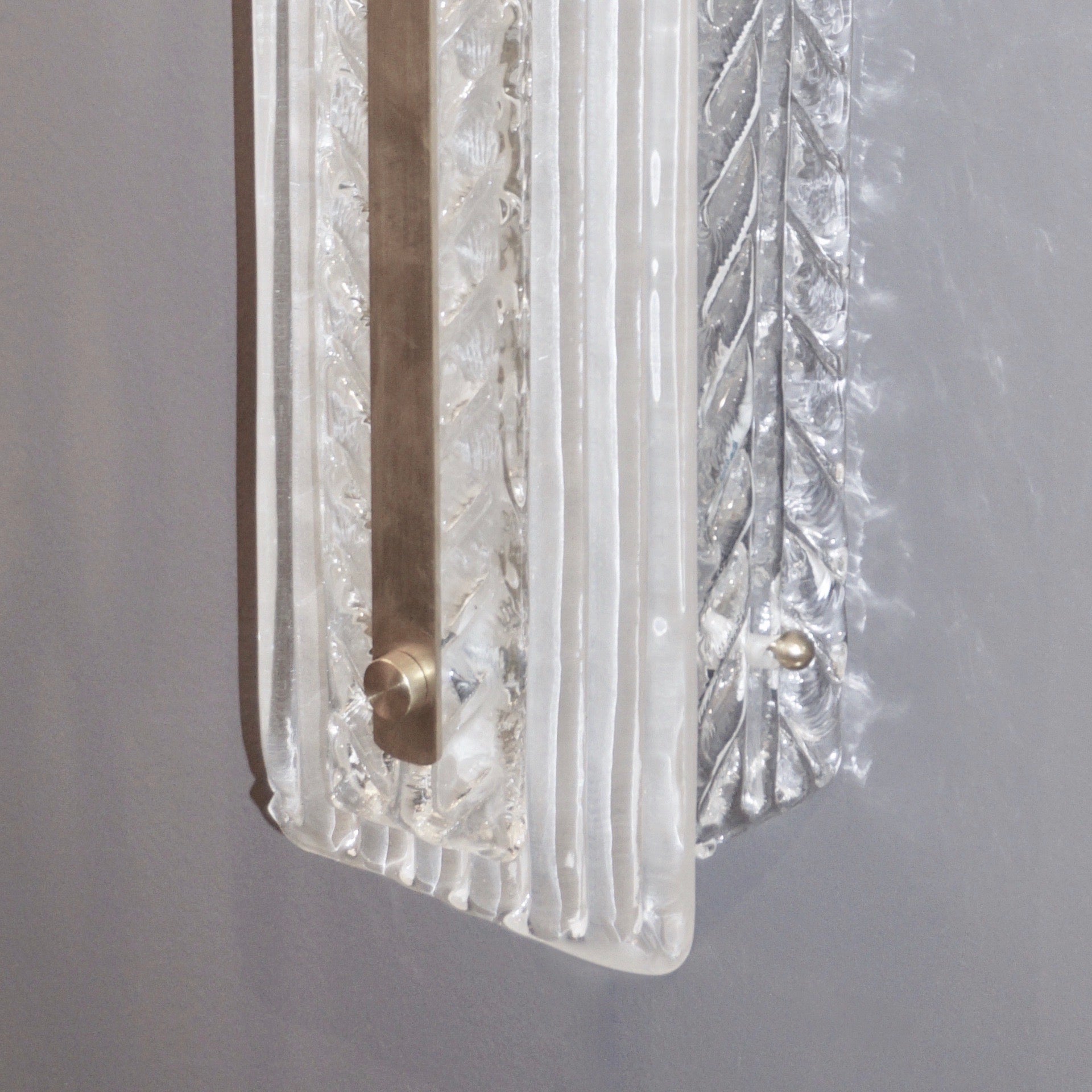 Very elegant Italian contemporary organic wall lights, entirely handcrafted in the style of Barovier & Toso in refined white and crystal clear Murano art glass, decorated in relief with vein leaf texture and enhanced by a striated white frosted glass front, highlighted by a handmade nickel vertical band. Their tall and thin size makes them ideal for narrow spaces.