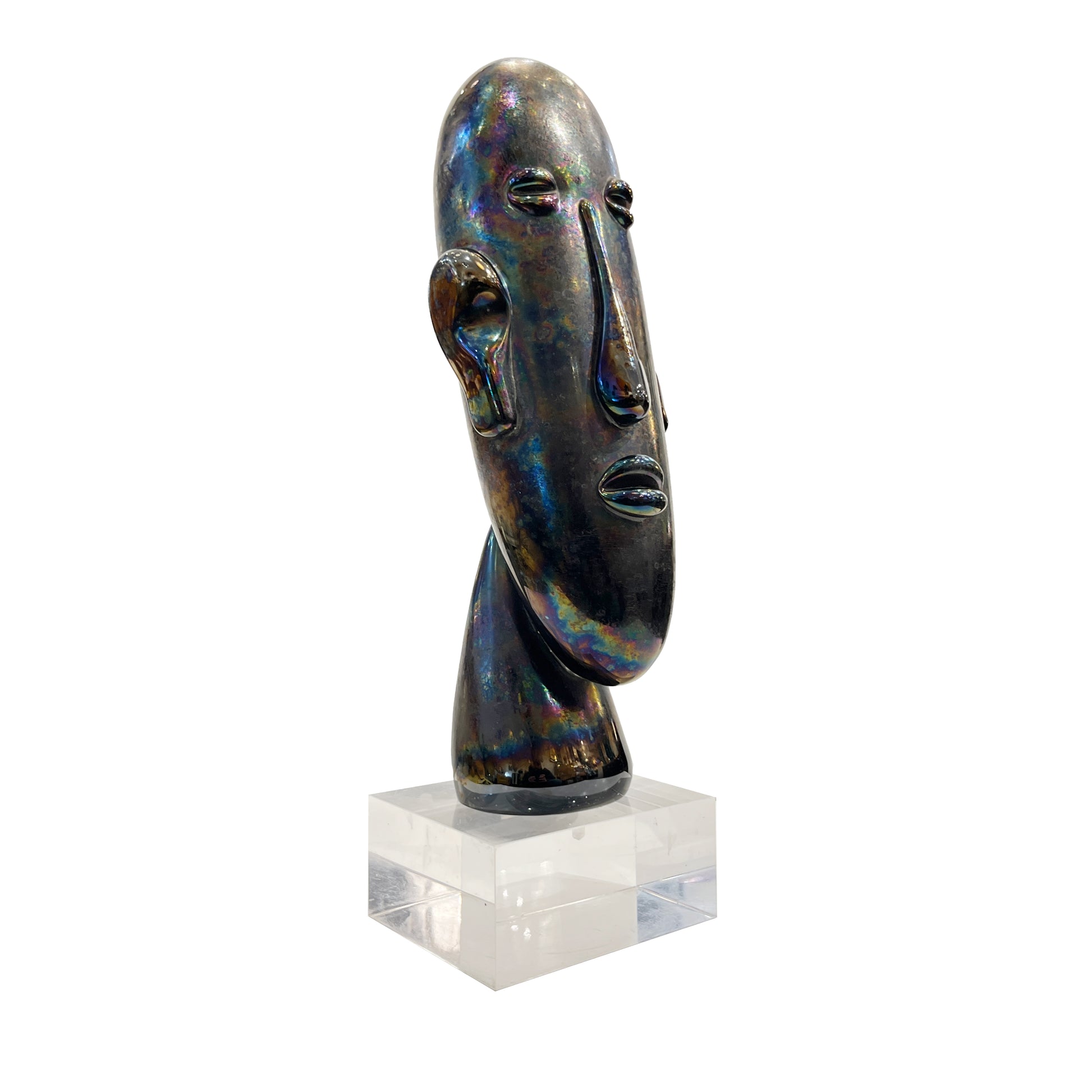 Amazing modern head in an ethnic design inspired by the Easter Island statues, very expressive mouth-blown sculpture in black Murano glass worked with an iridescent finish that adds depth to the realistic Work of Art, perfectly raised on a neck glass base. This item, individually crafted with a unique expression, is a very limited production signed by Ernesto Purisiol for the furnace of Alfredo Rossi in Murano.
