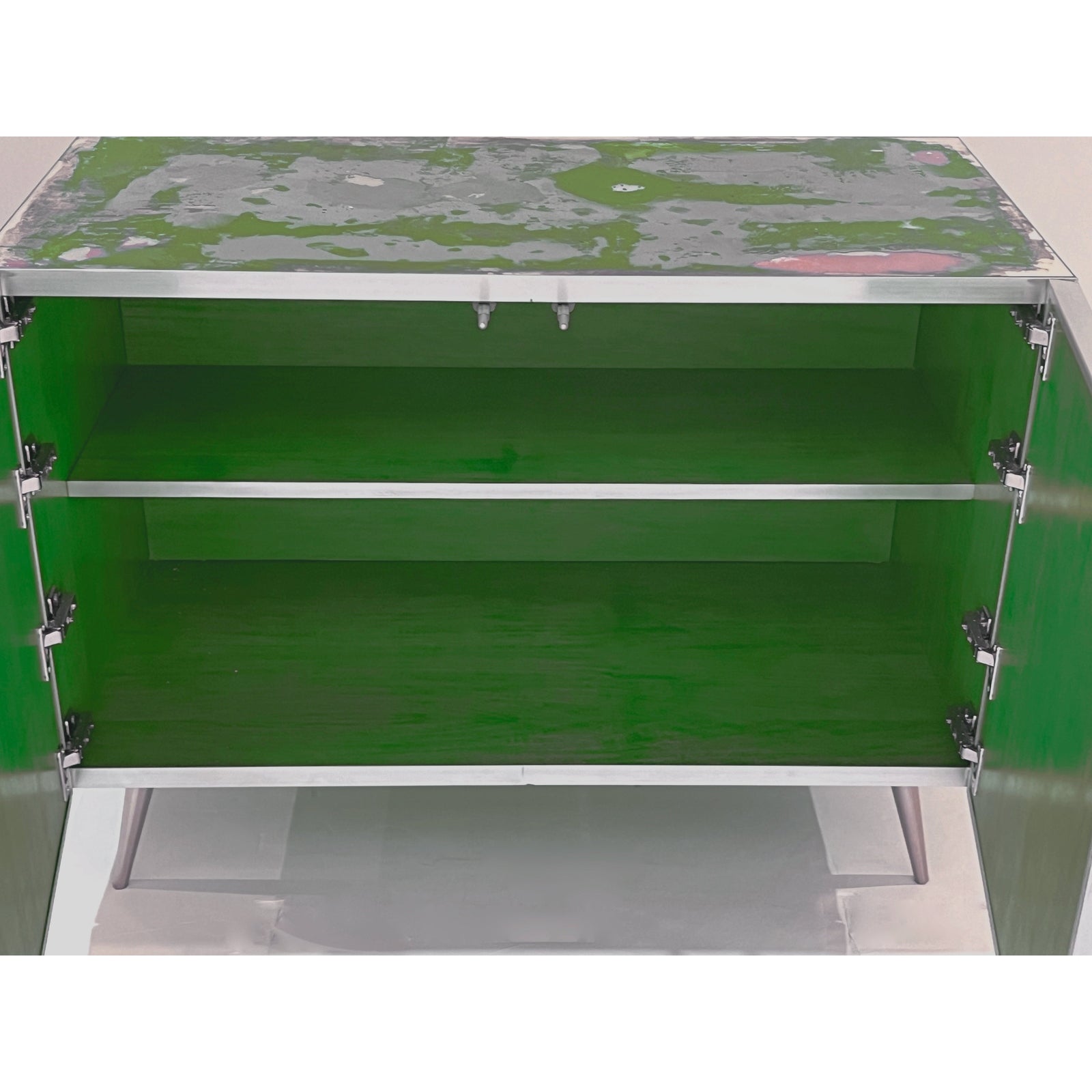 A new innovative sideboard/credenza, entirely hand-crafted in Italy and completely customizable in sizes, finishes, colors and functions, part of a bespoke collection created as a canvas for personal expression. With high quality of construction and attention to details, this Tanganika wood buffet, fitted with 2 push doors edged in satin nickel, is decorated with an abstract pattern created like a modern brushed painting on antique mirror and consists of strokes in Moss Green and Lavender Amethyst Purple colors. The interior is painted in lime green, with one shelf. Raised on tapering satin nickel legs. Please contact us for your own vision, with any RAL color choice and custom details.