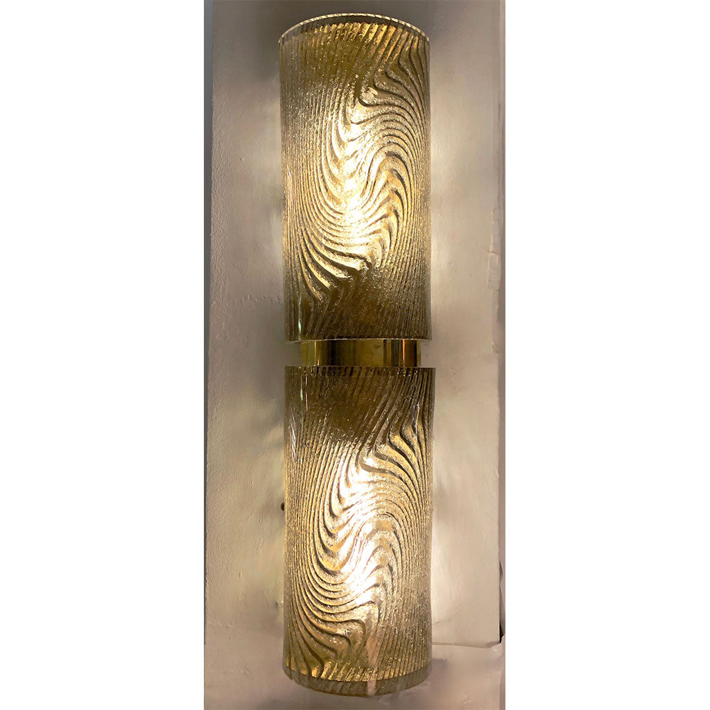 Contemporary Italian Design pair of organic wall lights mounted on a handmade brass structure with two Murano glass cylinders, in a sophisticated light terracotta / brown smoked tint, elegantly decorated on reserve with an attractive swirling pattern frosted with "graniglia". This technique, allowing the brass to show through the decor, confers a unique glowing effect to the glass and enhances the texture. The lights are closed at both ends by brass covers and can be used as sconces hung vertically or horizontally or as flush mount ceiling lights. Each sconce is fitted with two candelabra sockets and wired for the US.
