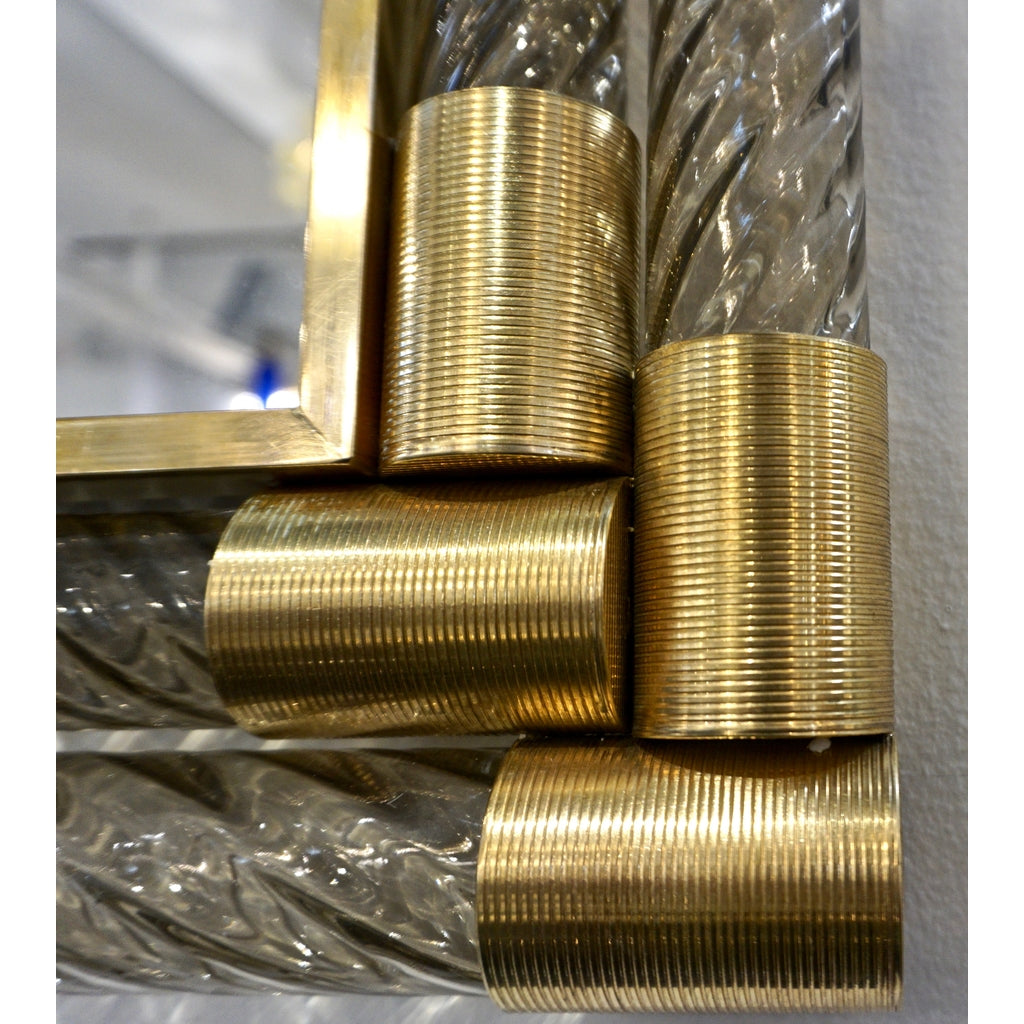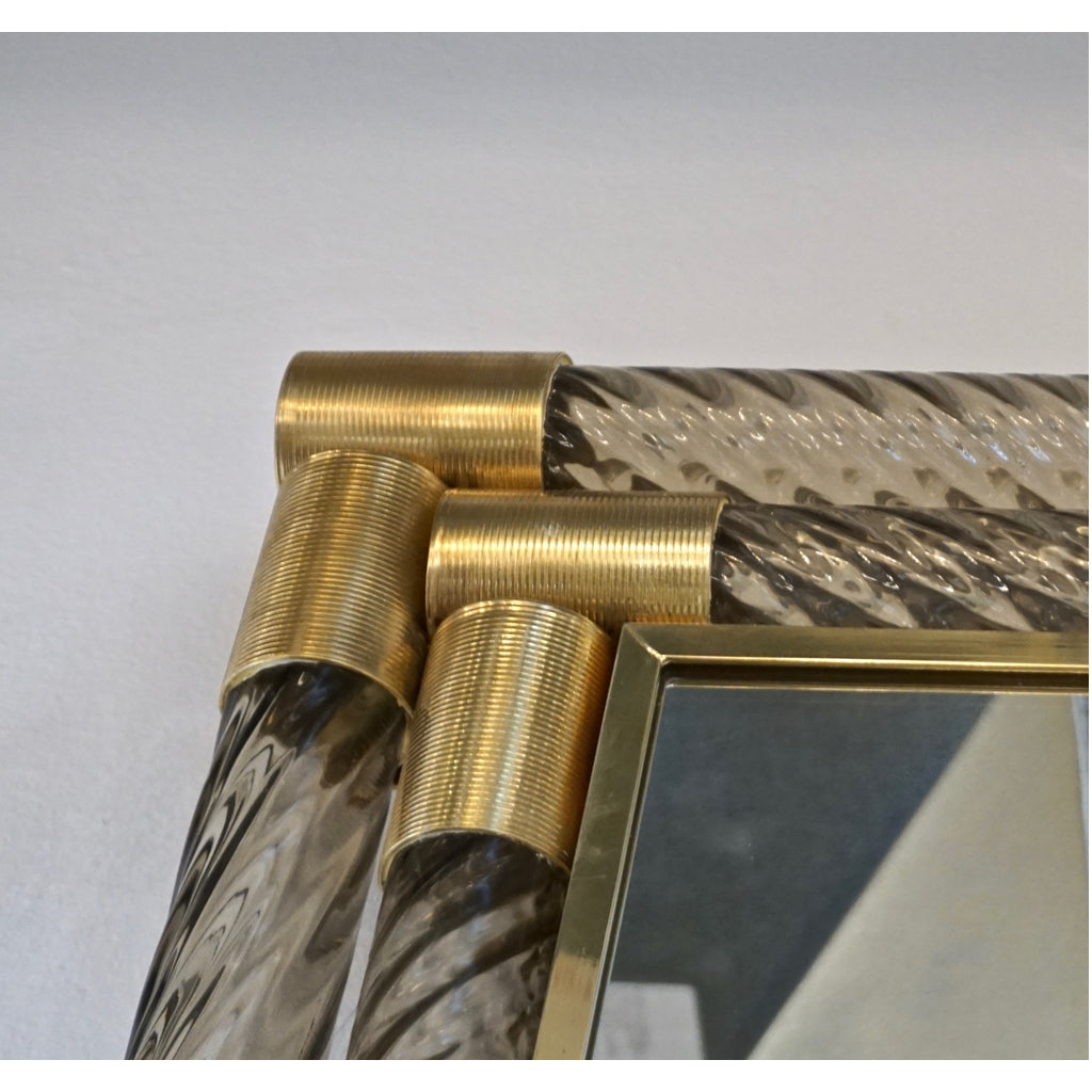 Bespoke customizable minimalist organic large mirror, simple yet sophisticated, entirely handcrafted in Italy, the interesting frame is composed of two Torchon twisted Murano glass pipes with a special grey smoked tint, in the style of Barovier, that plays with light creating reflections. They are encased in handcrafted reeded brass corners, the longer sides highlighted with central brass accents and they are edged with a brass border that elegantly surrounds the central mirror plate. Width of frame with brass edge: 4" Can be hung horizontally or vertically and personalized in sizes, also with additional pipes and glass colors: crystal, gold amber.