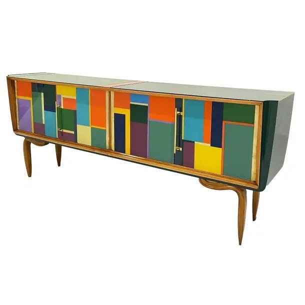 A vibrant celebration of mid-century Italian design, this exquisite 1950s buffet cabinet with 4 doors captures the spirit of the Mondrian aesthetic through a masterful composition of hand-applied glass panels applied to the top and front. The dynamic façade, playful and refined, transforms storage into a statement of style. Each geometric section is rendered in bold, saturated colors, hunter green, emerald green, orange, yellow, purple, blue, teal... echoing the visual language of modernist abstraction while showcasing the artisanal excellence of Italian glasswork. Supported by elegantly sculpted wooden legs and framed in a light, warm maple wood structure, with dark green lacquered sides, this long cabinet unites functionality with artistry. Its sleek form makes a striking focal point in contemporary and eclectic interiors. A one-of-a-kind work that transcends time, this vintage credenza is a testament to Italy’s enduring legacy of design innovation and decorative mastery.