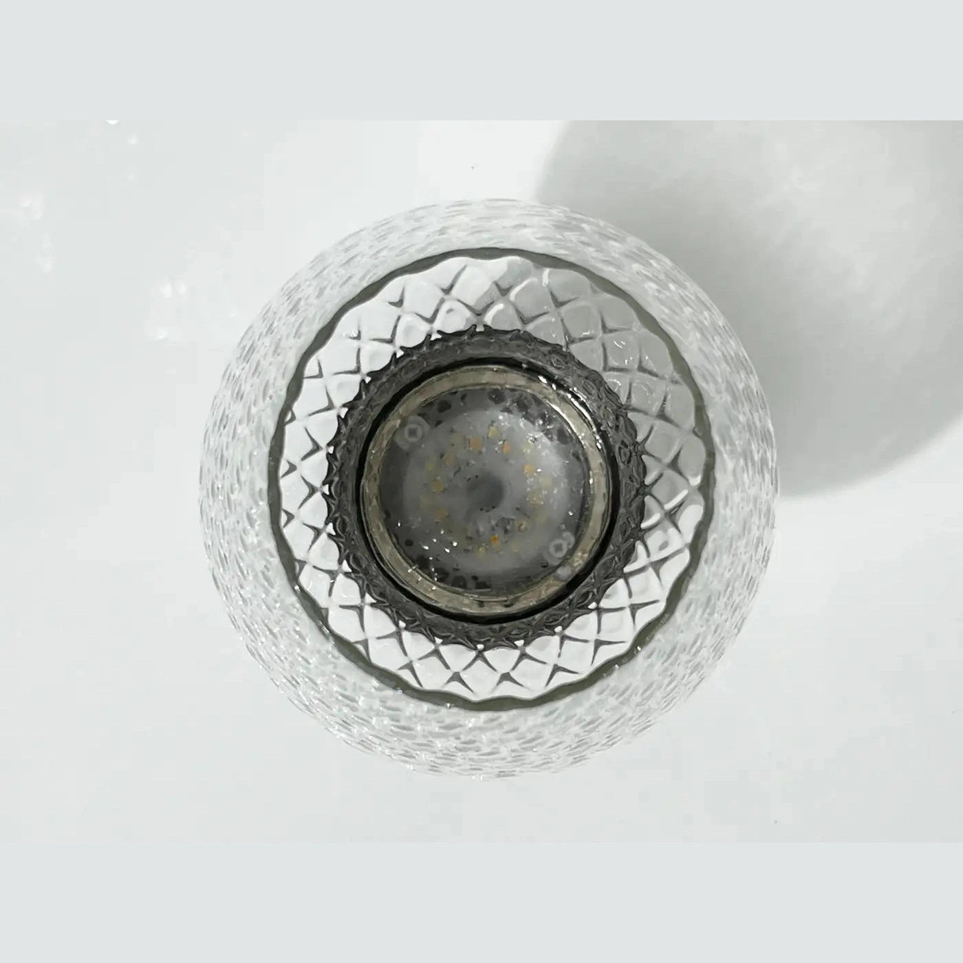 This versatile object, with a nature-inspired design, is composed of a traditional lampshade in crystal glass decorated with the Balloton texture, resembling a honeycomb pattern, that doesn't contain a light bulb as is usually the case but is illuminated by the diffused light from below, within the round satin brass base in antique bronze finish. Surprisingly, it can be used as a vase where fresh flowers in water or river pebbles, scented candles, any object, acquire a spectacular effect. A decorative item that is sure to bring elegant fun to any surface!