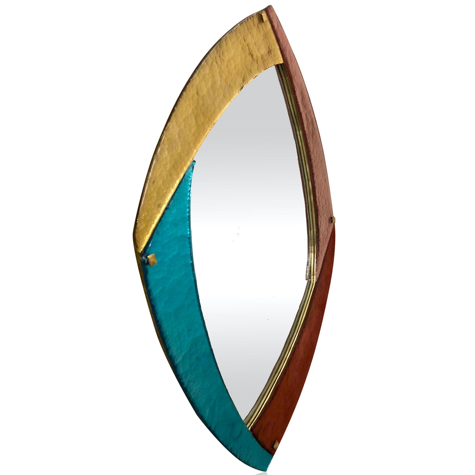 A pair is available. Contemporary custom-made modern oval mirror, entirely hand-made in Italy, of organic stylized kite shape, that can be displayed horizontally or vertically. Of unique Memphis-inspired design, this Art glass mirror has 4 destructured curved sides, in blown hammered Murano glass that is worked with pure silver leaf at the back that gives the 4 colors, aquamarine blue, gold, pink and garnet red, exceptional vibrancy, and a moire effect. High quality of craftmanship with brass inset around the mirrored plate.