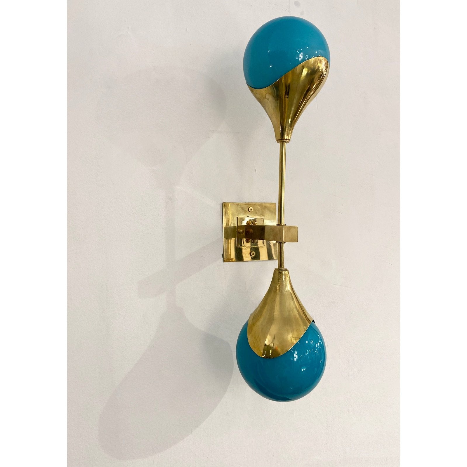 Contemporary Mid-Century Modern Stilnovo style sconces in brass, entirely handcrafted in Italy, with light blue turquoise glass shades that are overlaid in white glass to produce plenty of glowing light when lit. The handmade brass arm supports two vertical poles of different lengths to add aesthetic and movement to this fixture.
