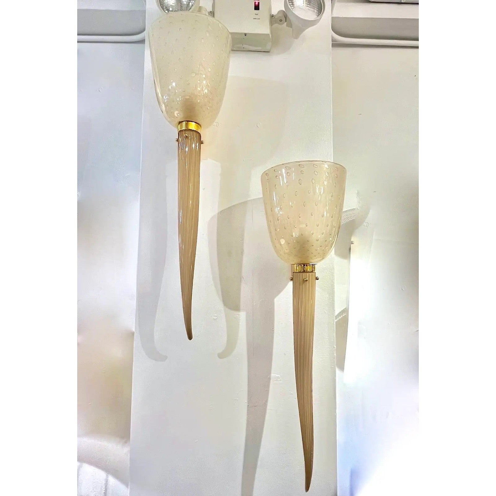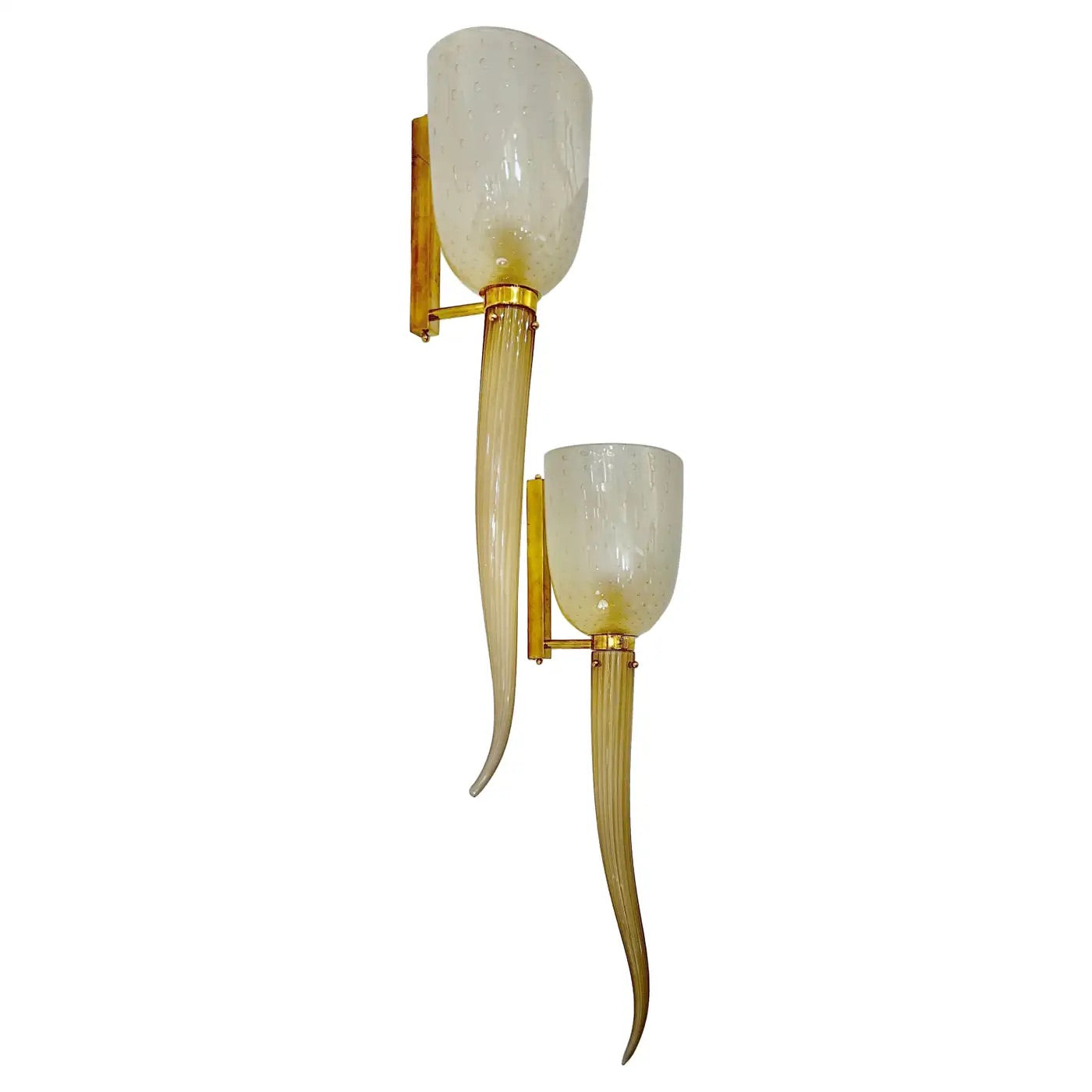 Modern Art Deco Design Gold Frosted Murano Glass Wall Lights with curved beige tall tails, in exquisite reeded blown Murano glass. Unique design, the frosted oval bowls are worked with pure 24 kt gold, which adds preciousness to this set with tall tail. The taupe, beige, and frosted colors are very sophisticated and suit any environment and style with their quiet elegance.