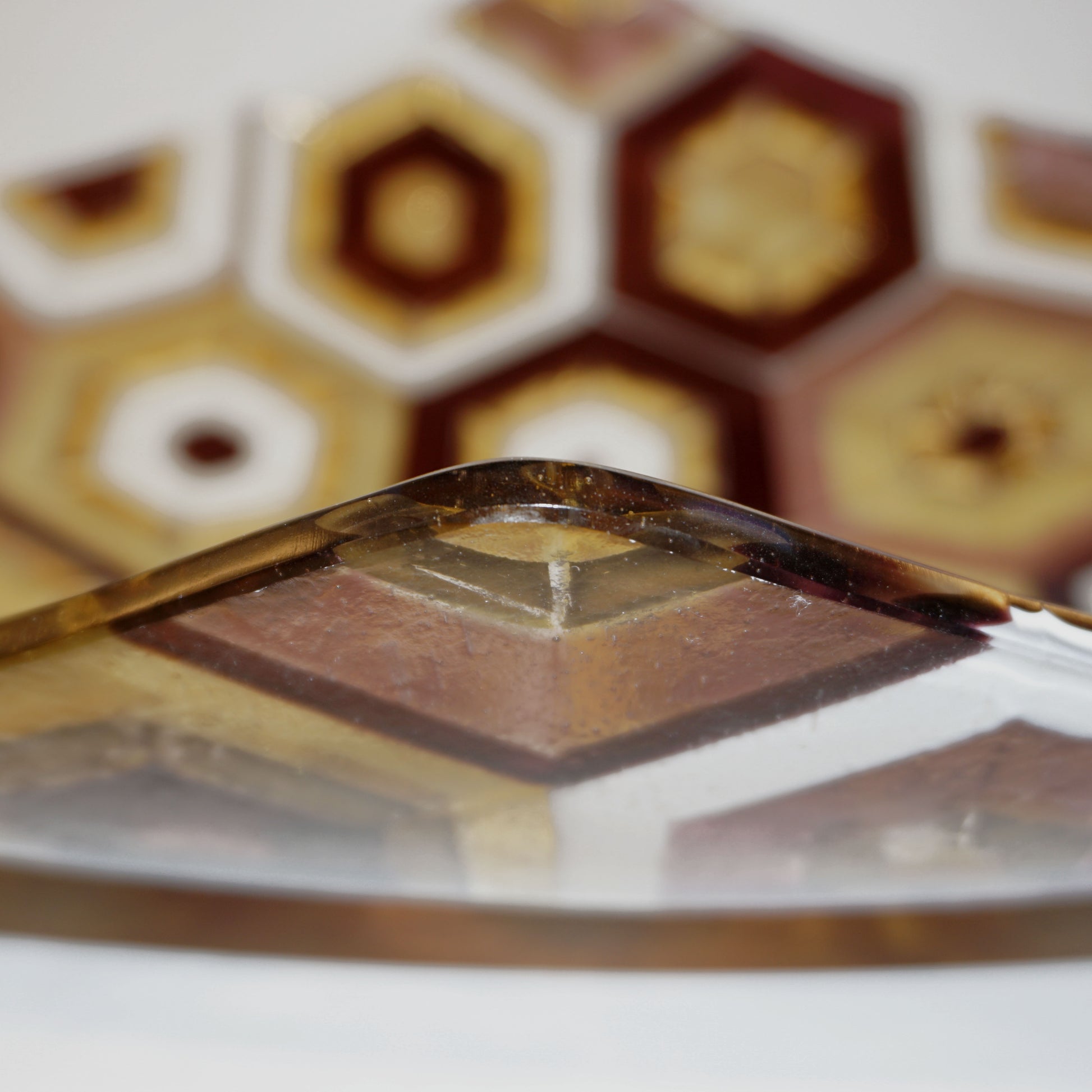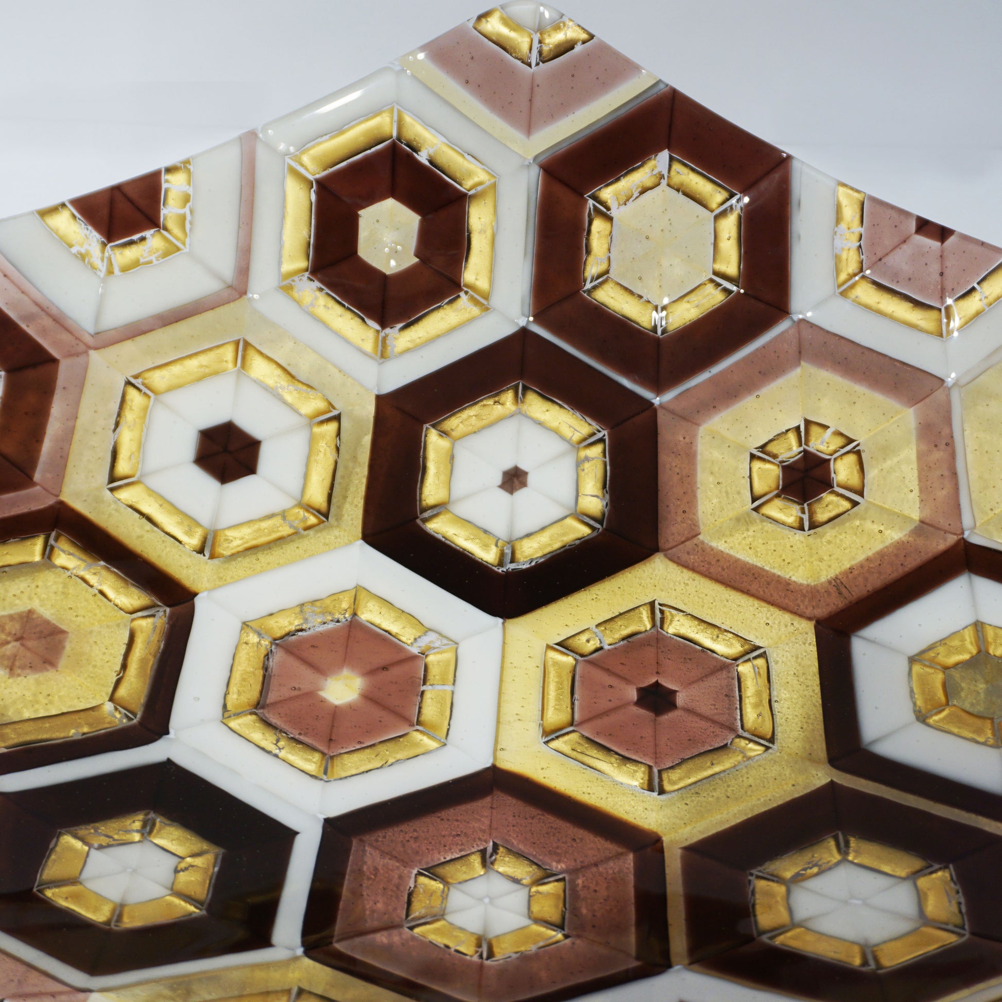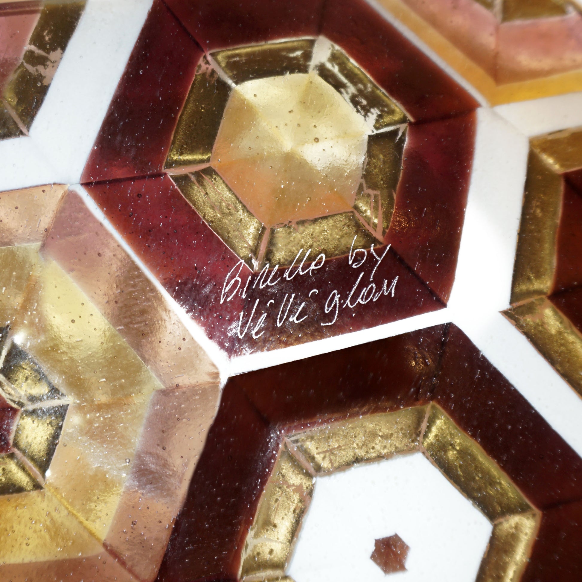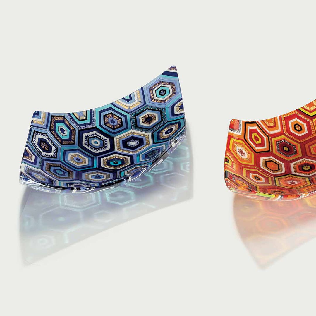 A true work of art, contemporary Murano glass centerpiece, a jewel-like creation, signed by Paolo Birello, the shape recalls the sail of a boat, because inspired by the Venice environment and the connection with the Marine element. The decor is with colored Murrine in purple amethyst, mauve, lilac tones, gold and ivory white, each little colored piece individually positioned with precision by hand in a geometric hexagon pattern, made precious by the use of pure gold leaf and metallic inclusions in 24 kt gold, high quality of execution using the sophisticated and difficult technique of glass fusion with a see-through mosaic of Murrine showing in transparency on the underside, making the reverse glass layer just as beautiful. These centerpieces are customizable in colors and sizes to requirements, they are individually handcrafted, therefore each is unique.