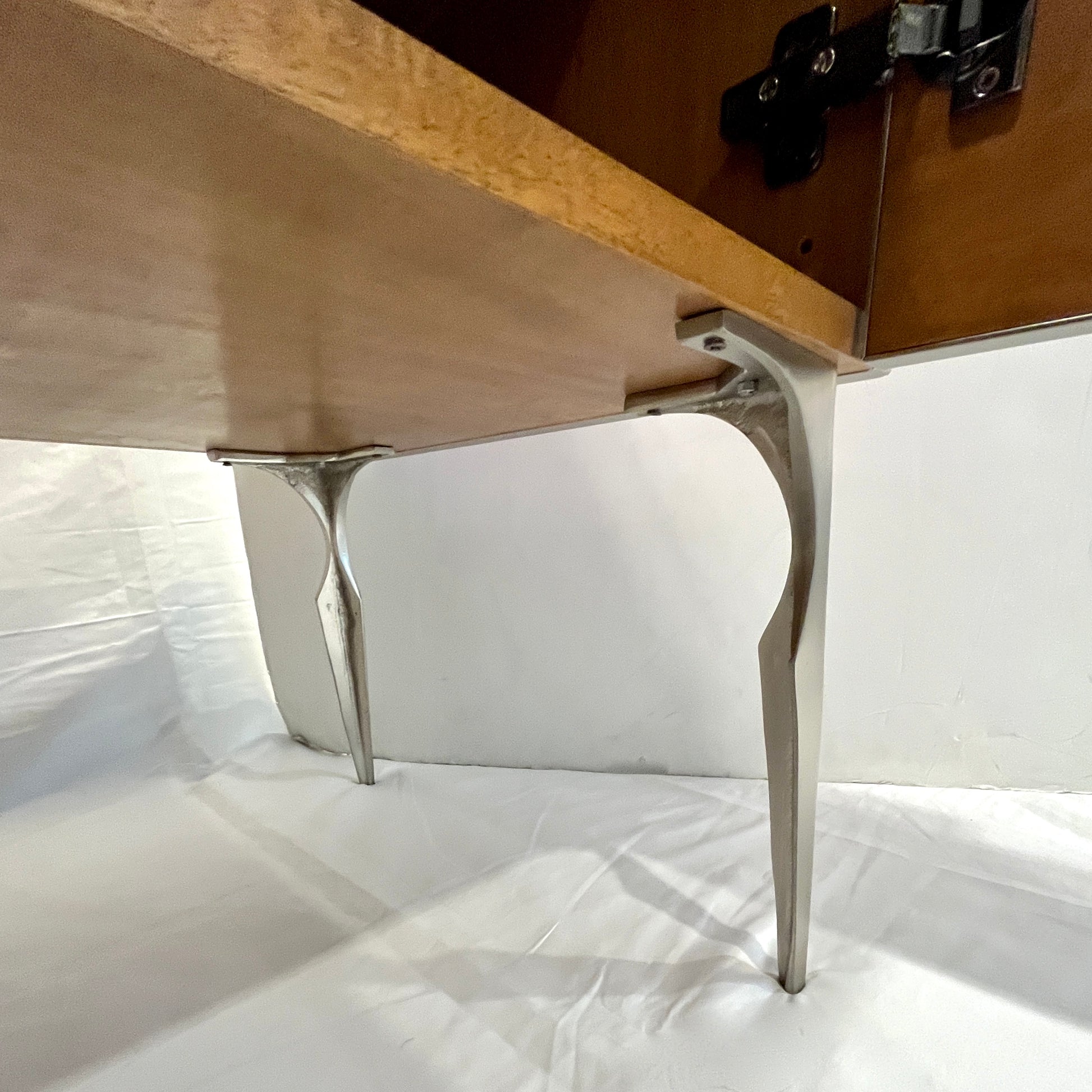High quality of execution with great attention to detail: the whole body and doors are exquisitely edged with satin nickel profiles, walnut interior with one shelf, or can be fitted as a dry bar with a curved glass shelf to accommodate bottles.