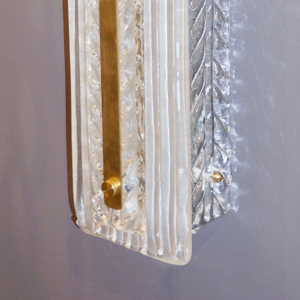 Very elegant Italian contemporary organic wall lights, entirely handcrafted in the style of Barovier & Toso in refined white and crystal clear Murano art glass, decorated in relief with an Art-deco design of vein leaf texture and enhanced by a striated white frosted glass front, highlighted by a handmade brass vertical band. Their tall and thin size makes them ideal for narrow spaces.