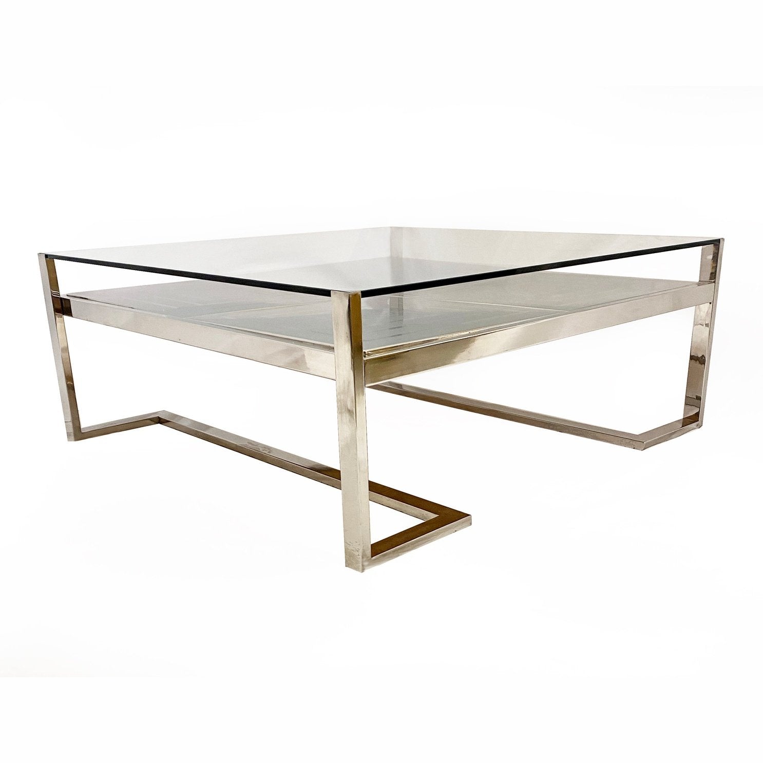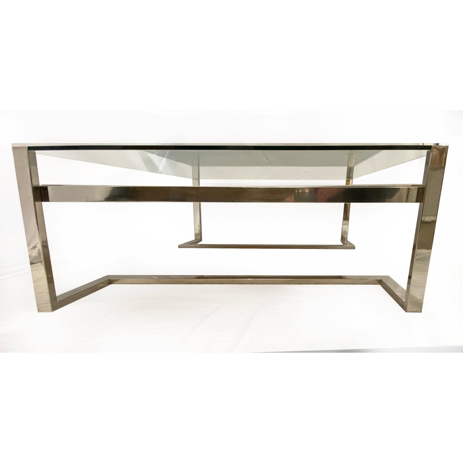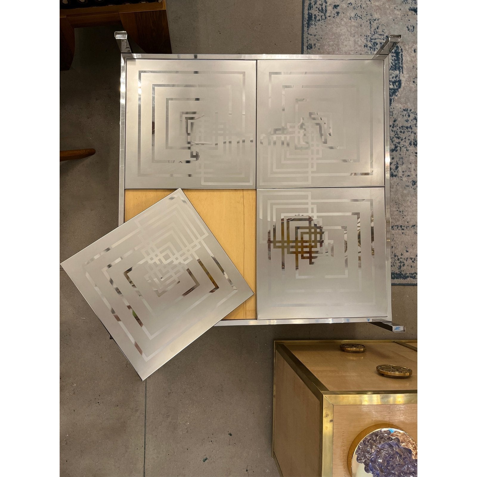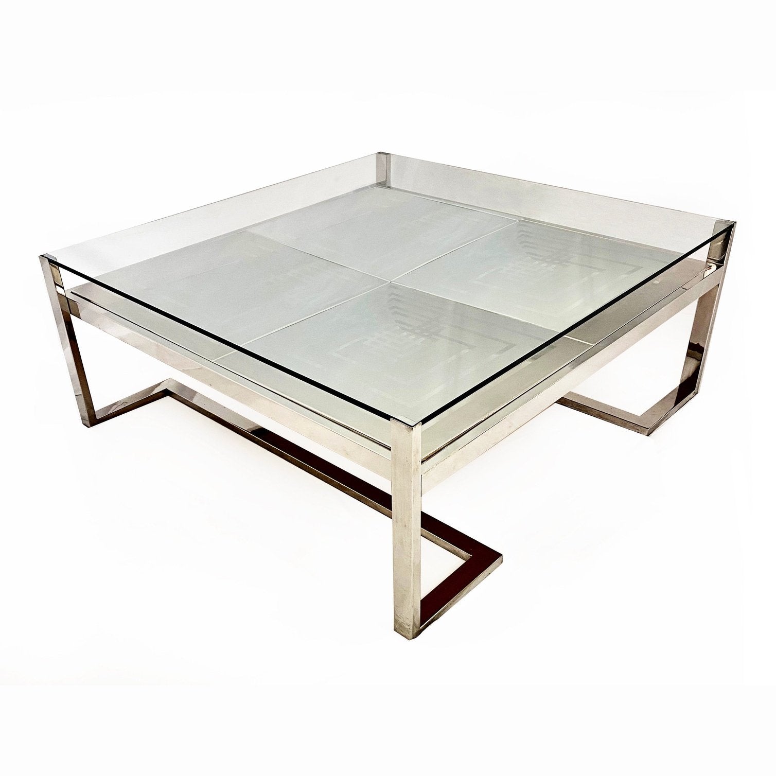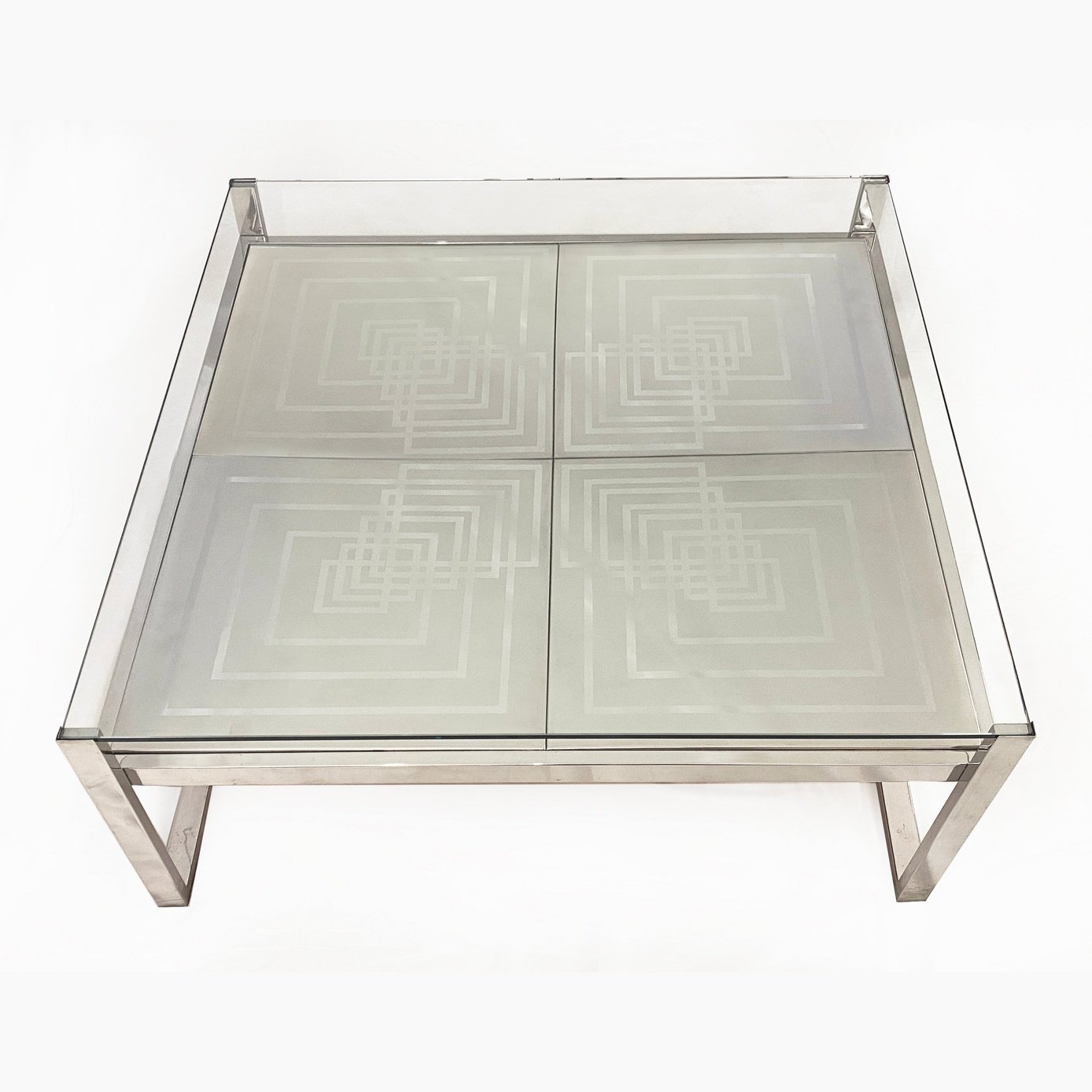 833PEIs there a piece missing to bring together your living room and you are a lover of minimalist design style? This Italian vintage double-tier center table will bring light into your space and artistic functionality. This signed piece of organic design by Romeo Rega is a modern Work of Art, with a top glass surface. The lower shelf is uniquely made of 4 polished nickel panels, inserted on its wood base, artistically designed with a stand-out contrasting mat and gloss decor in Escher style. The placement of the geometric pattern creates a 3-dimensional illusion. The sophisticated cut shape of the legs is typical of Romeo Rega's work with its minimalist light airy feel to allow light through.
