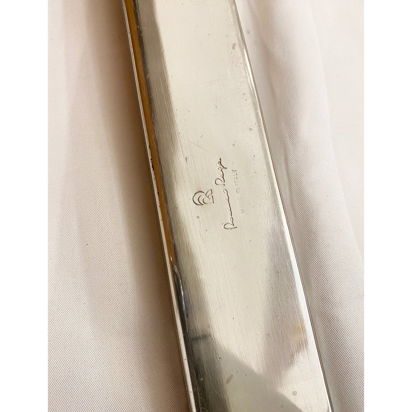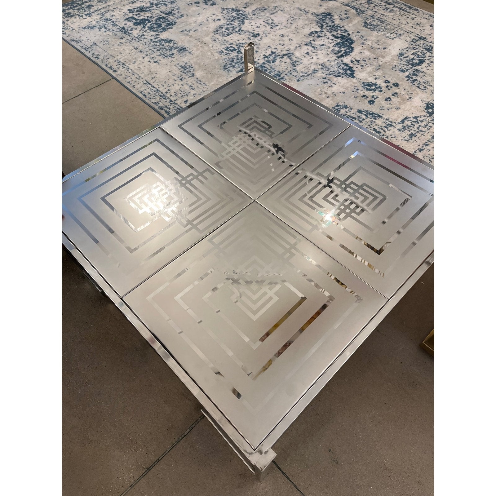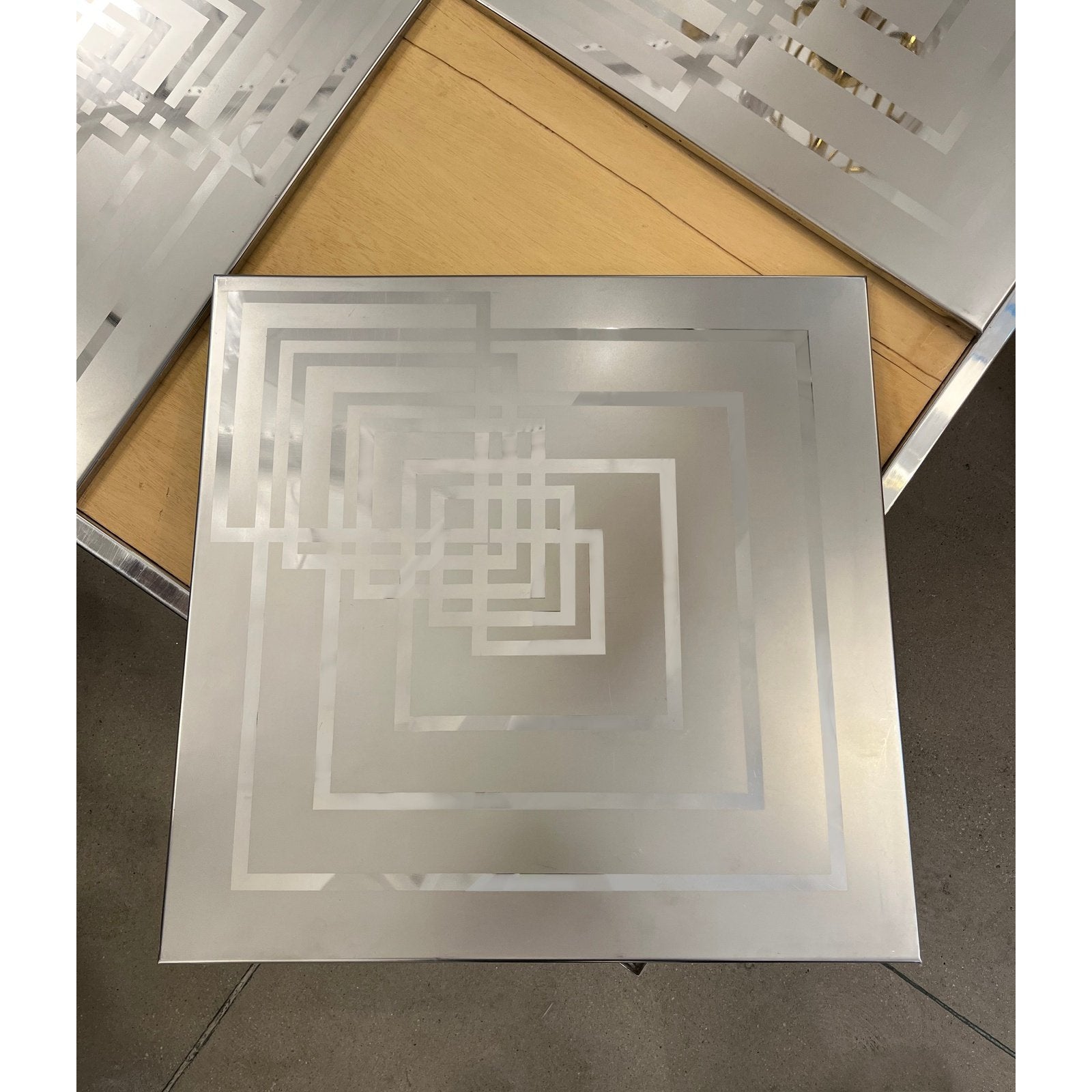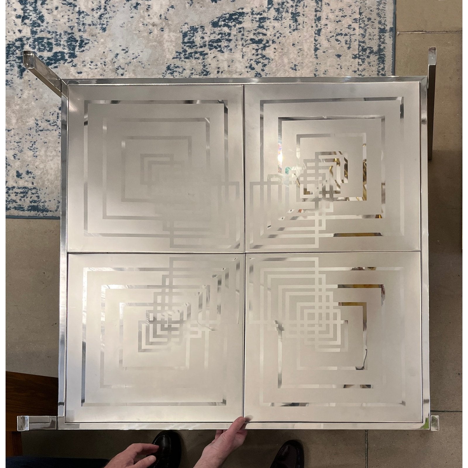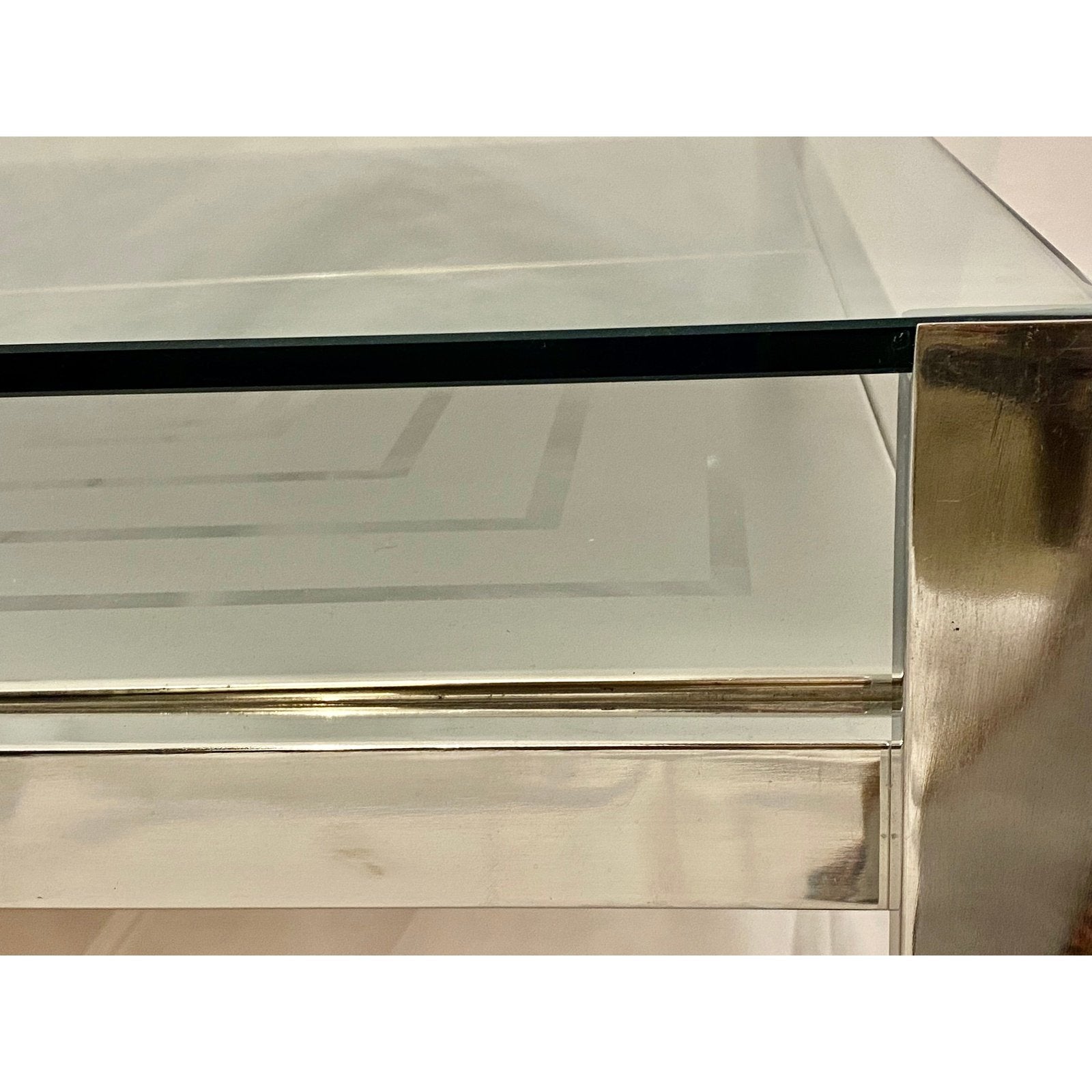 833PEIs there a piece missing to bring together your living room and you are a lover of minimalist design style? This Italian vintage double-tier center table will bring light into your space and artistic functionality. This signed piece of organic design by Romeo Rega is a modern Work of Art, with a top glass surface. The lower shelf is uniquely made of 4 polished nickel panels, inserted on its wood base, artistically designed with a stand-out contrasting mat and gloss decor in Escher style. The placement of the geometric pattern creates a 3-dimensional illusion. The sophisticated cut shape of the legs is typical of Romeo Rega's work with its minimalist light airy feel to allow light through.