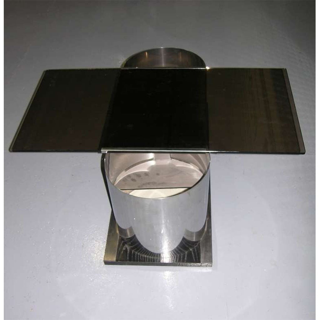An elegant coffee table/bar with a high quality tempered smoked glass top that swivels to reveal a lacquered interior inside two chrome cylinders. The interior can be used as a dry bar and functions as storage. The sculptural chrome base is set on a black cerused oak platform finished with a chrome edge.