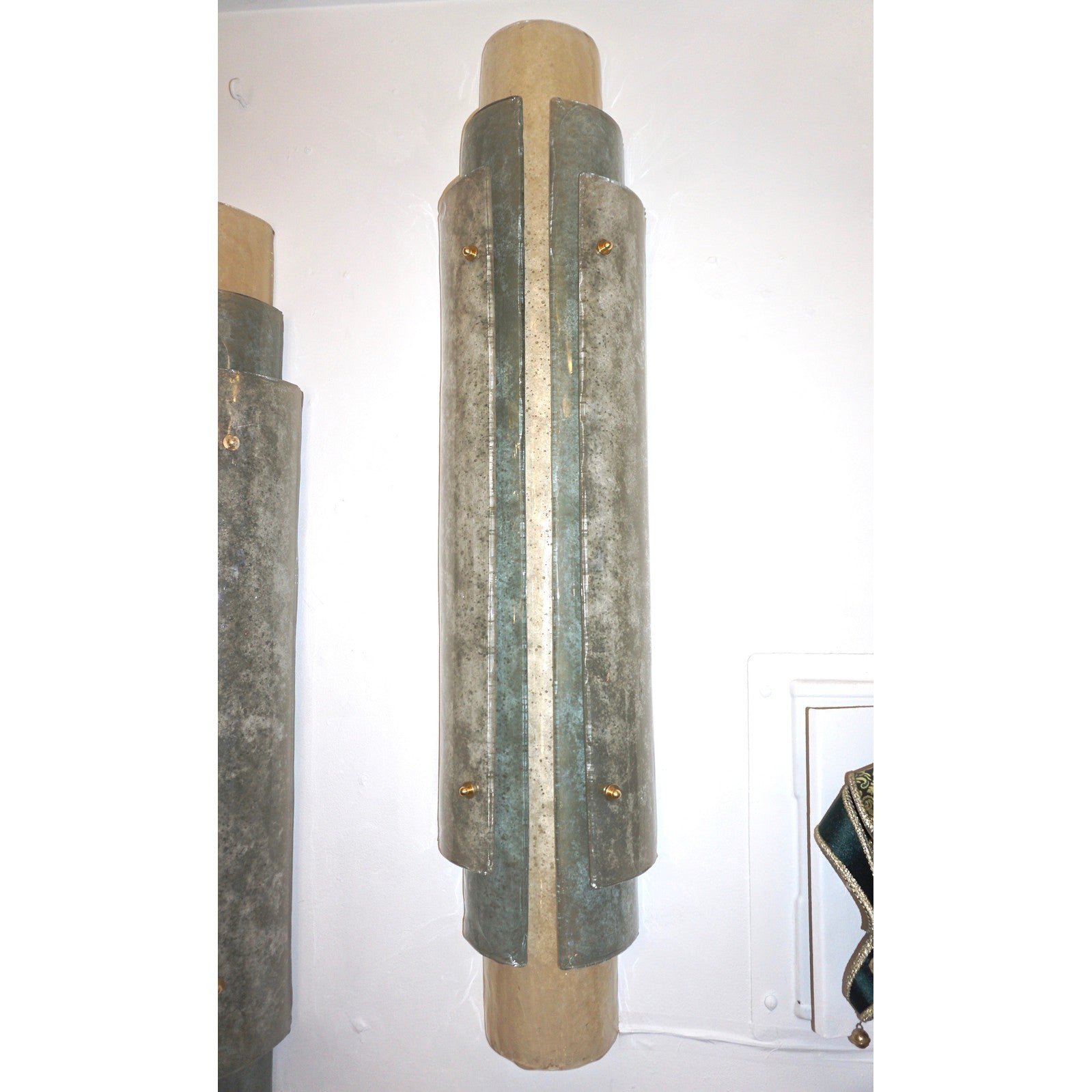 Late 1990s, a very elegant and refined urban design Italian sconce in blown Murano glass worked with the technique Scavo: the frosted glass has a finish similar to archeological ancient Roman glass findings. The size of these wall lights makes them a true statement, three varied glass layers in different tones: ivory white, blue and grey create an unusual exceptional grand design. Can also be mounted as a flush mount.