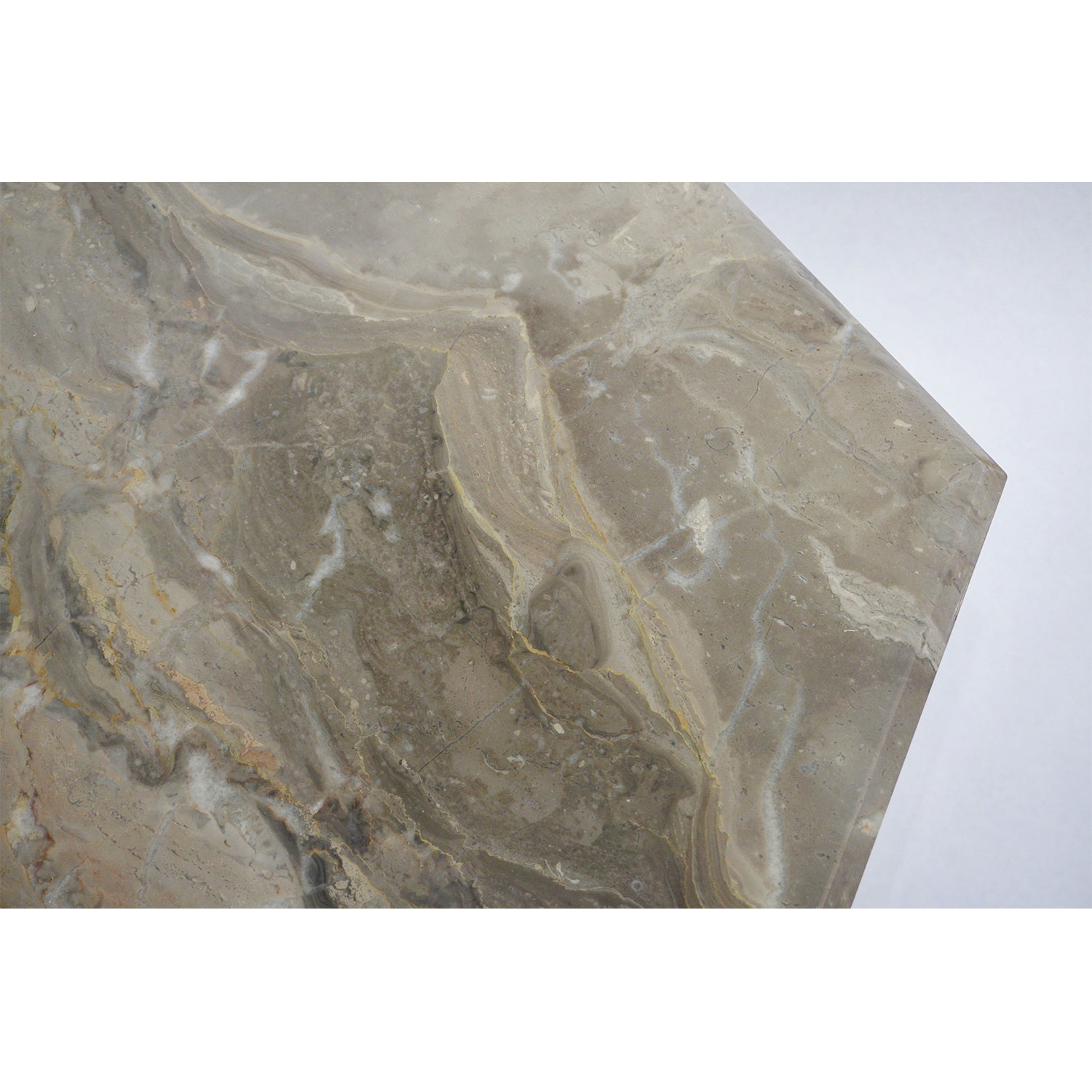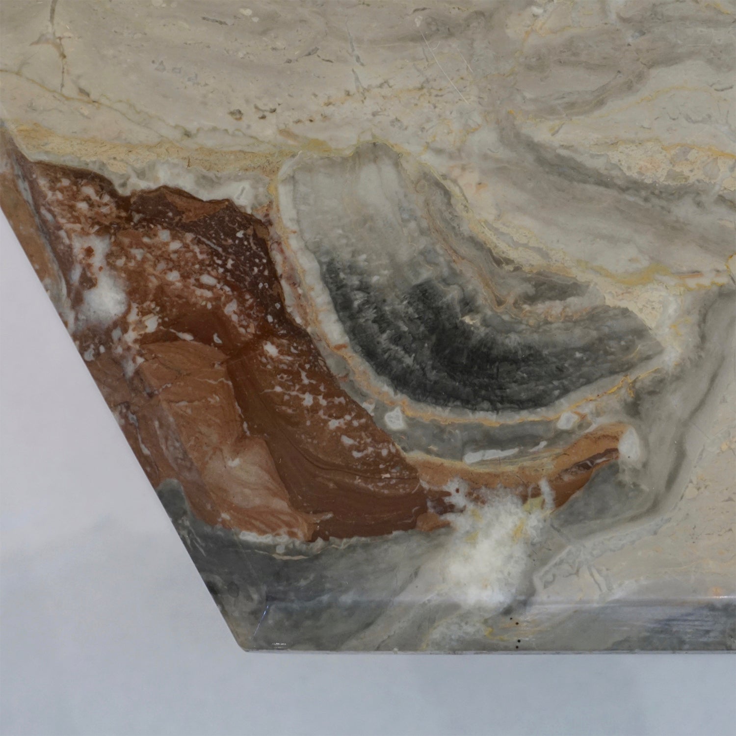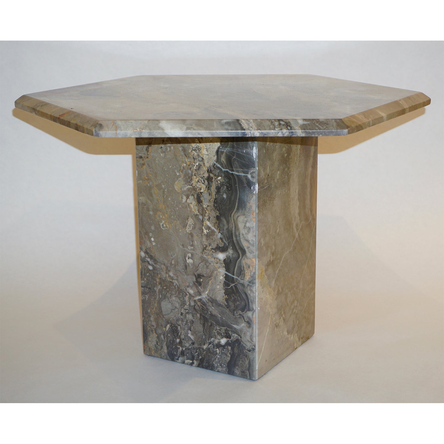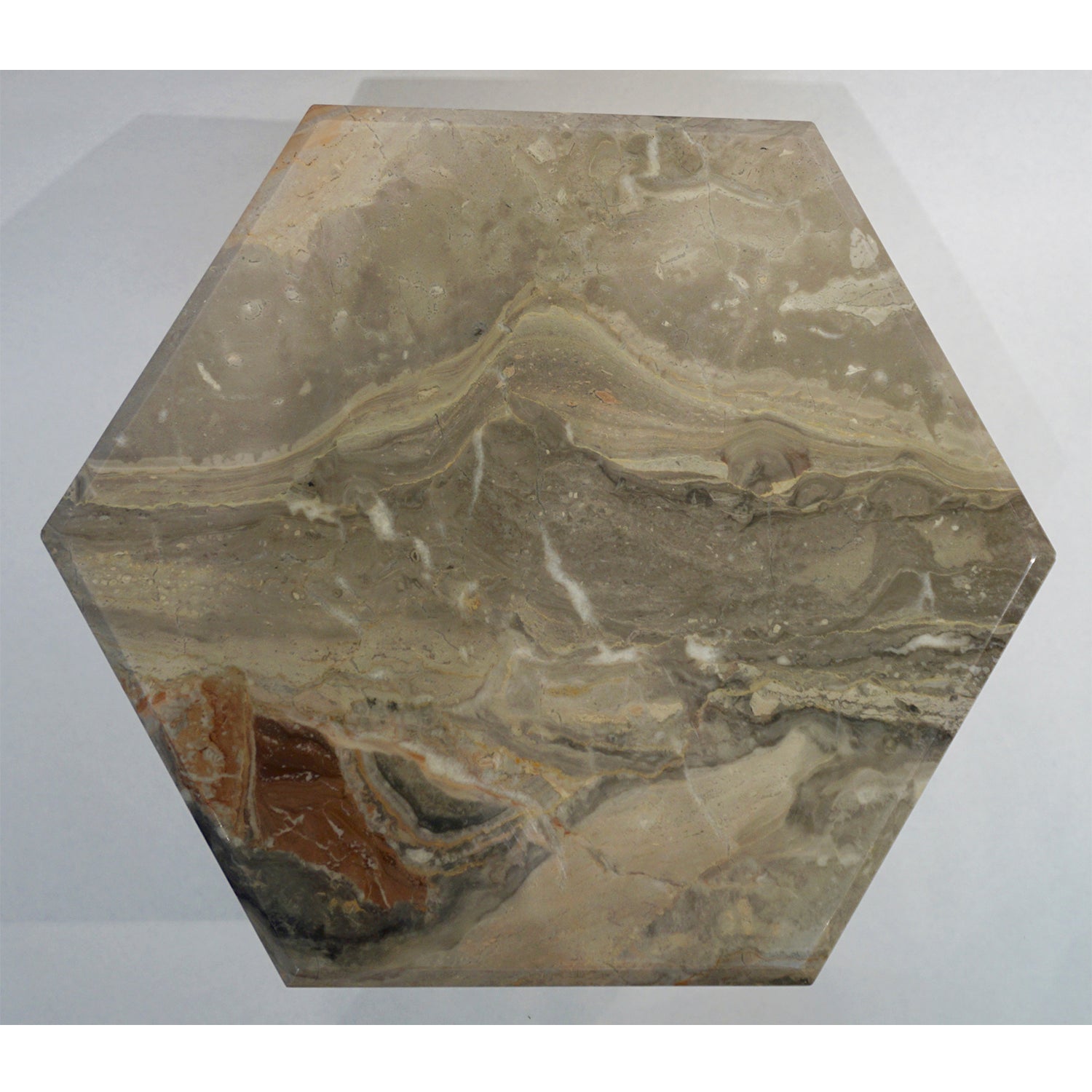 1970s Italian design 3 geometric nesting tables with gradient height, entirely handmade in warm Italian Arabesque Orobico marble, a graphic pattern of sweeping colors in dark and light grey, rust orange brown and red with white and gold veins. The organic design is enhanced by a high quality of construction: the rich hexagonal tops are handcrafted with beveled edges, supported by square base pedestals. Can be purchased individually.