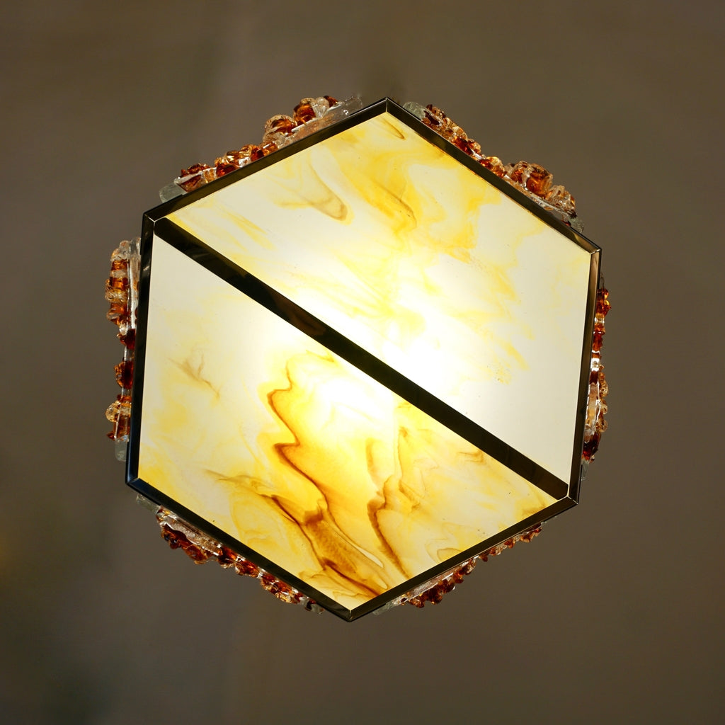 A rare Italian Design Mid-Century Modern chandelier by Mazzega, the nickel structure has a geometric hexagonal shape, repeated in the canopies, with 6 airy organic side panels in crystal clear and orange Murano glass worked in filament fretwork, a difficult technique that not only gives an exceptional 3D texture but also allows more light to sip through and uniformity, the bottom is closed by a frosted streaked Art glass in yellow and terracotta colors that suffuses the light source and creates ambiance. The overall height of the central support with 3 poles can be shortened to obtain a more flushmount lighting fixture.