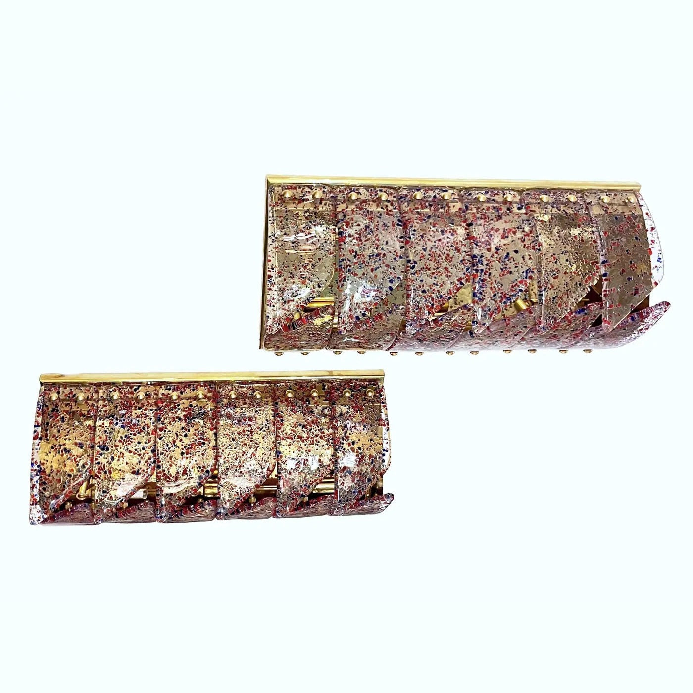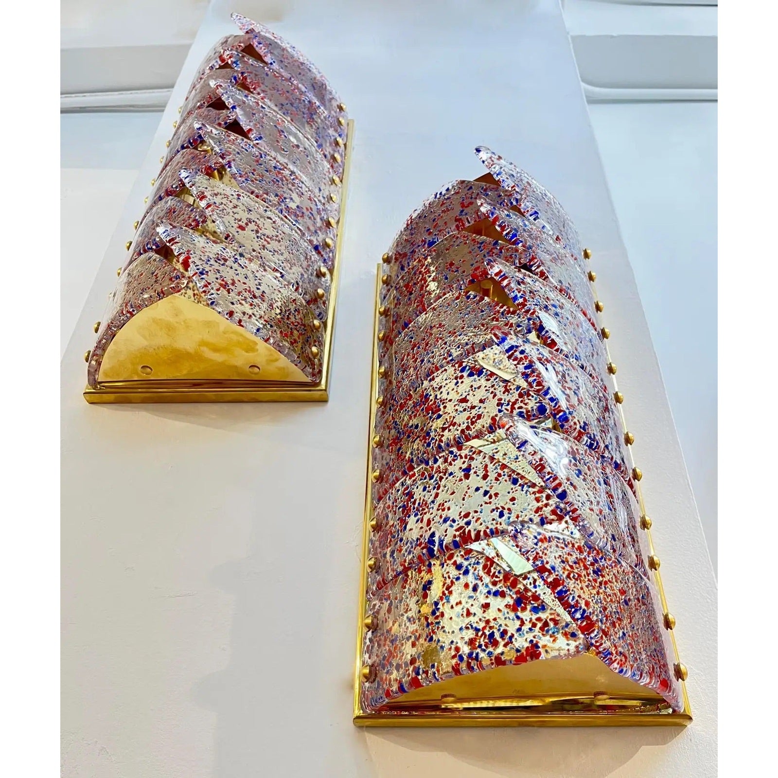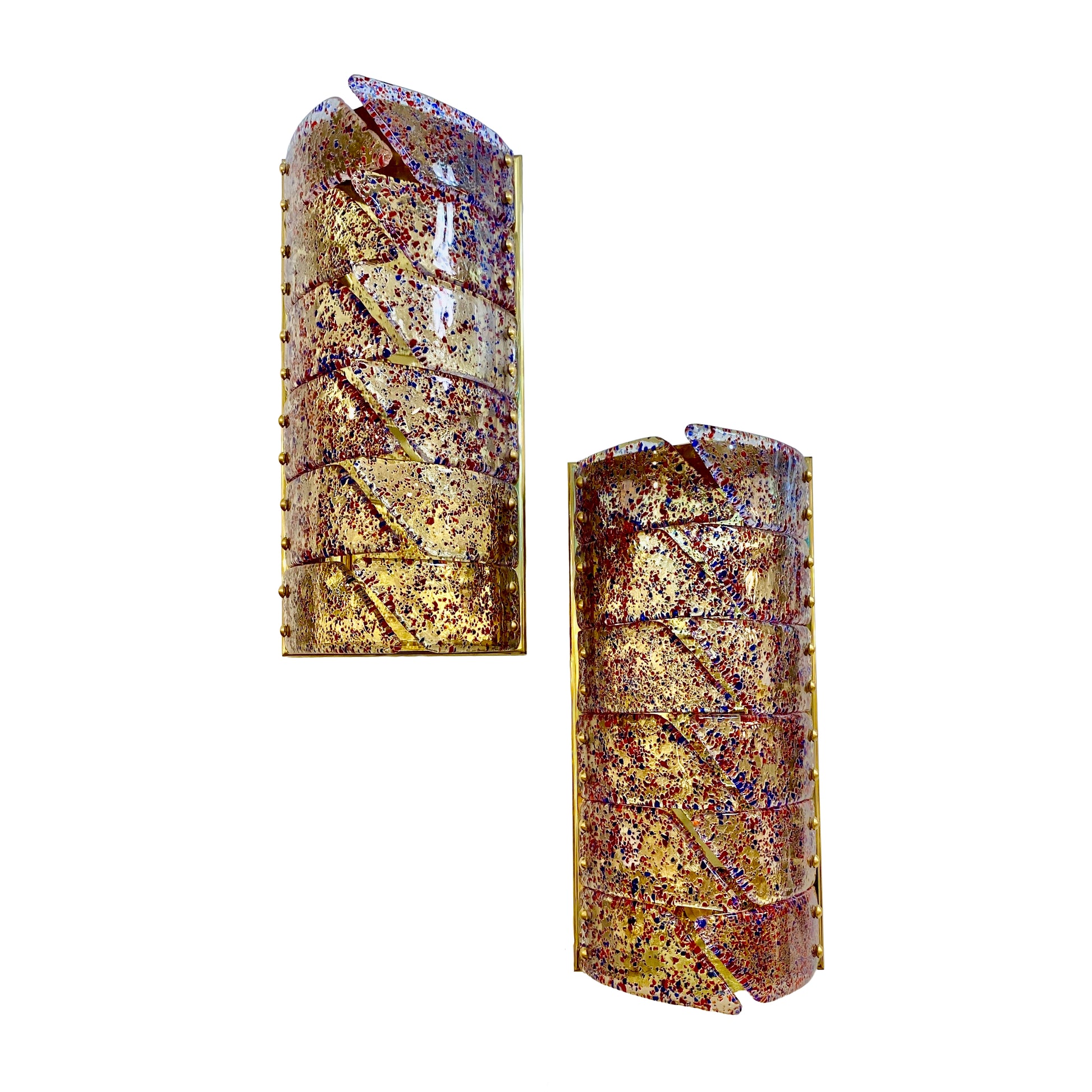 Mid-century modern Murano glass Italian Design artistic pair of organic wall lights or Flushmounts, composed of new handmade rectangular brass structures with vintage crystal clear Murano glass curved panels interlocking in the middle, attributed to Mazzega Murano, infused with fuchsia red and blue confetti murrine, creating a dynamic play of color and texture. The glass is richly detailed with tactile, slightly raised surfaces and an organic, semi-molten flow that echoes the hand-blown technique. Each sconce has 12 overlapping, curved glass segments, 6 on each side, fixed on the brushed and polished brass backplate through evenly spaced domed brass studs. The layering and open overlaps create dimensionality and softly diffuse light through the vibrant composition, giving off a radiant amber glow when illuminated.