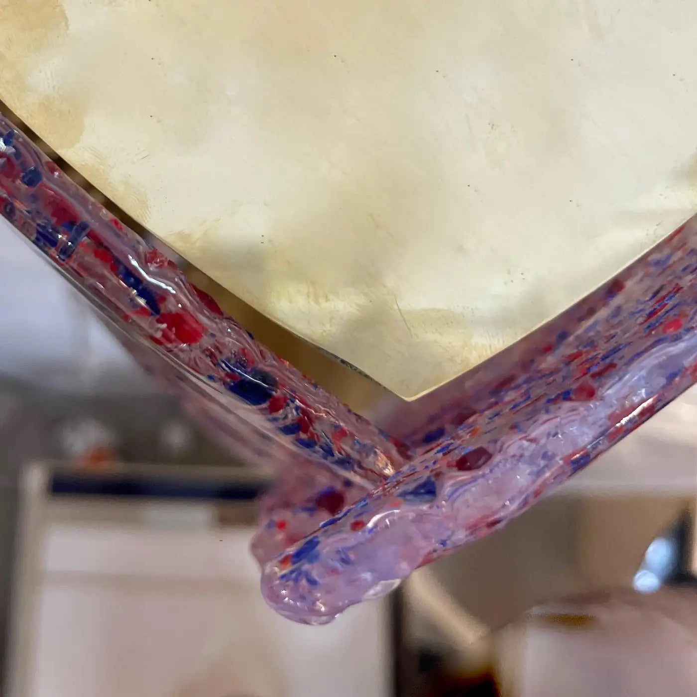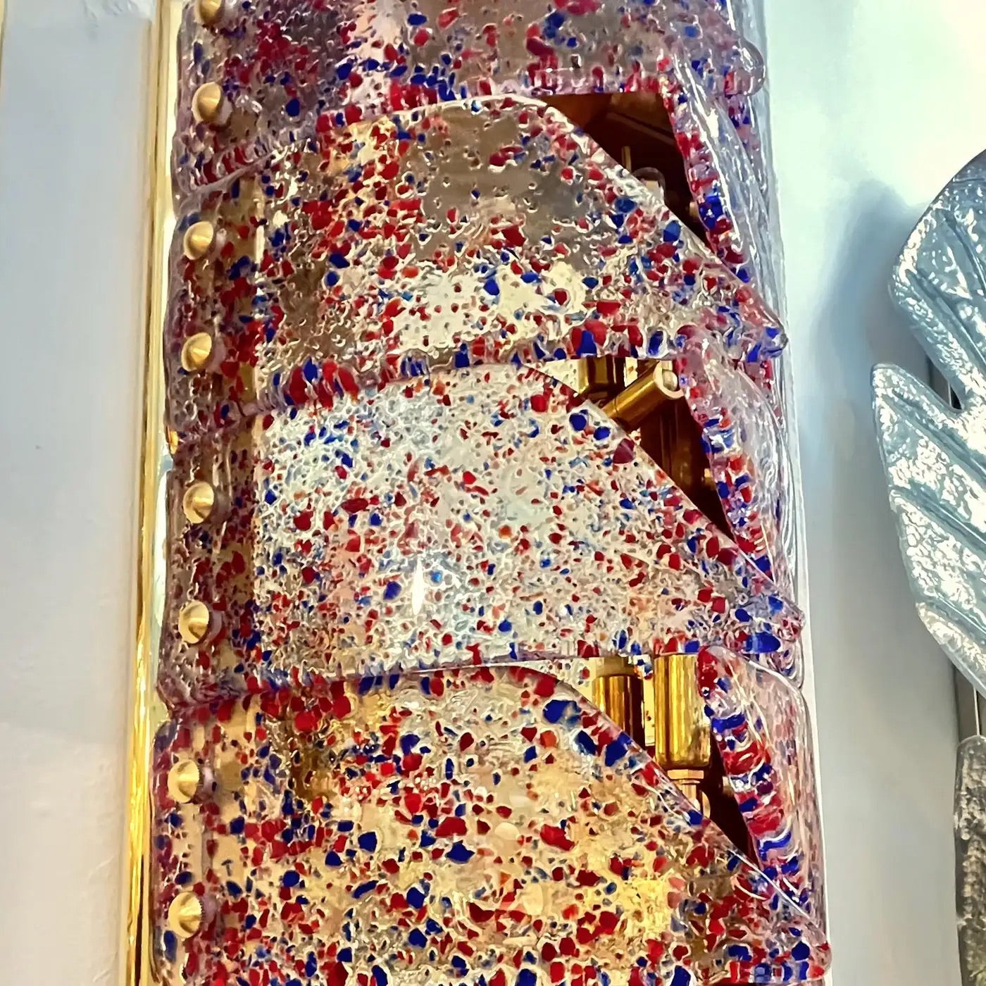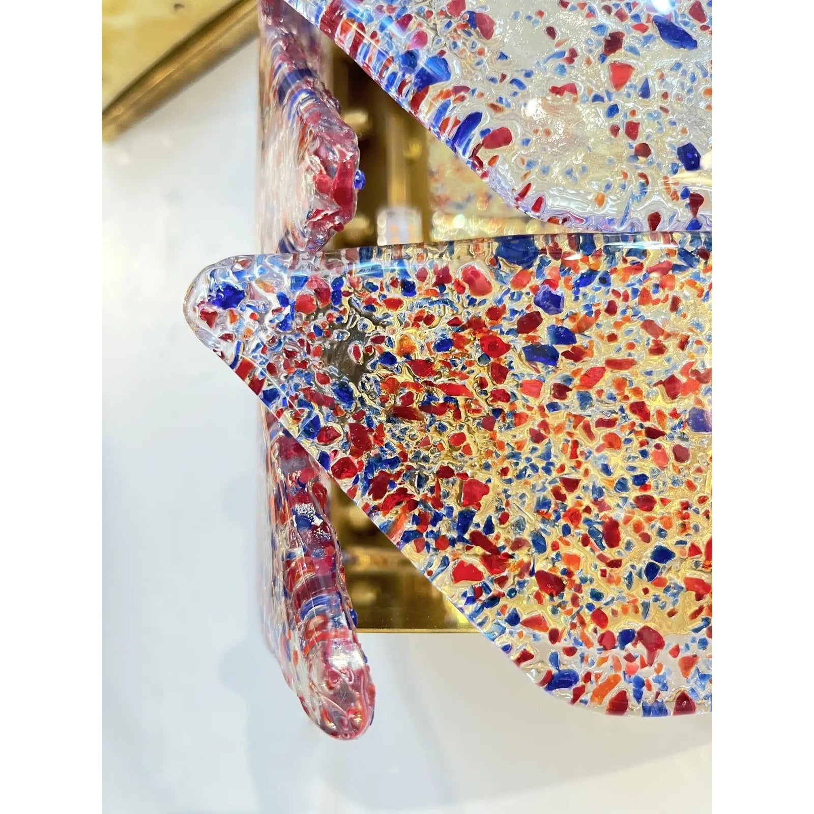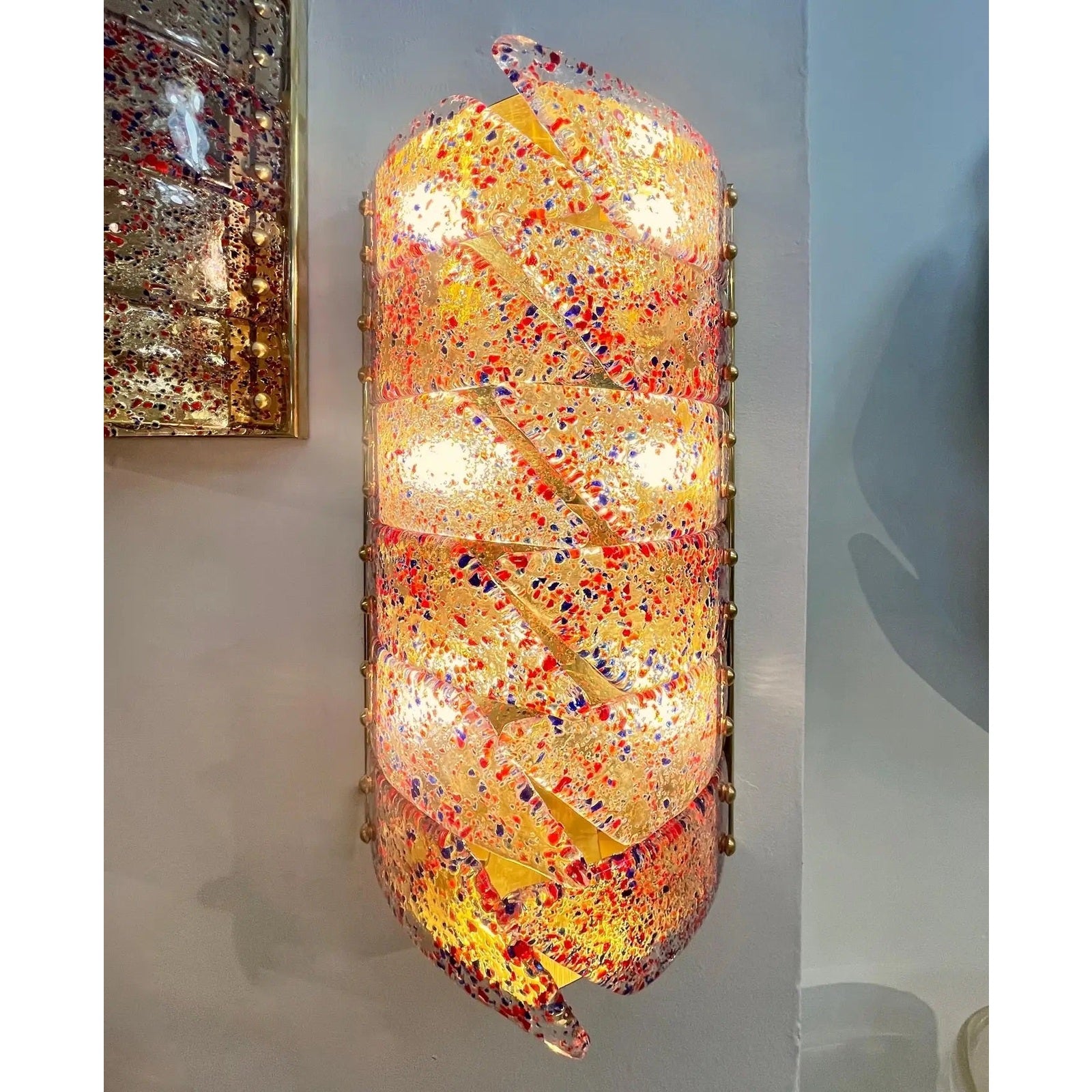 Mid-century modern Murano glass Italian Design artistic pair of organic wall lights or Flushmounts, composed of new handmade rectangular brass structures with vintage crystal clear Murano glass curved panels interlocking in the middle, attributed to Mazzega Murano, infused with fuchsia red and blue confetti murrine, creating a dynamic play of color and texture. The glass is richly detailed with tactile, slightly raised surfaces and an organic, semi-molten flow that echoes the hand-blown technique. Each sconce has 12 overlapping, curved glass segments, 6 on each side, fixed on the brushed and polished brass backplate through evenly spaced domed brass studs. The layering and open overlaps create dimensionality and softly diffuse light through the vibrant composition, giving off a radiant amber glow when illuminated.
