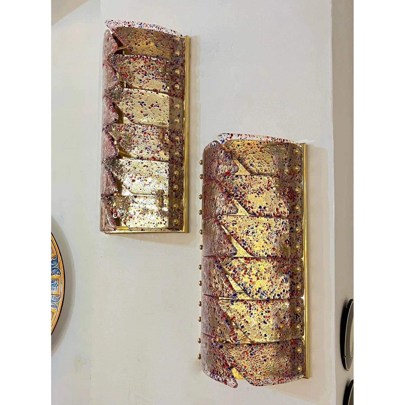 Vintage Italian Pair Polychrome Pattern Murano Glass Brass Sconces Flush Mounts