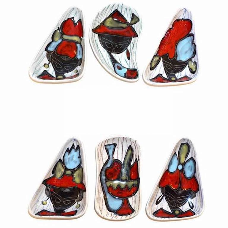 A rare set of six 1950s Italian Porcelain decorative dishes by a Ceramic Studio in Ravenna, each individually handcrafted in different attractive organic geometric shapes, oval, triangular, rectangular and tear-drop shape. Each hand-painted decor is different: fruit bowl, female portraits with various hairdos in bright enameled colors on lined white backgrounds, in perfect condition.