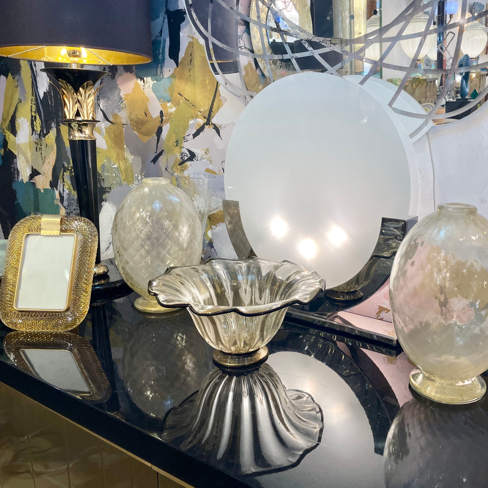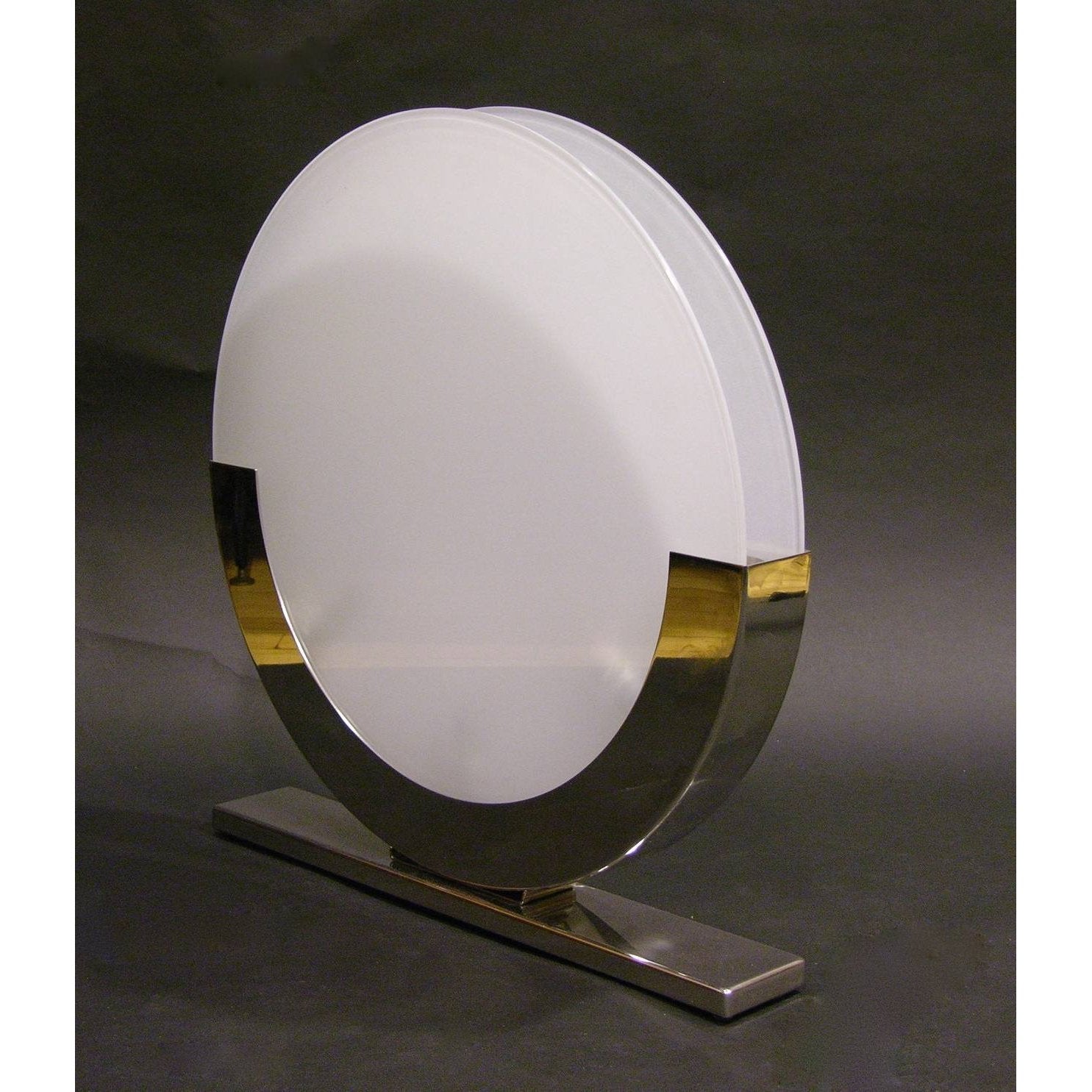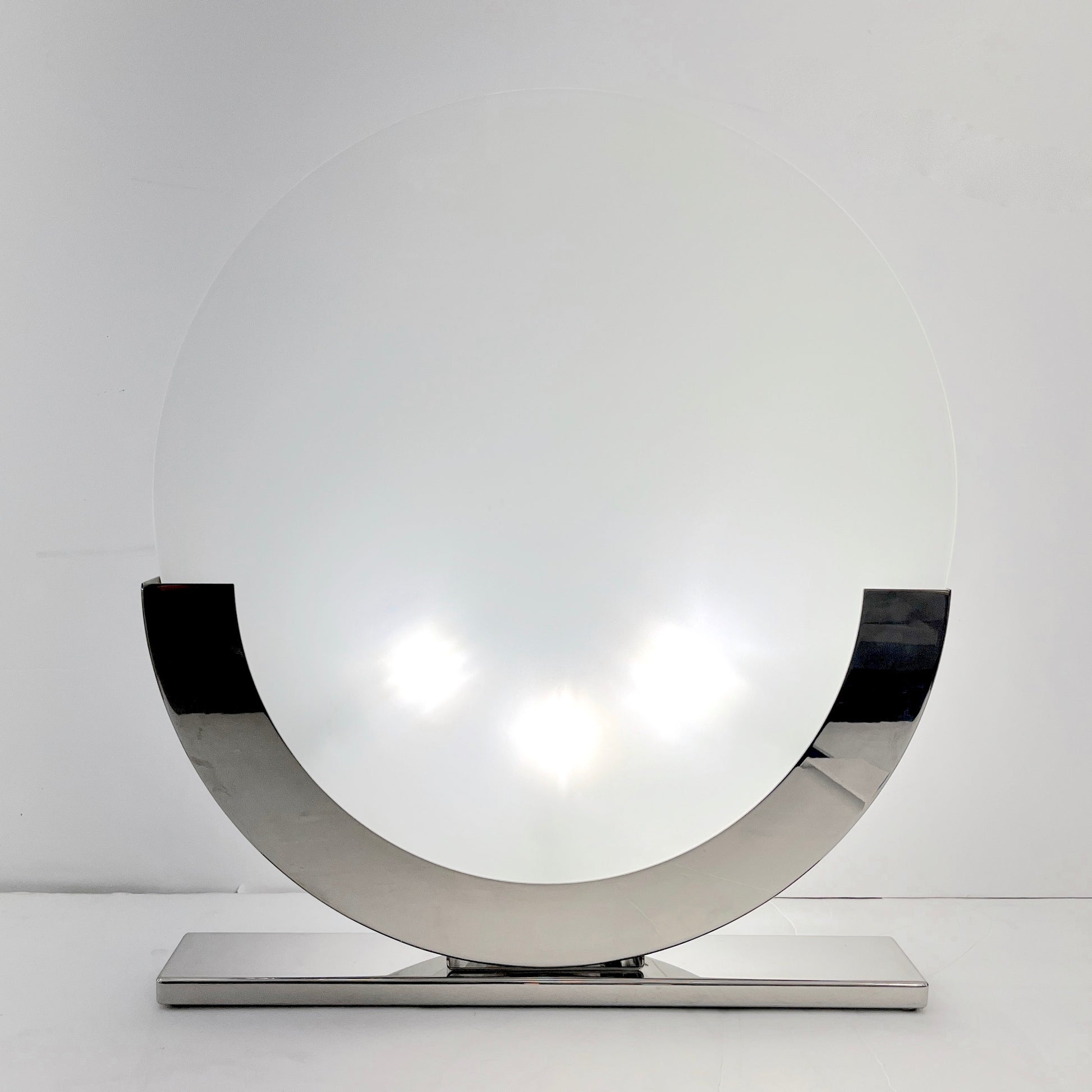 1990 exclusive Italian design lamp manufactured in Milan by a Company closed in the early 2000s, the Minimalist construction gives great elegance with its simplicity and uniqueness: Two high-quality frosted glass disks slide in a crescent-shaped chromed support (containing three sockets) raised on a chromed stylish sleek base. The craftsmanship is superb with exquisitely rounded-edged glasses and the use of excellence in the materials.