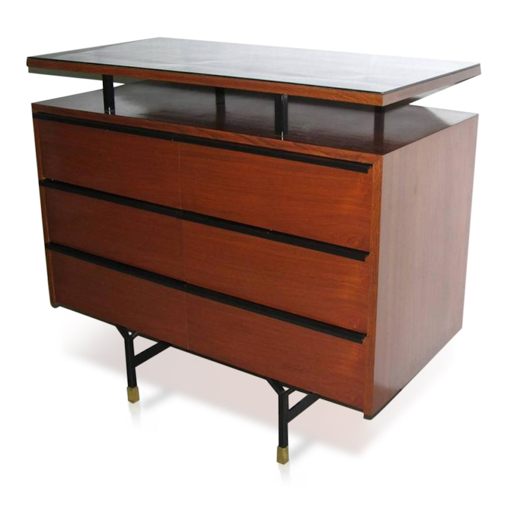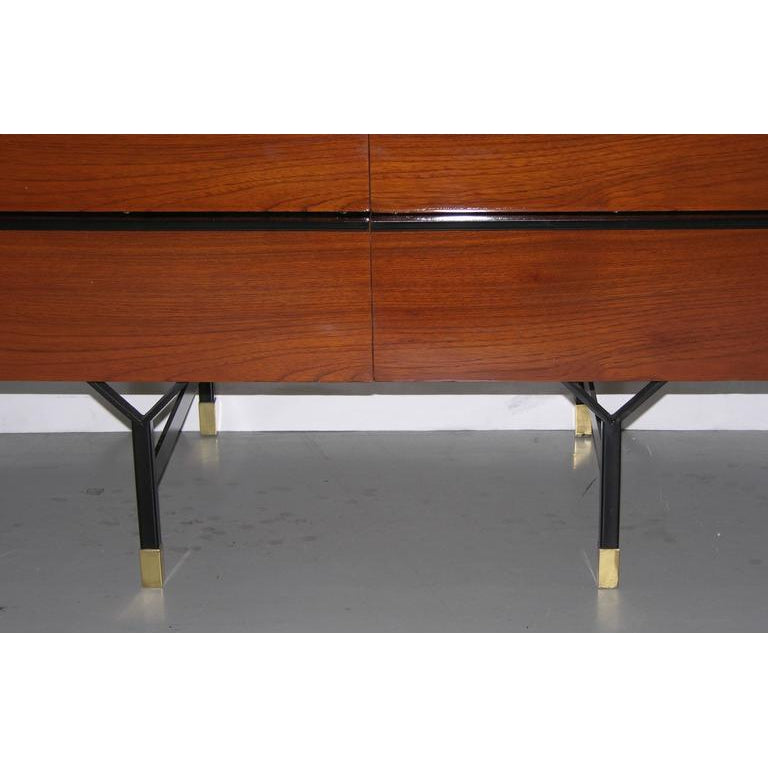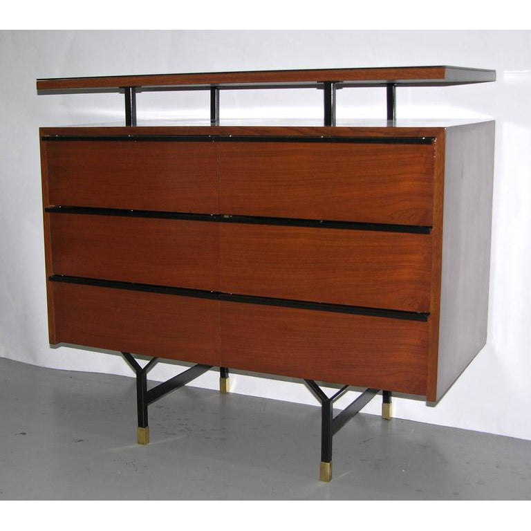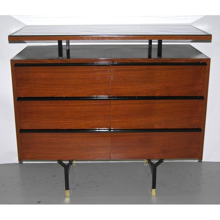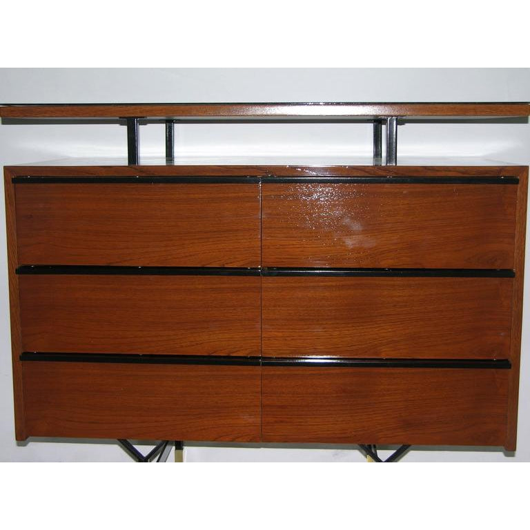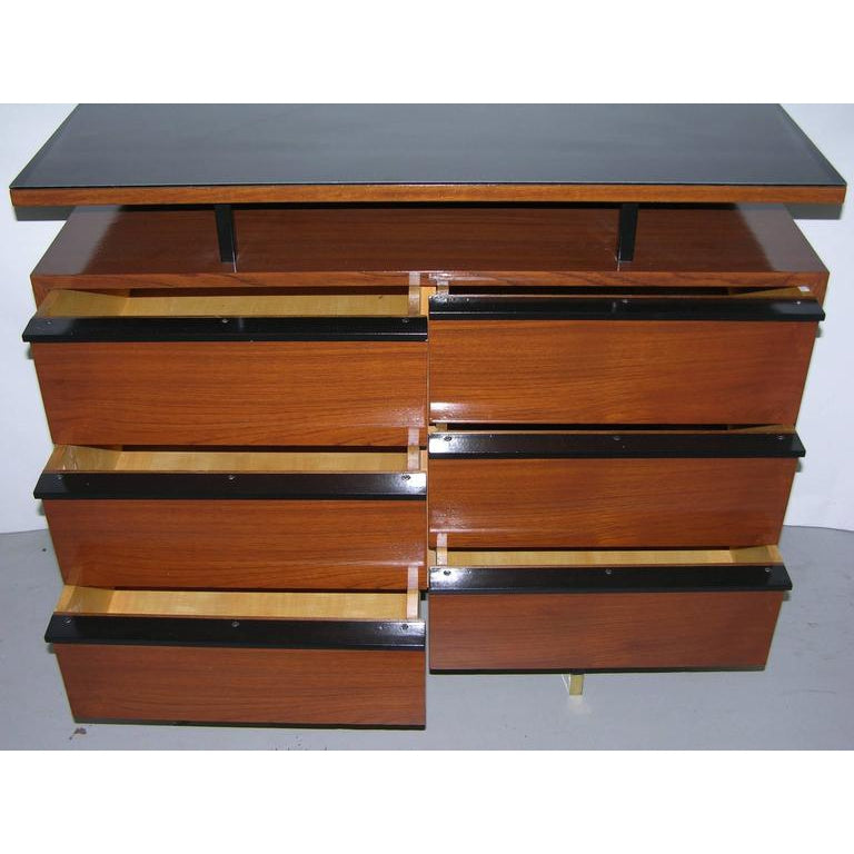 Sleek modern functional design for this six-drawer dresser finished in high-quality teak wood veneer on sling shaped black lacquered metal legs with a brass foot. The black metal lines on the front cleverly perform as geometric outlines and as handles, the black glass covered top offering an open tier for additional open storage raised on metal supports. This is a midcentury design stylish small sideboard/dresser that combines modernity and practicality.